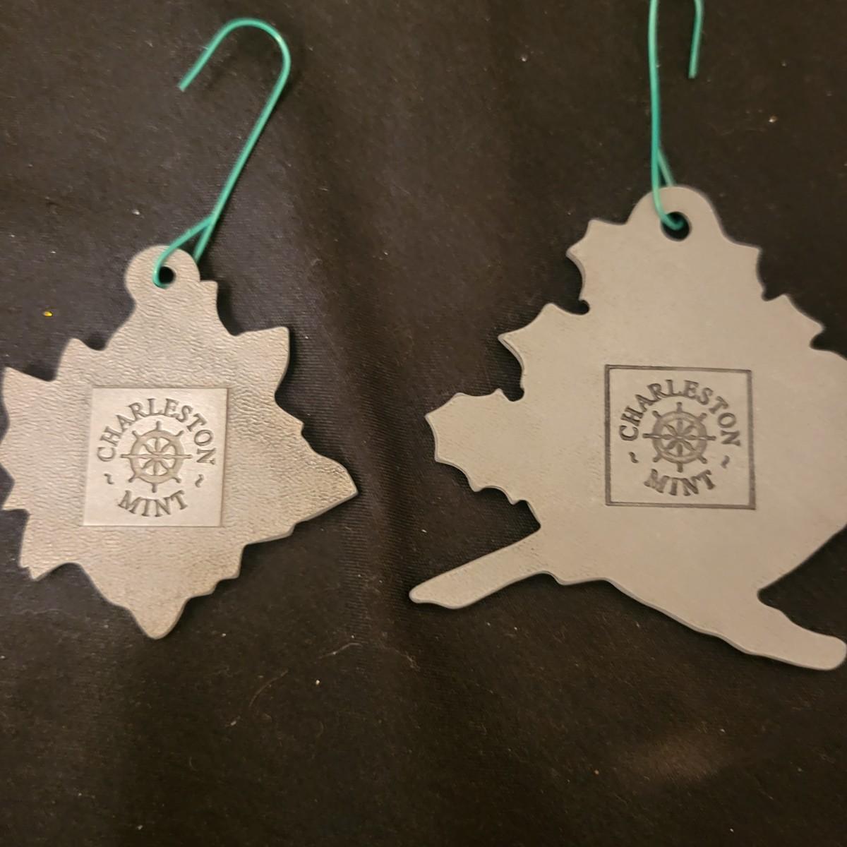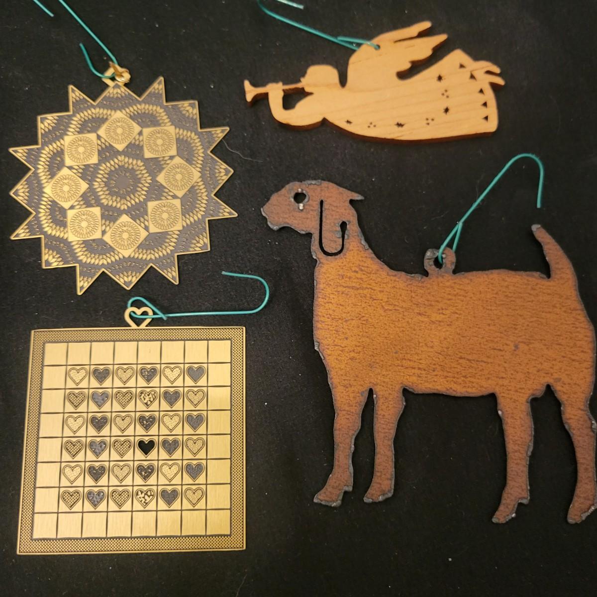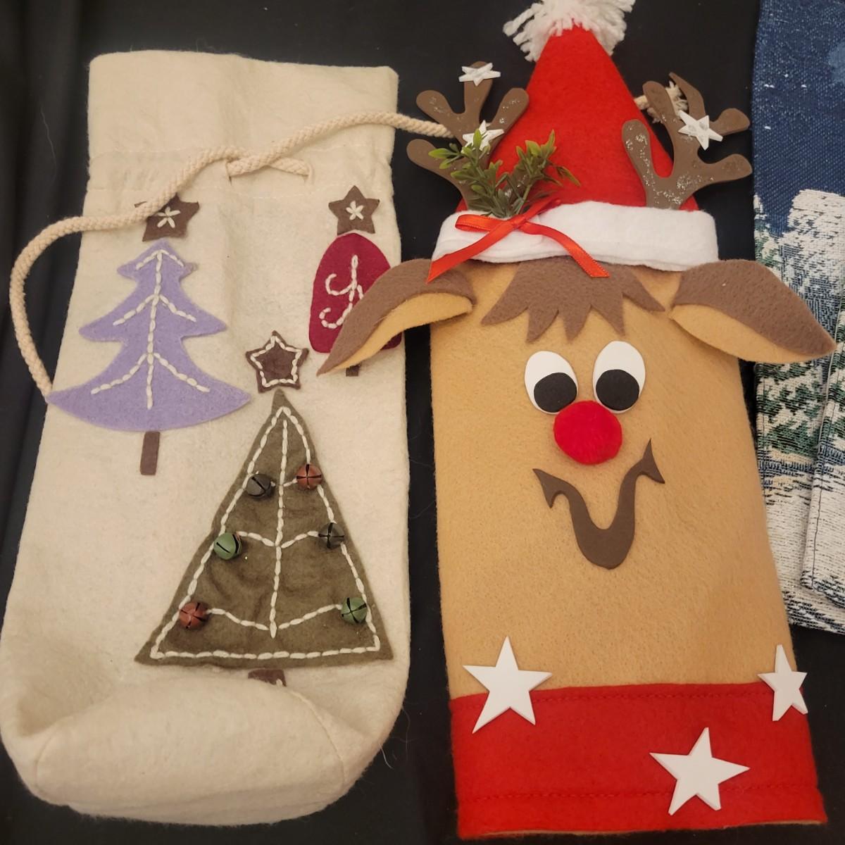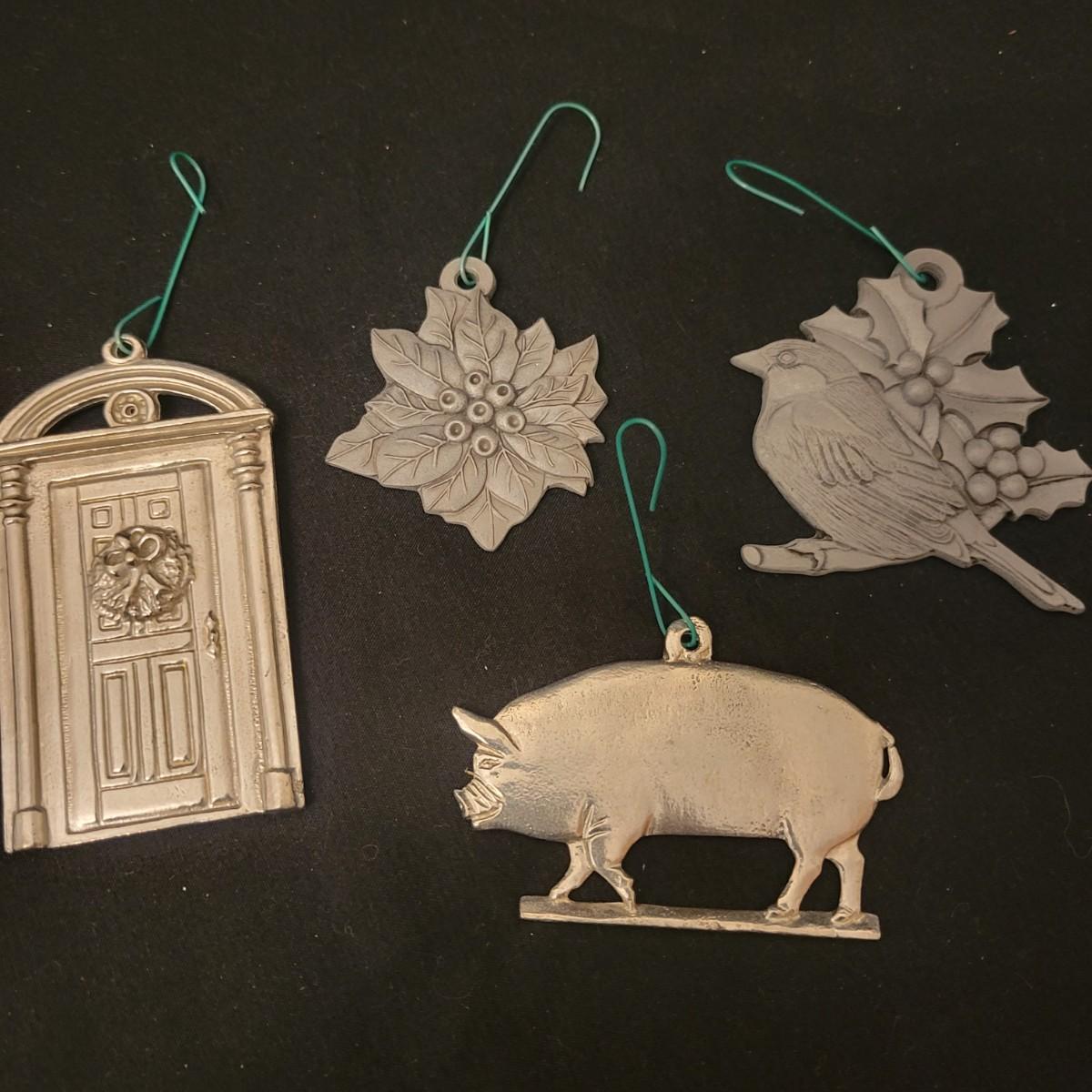 An assortment of Christmas decor in good condition. Included are four place mats, two votive candleholders, a small crystal glass, a tin platter, two wine bottle covers, a primitive Christmas Tree, an assortment of ornaments and a wrought iron Christmas Tree. Wrought iron tree measures approximately 17.5" x 20". Shipping available. Shipping can be costly please call UPS store at 828-252-6930 for estimate