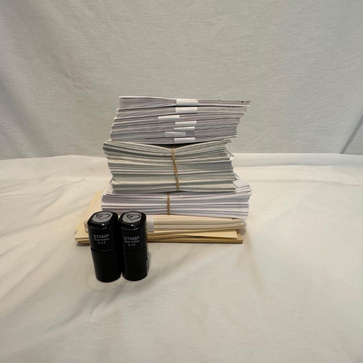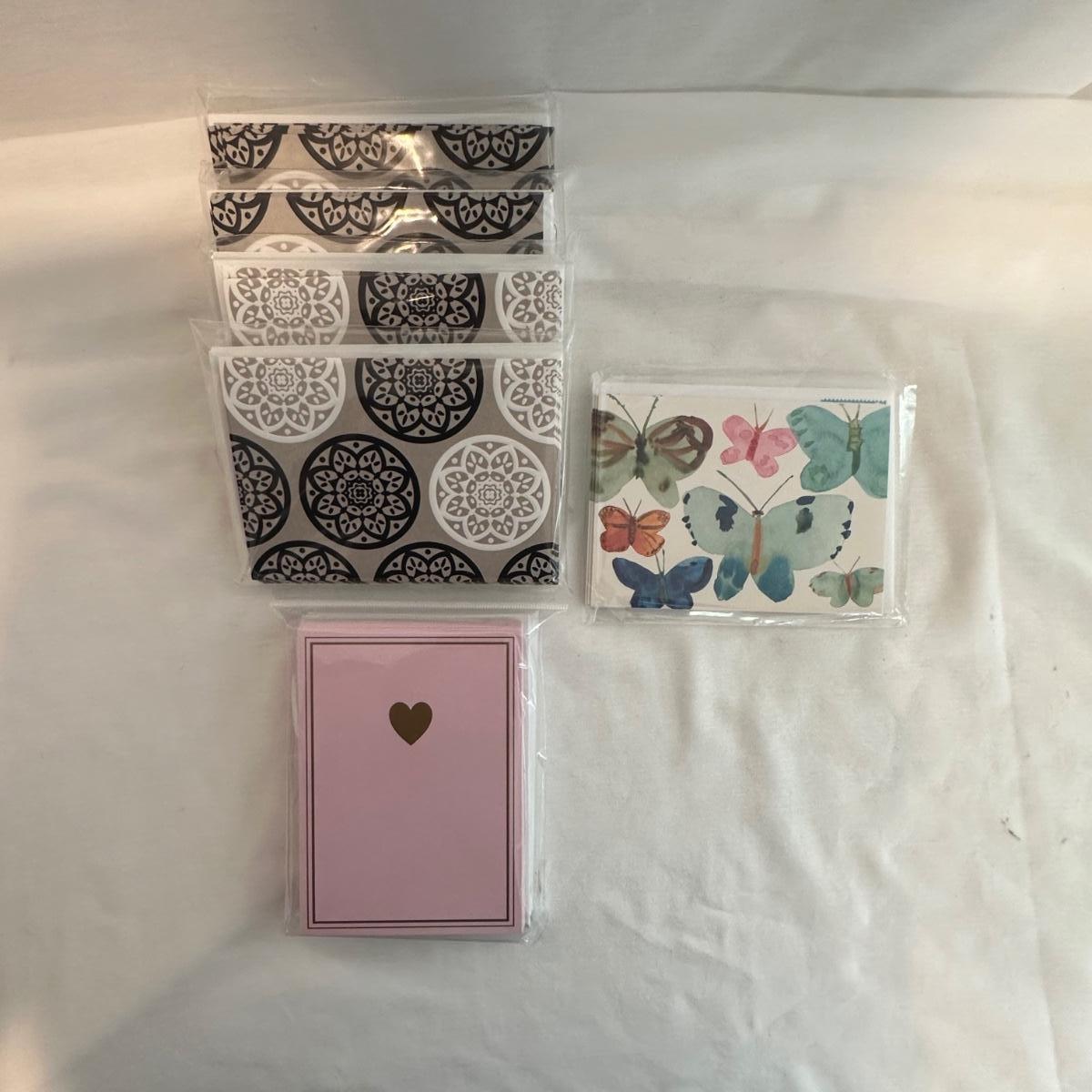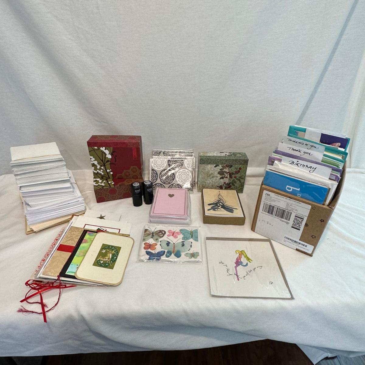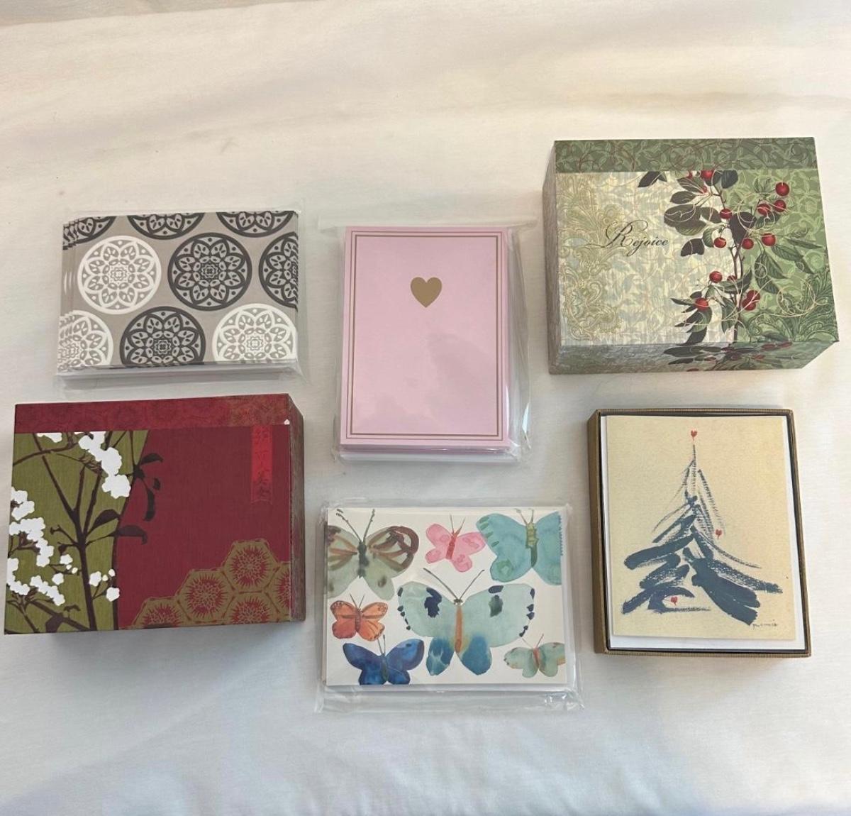 Boxed note cards and Christmas cards and an assortment of Thinking of You, Get Well, & Thank You notes. Includes extra empty blank envelopes and two ink stamps of hearts with paw prints. Shipping available.
