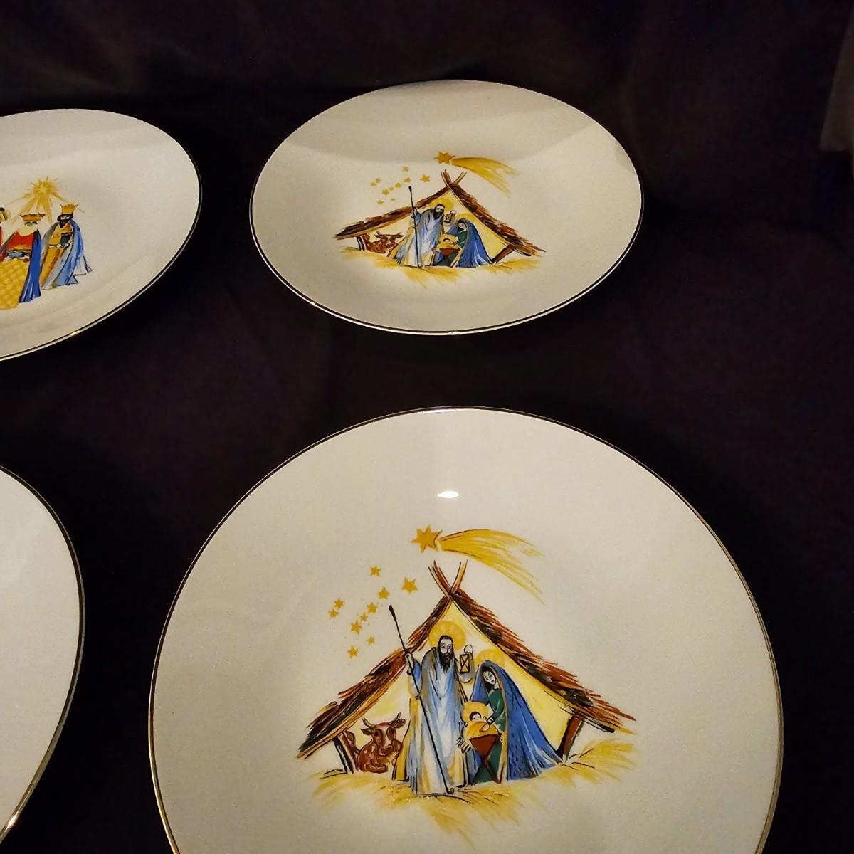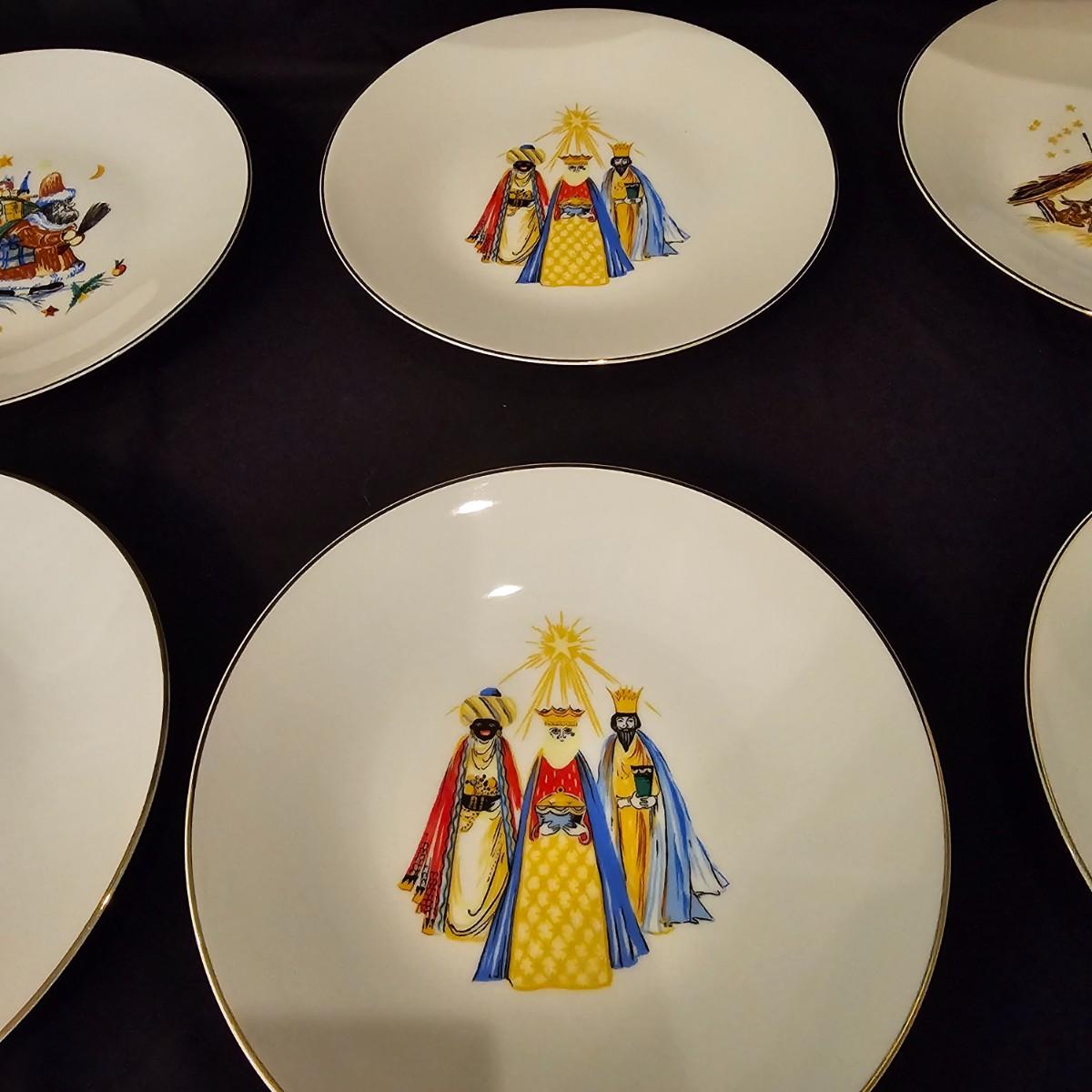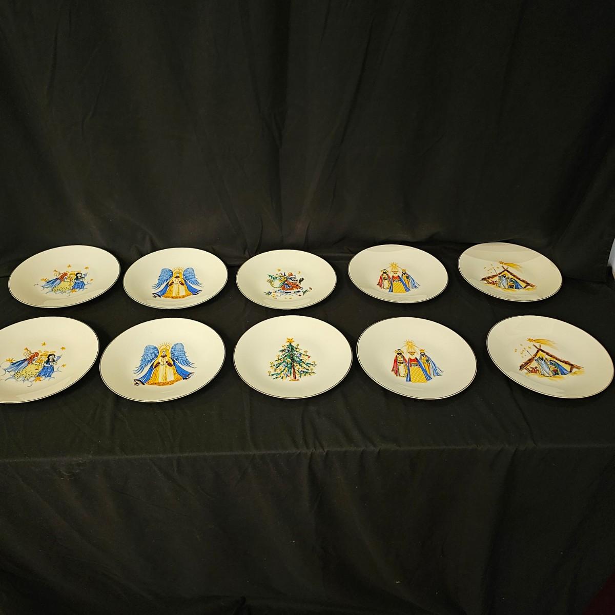 Ten 10" D Christmas theme plates from Germany. Two each of four different images and two single images, all porcelain with gold rims, made by Hutschenreuther of Honenberg. See photos for details. Shipping available.