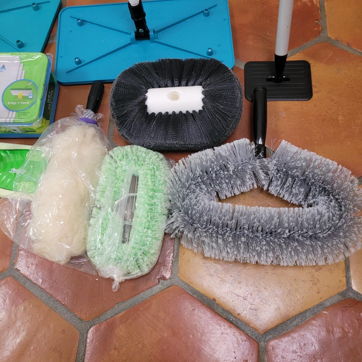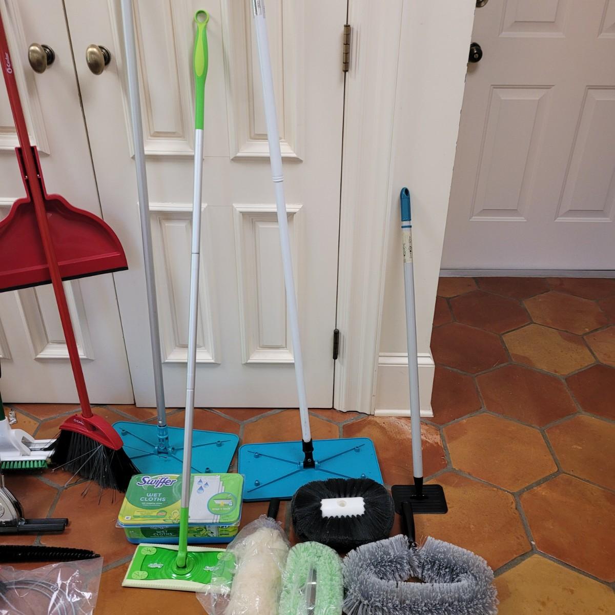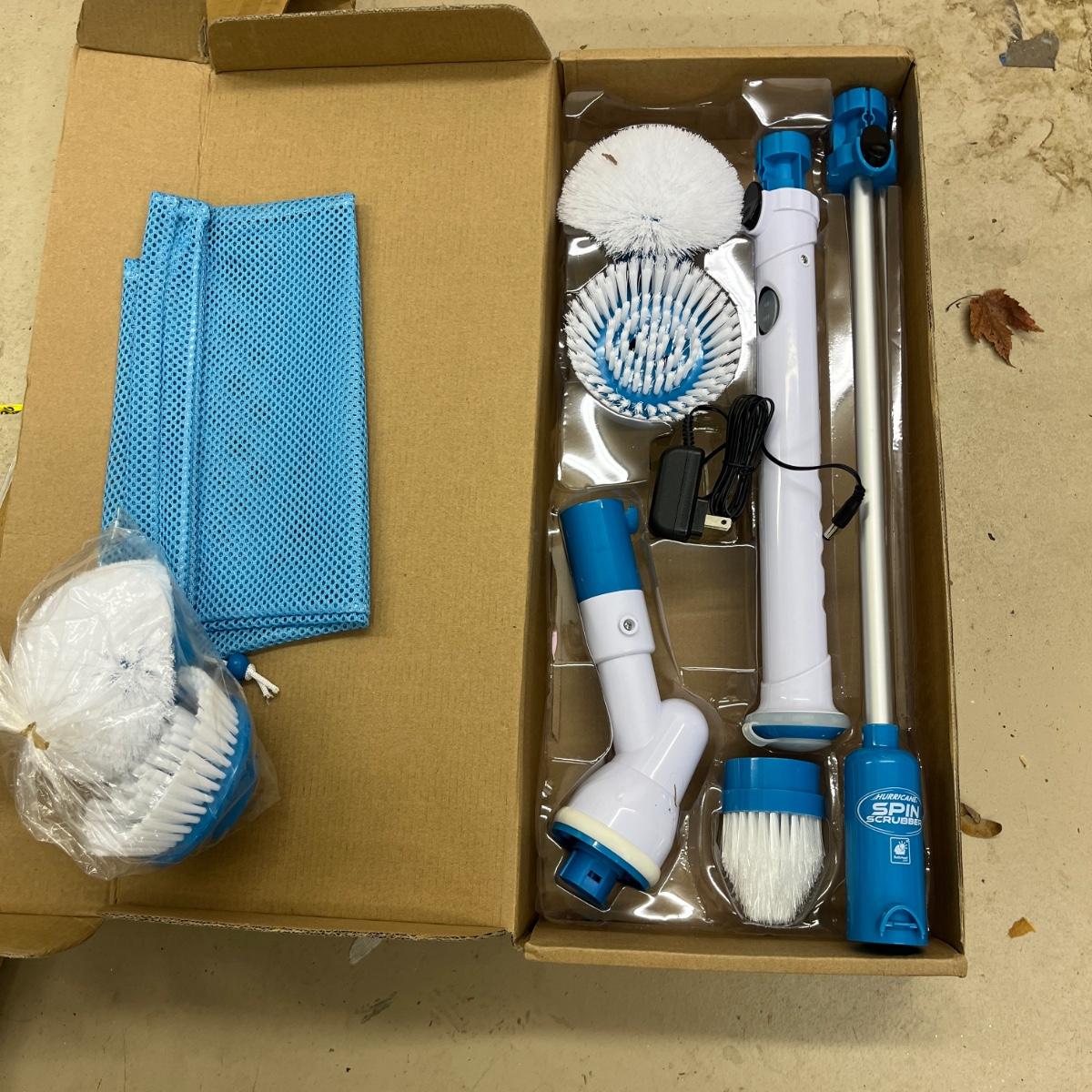 This large assortment of cleaning tools and accessories includes buckets, dust mops, brooms, mops with scrubber attachments, and more. Also includes a Hurricane Spin Scrubber that powered on when plugged in.