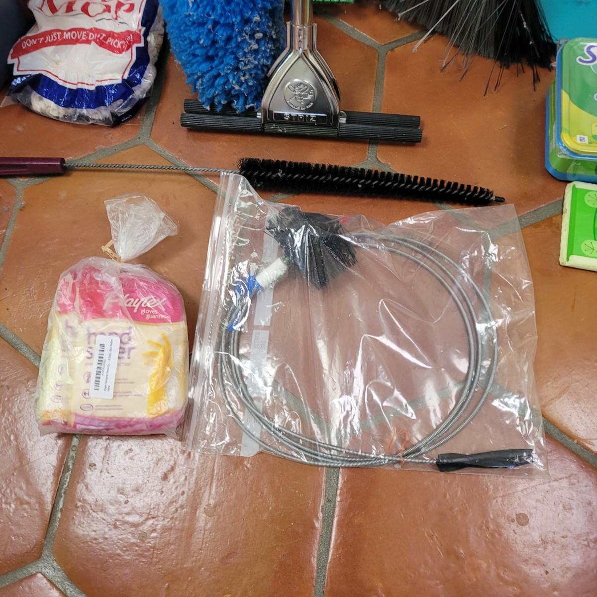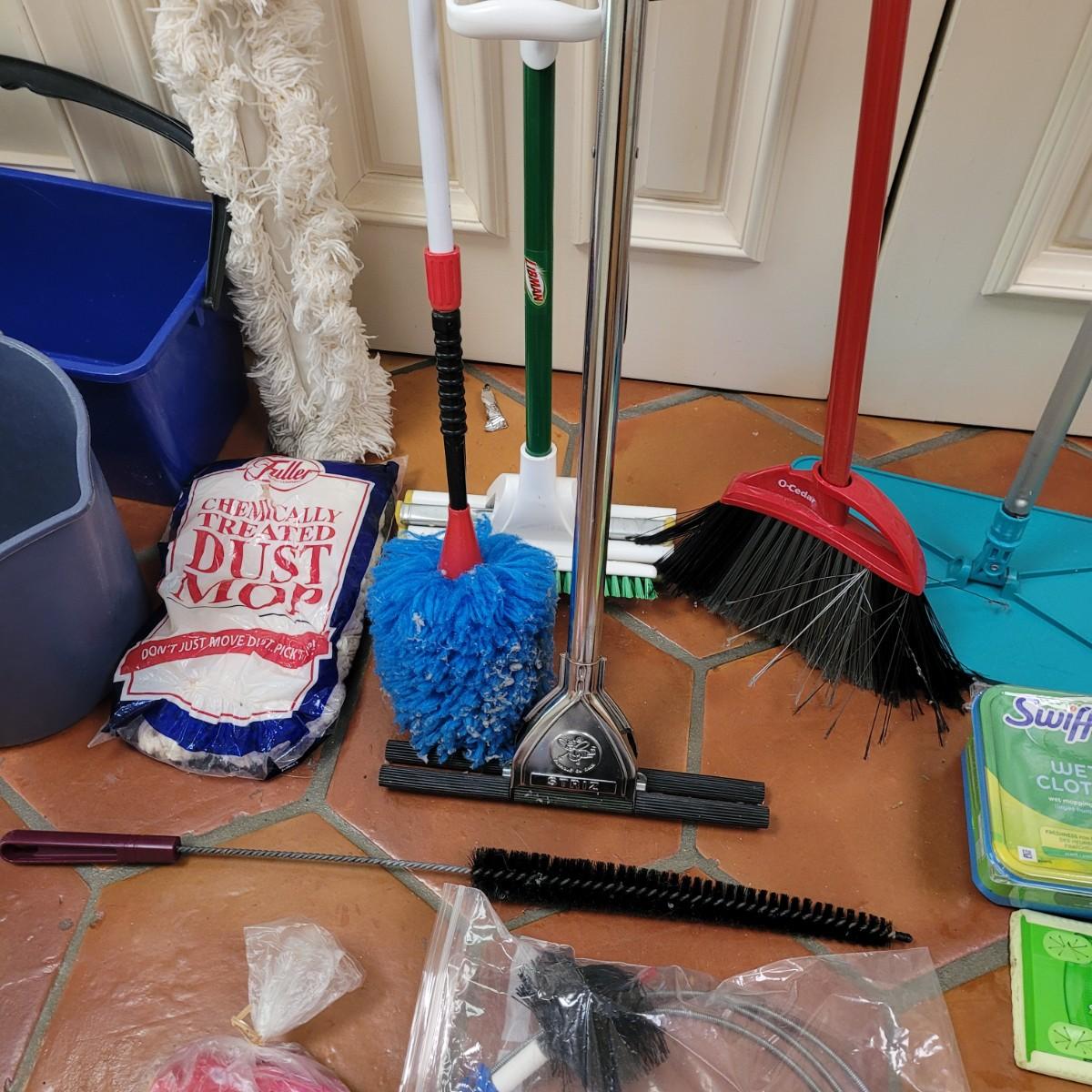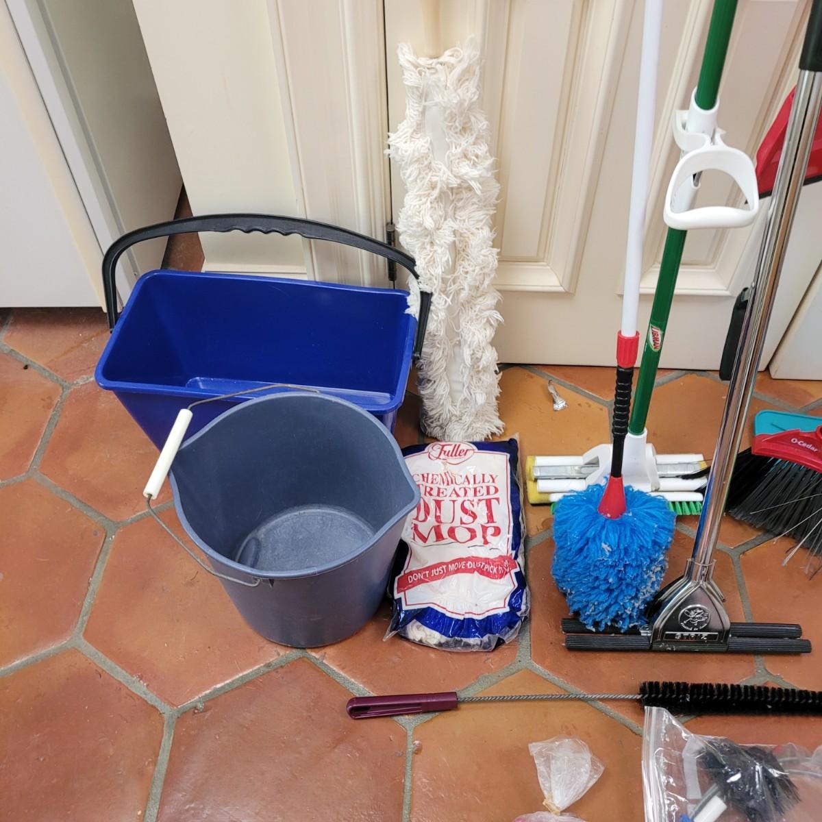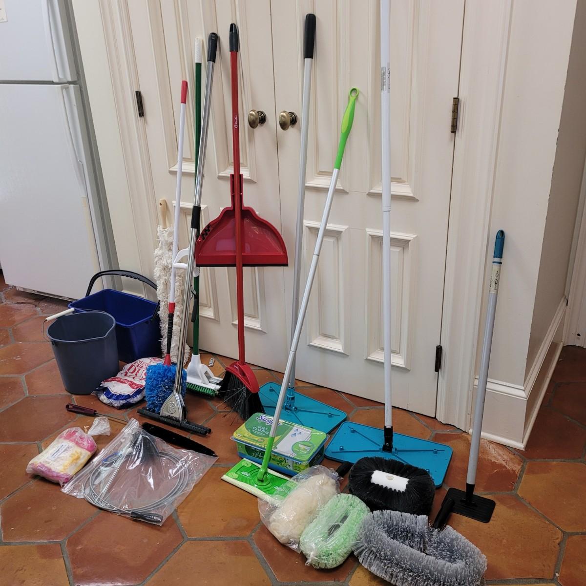 This large assortment of cleaning tools and accessories includes buckets, dust mops, brooms, mops with scrubber attachments, and more. Also includes a Hurricane Spin Scrubber that powered on when plugged in.