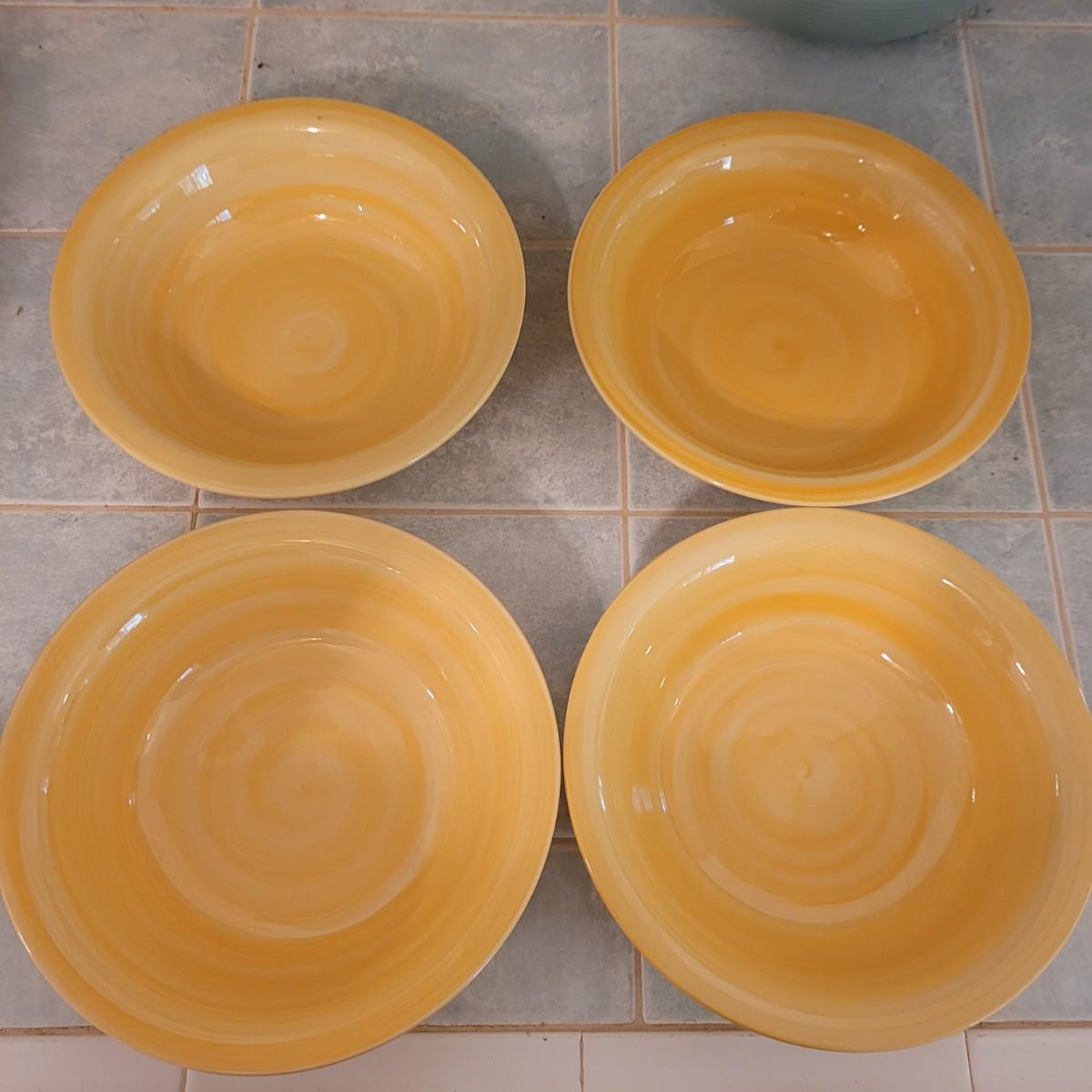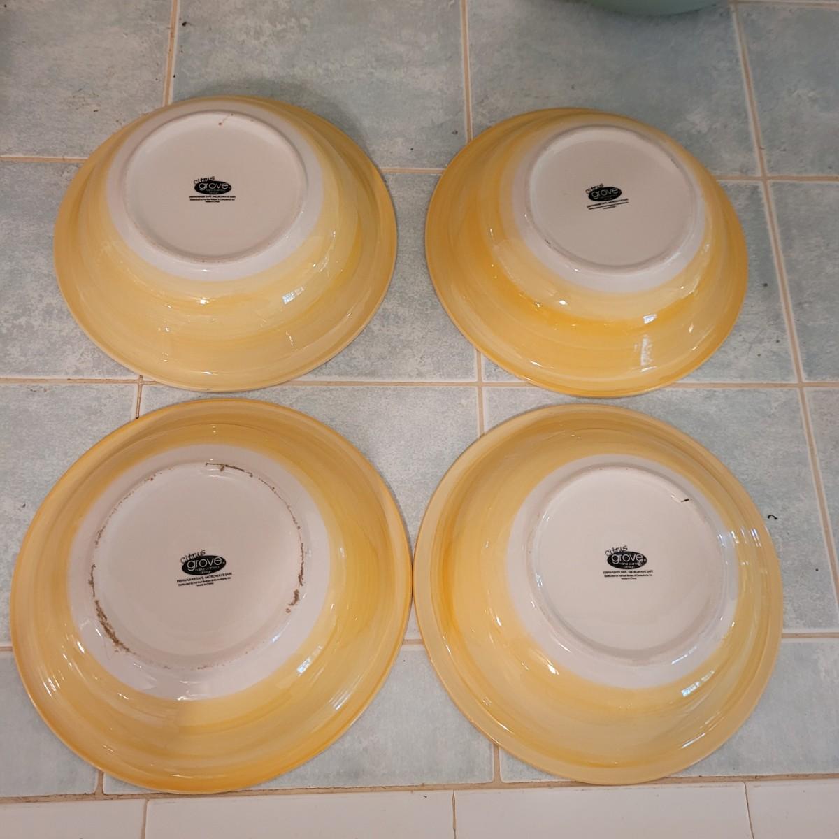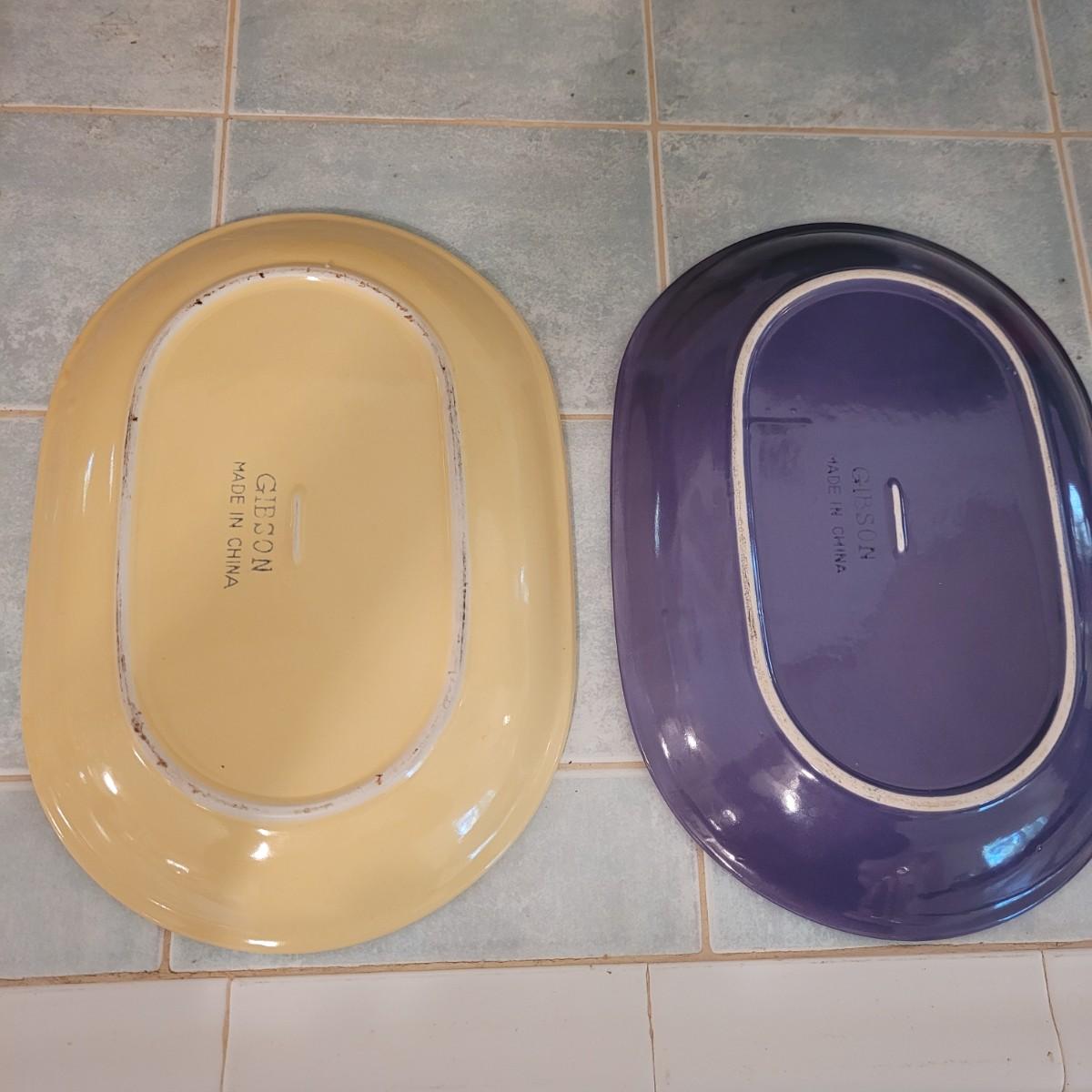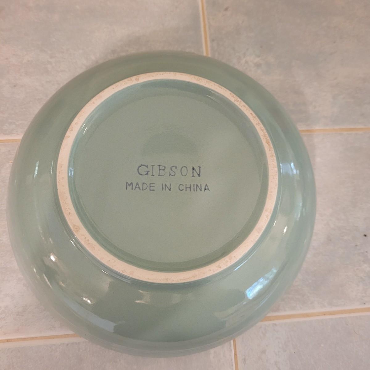 A colorful assortment of serving dishes, small plates, bowls, mug and trivet. All items in excellent condition, need to be cleaned. Large Gibson bowl measures approximately 9"DIA.