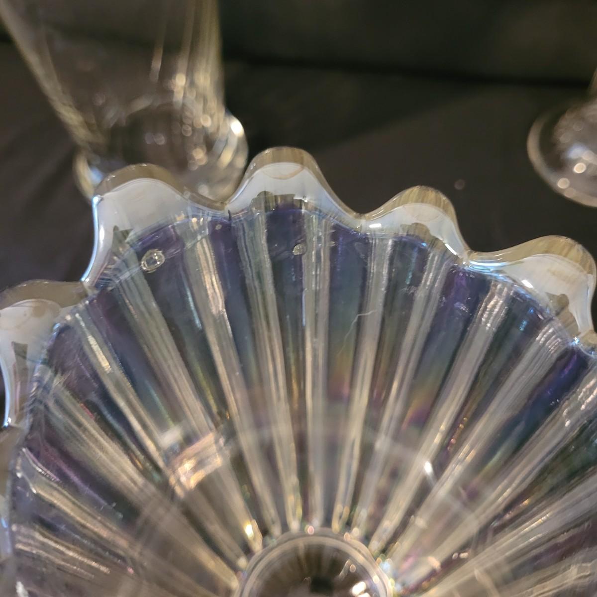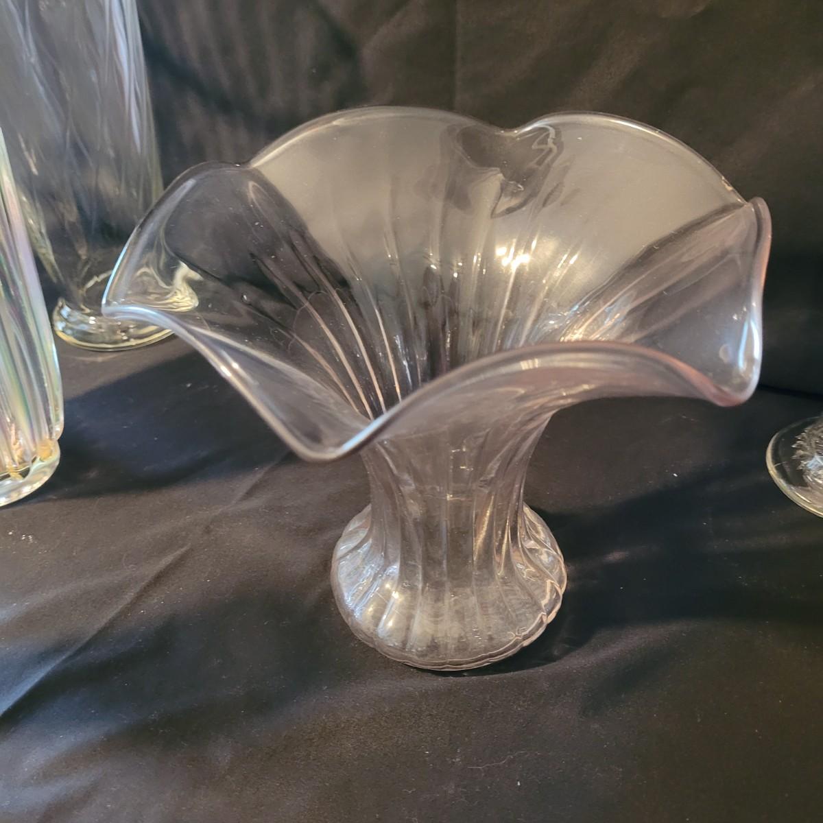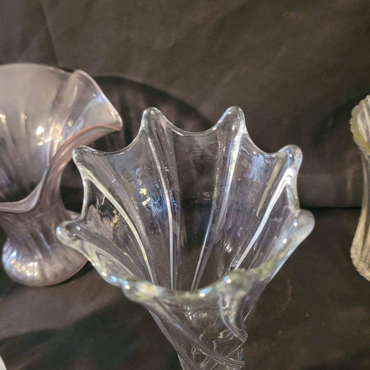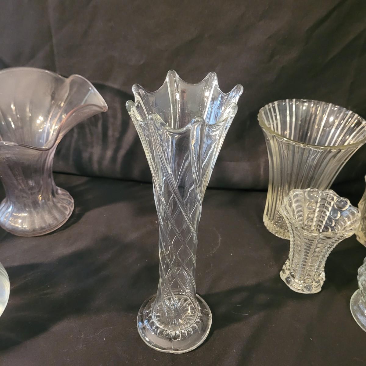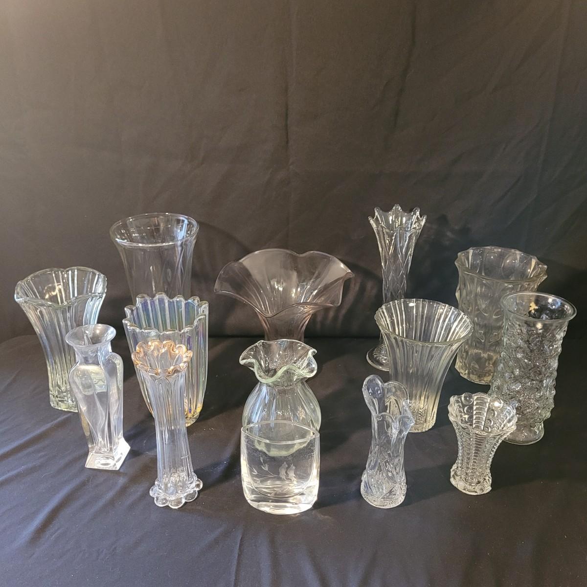 This large assortment of fourteen contemporary vases includes organic floral shaped edges, a variety of textures, iridescent hues, and all shapes and sizes. Some chips (see photos). Shorter trumpet lily style shaped vase in back center of photo measures approximately 9.5”DIA at mouth x 8”H. Shipping available.