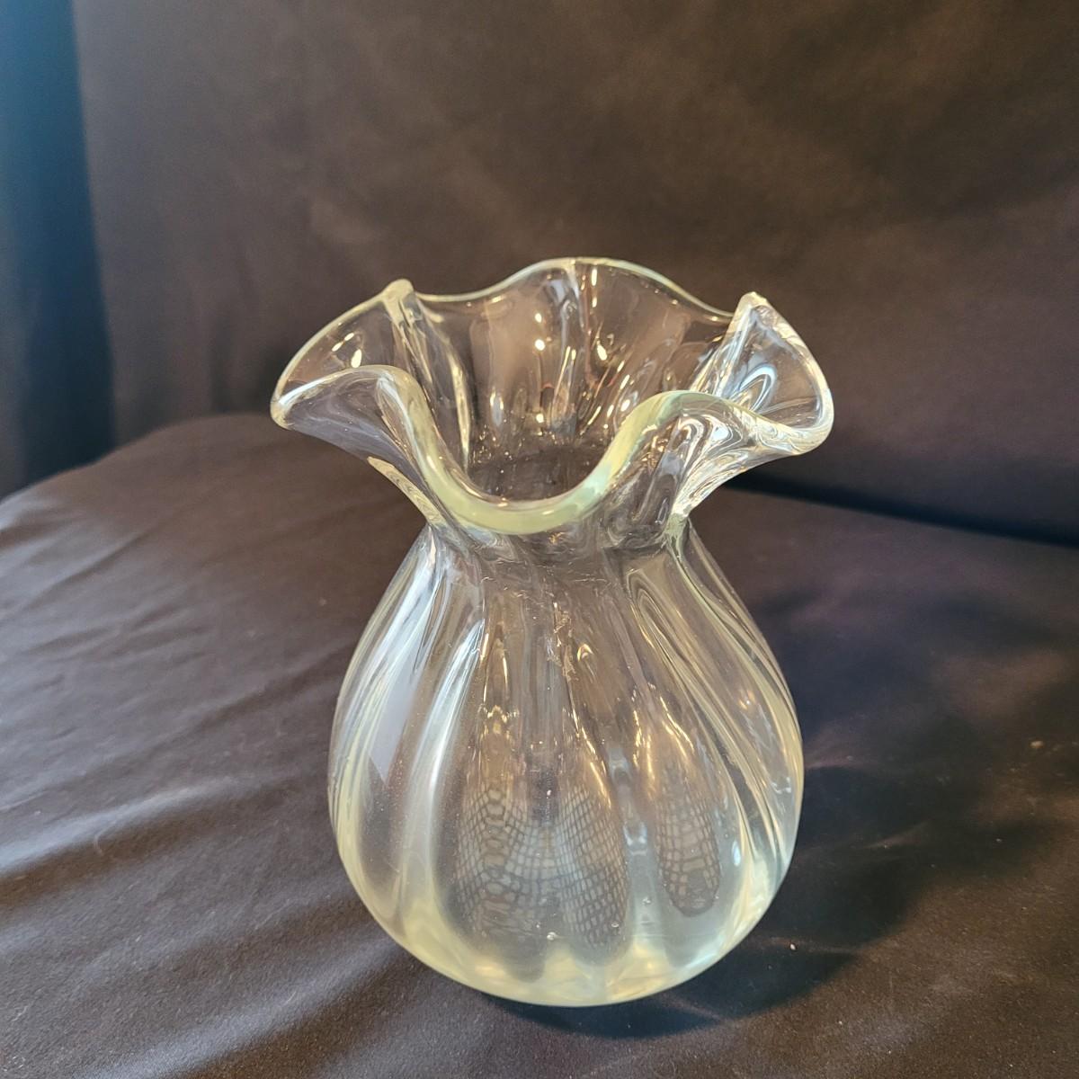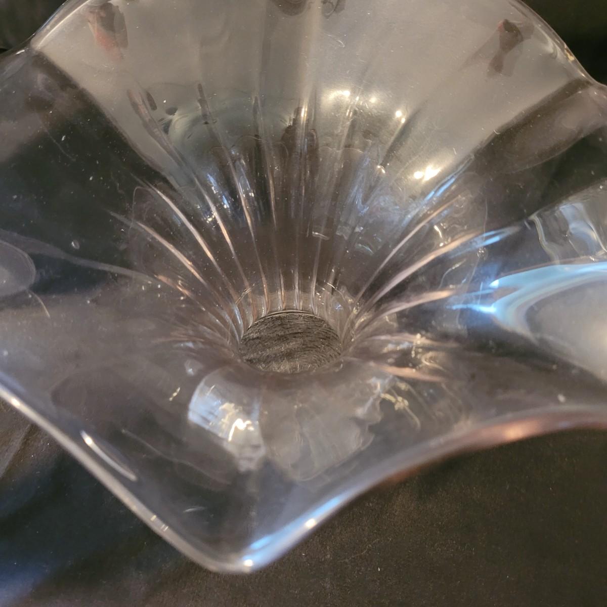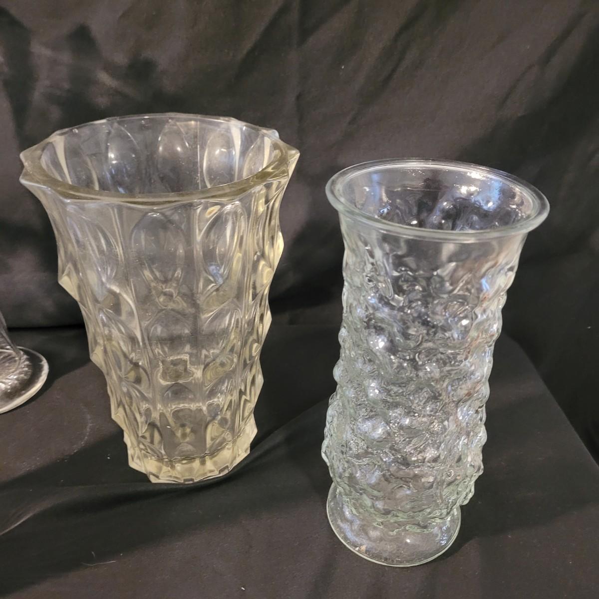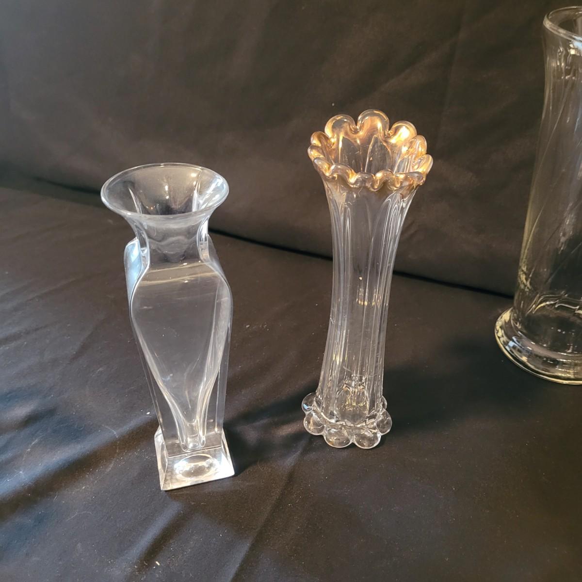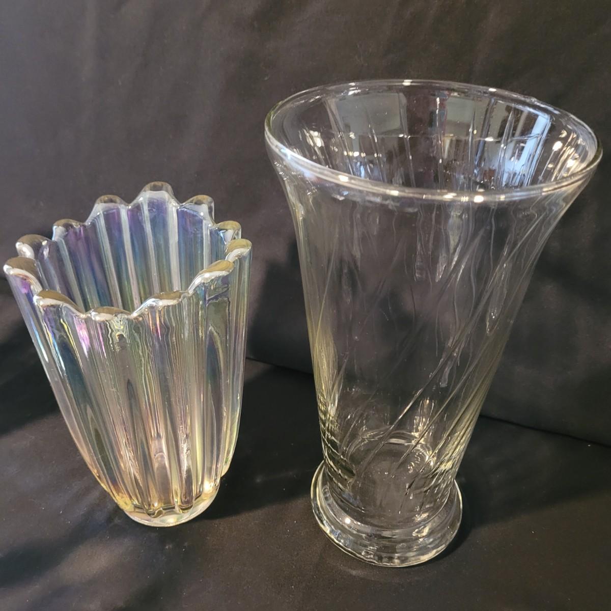 This large assortment of fourteen contemporary vases includes organic floral shaped edges, a variety of textures, iridescent hues, and all shapes and sizes. Some chips (see photos). Shorter trumpet lily style shaped vase in back center of photo measures approximately 9.5”DIA at mouth x 8”H. Shipping available.