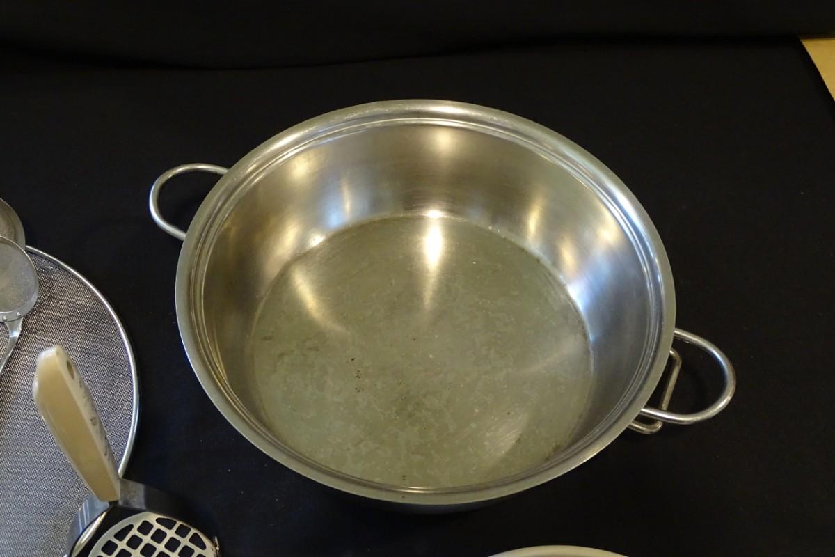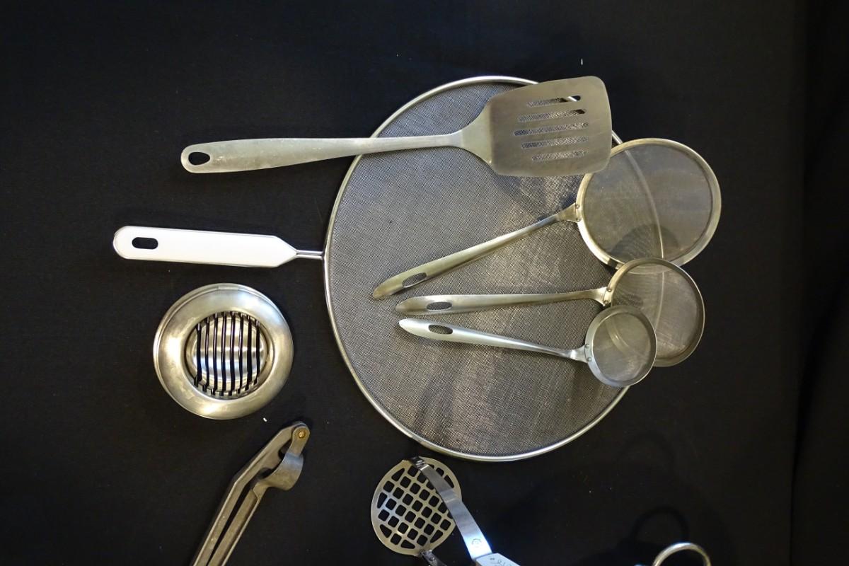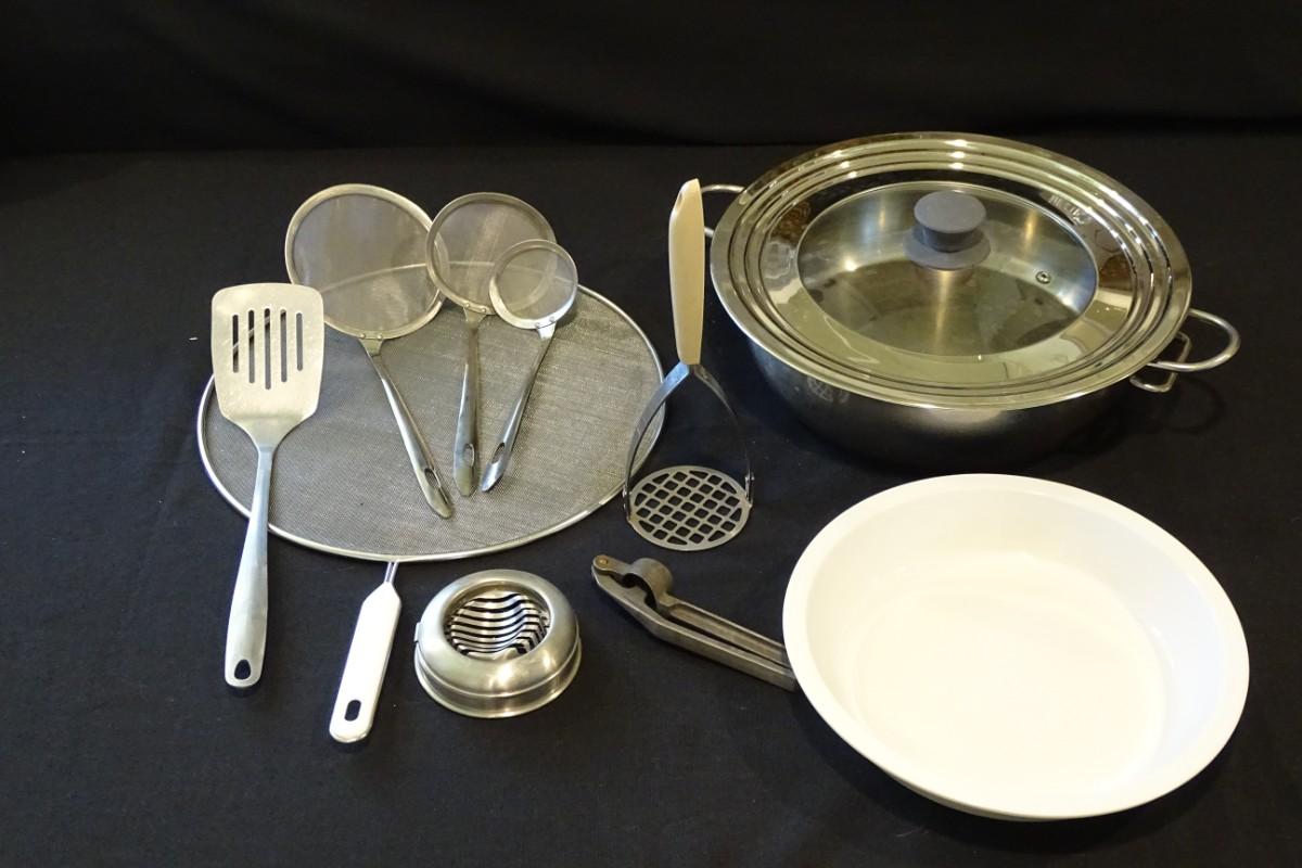 Giada Bowl, Metal Pot with Glass Lid, Strainers, Spatula, Egg slicer, Masher