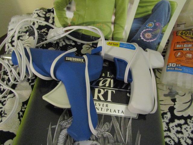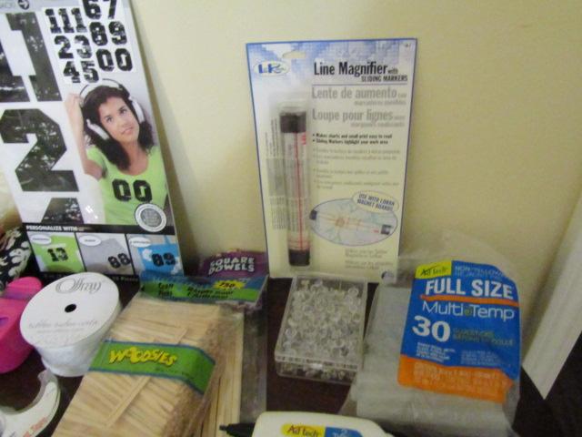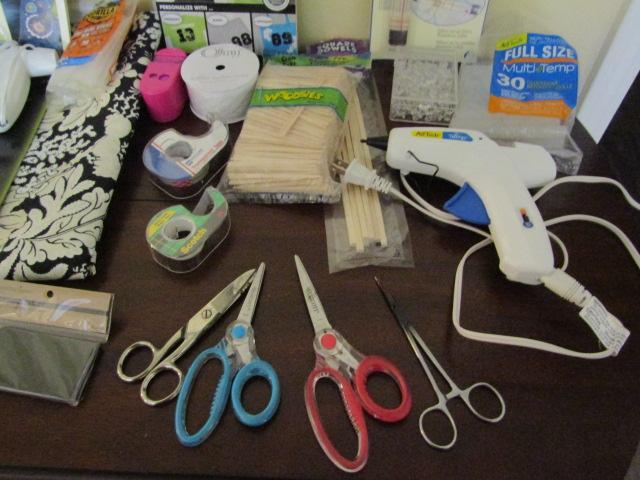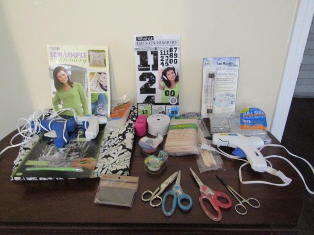 Assortment of Crafting Supplies. Scissors, hot glue guns, fabric, etc.