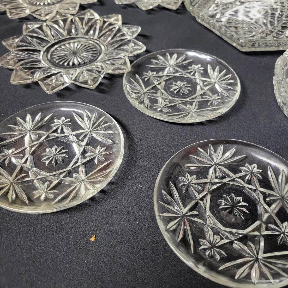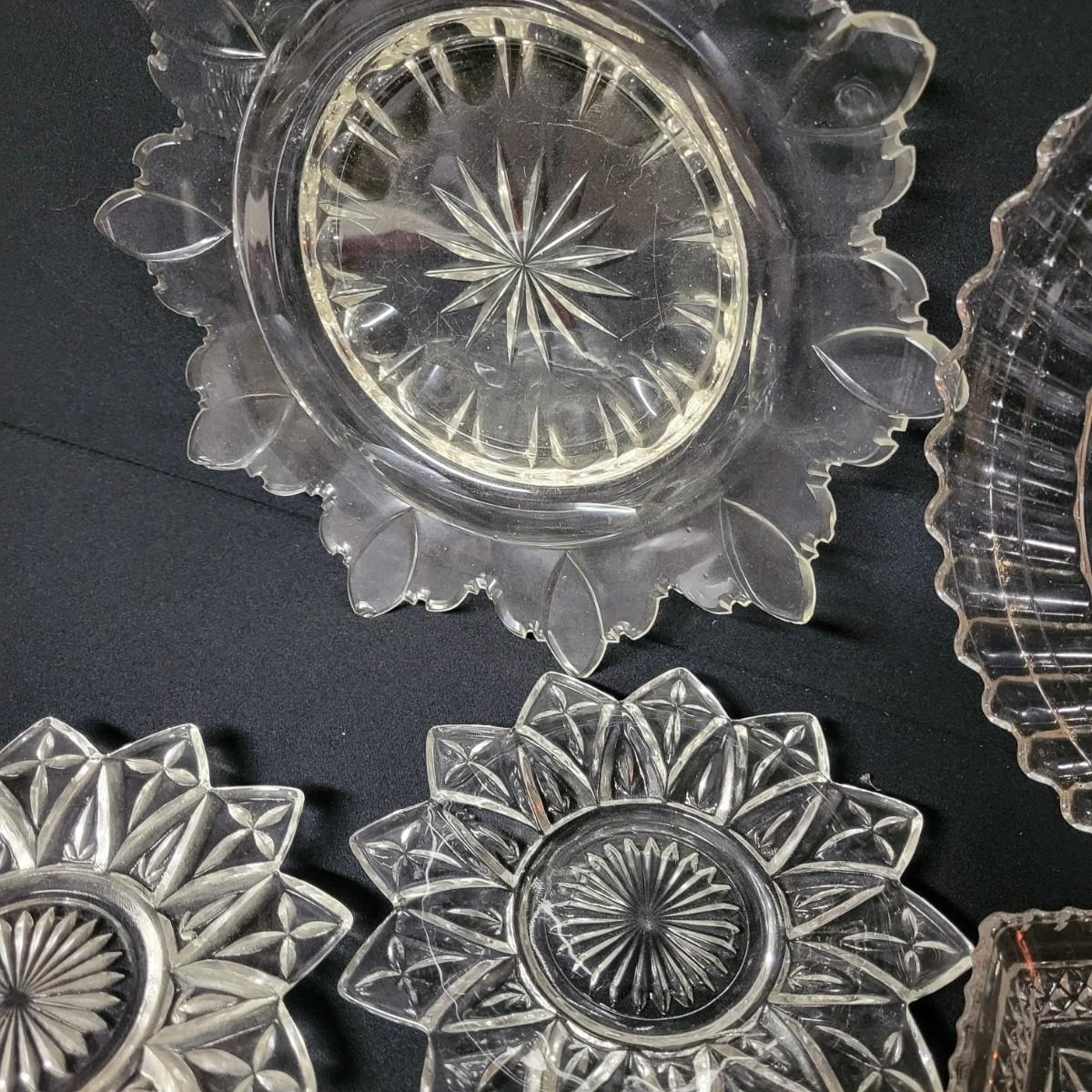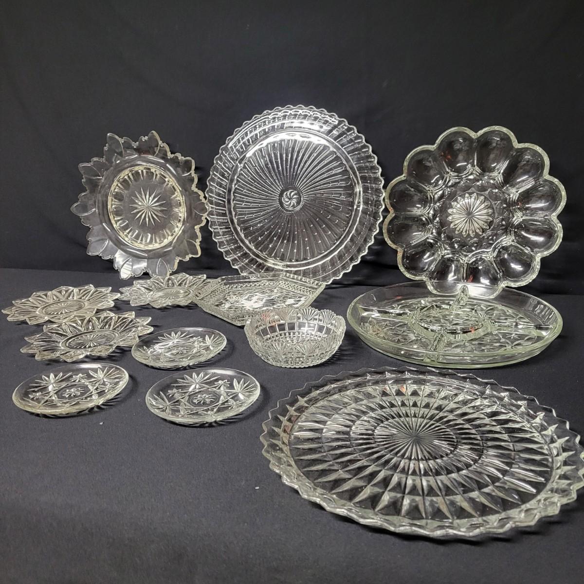 An assortment of thirteen crystal and glass platters and small plates in good condition. Most pieces are new, but a few have been used, but show no notable damage. Largest platter measures approximately 11.5" Shipping available