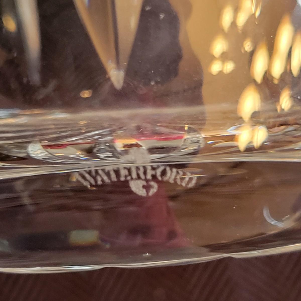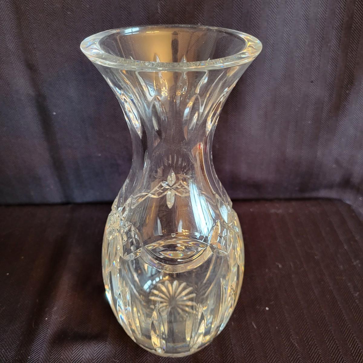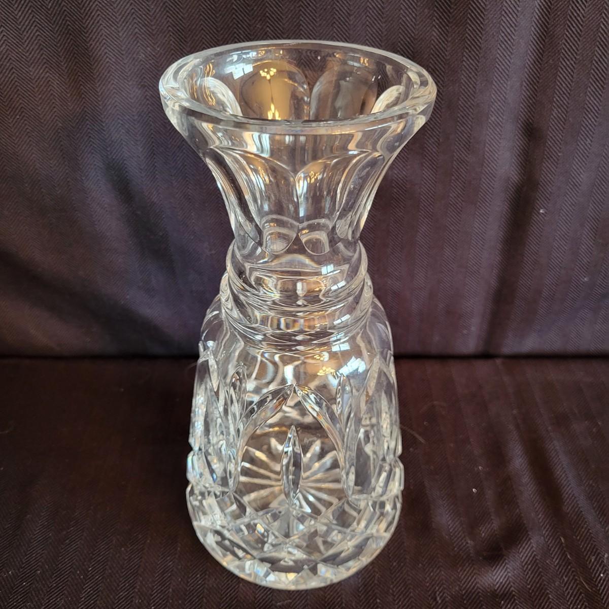 An assortment of seven crystal and glass vessels. Included is two Waterford crystal vases amd four other crystal pieces. The last vase pictured is molded glass. The tallest crystal vase measures approximately 4.5"D x 12.5"H. Shipping available