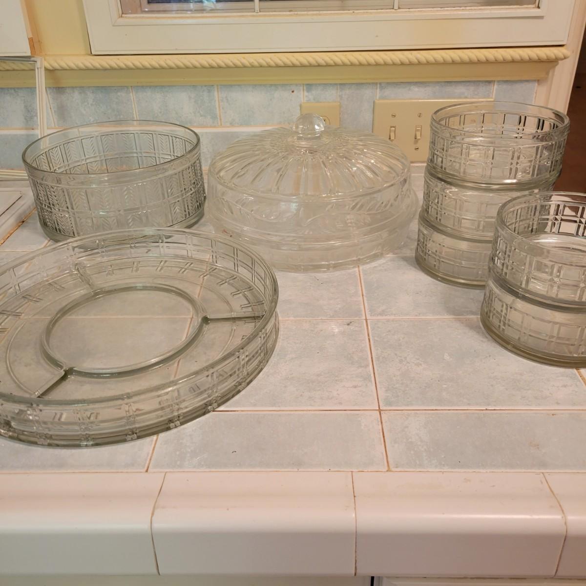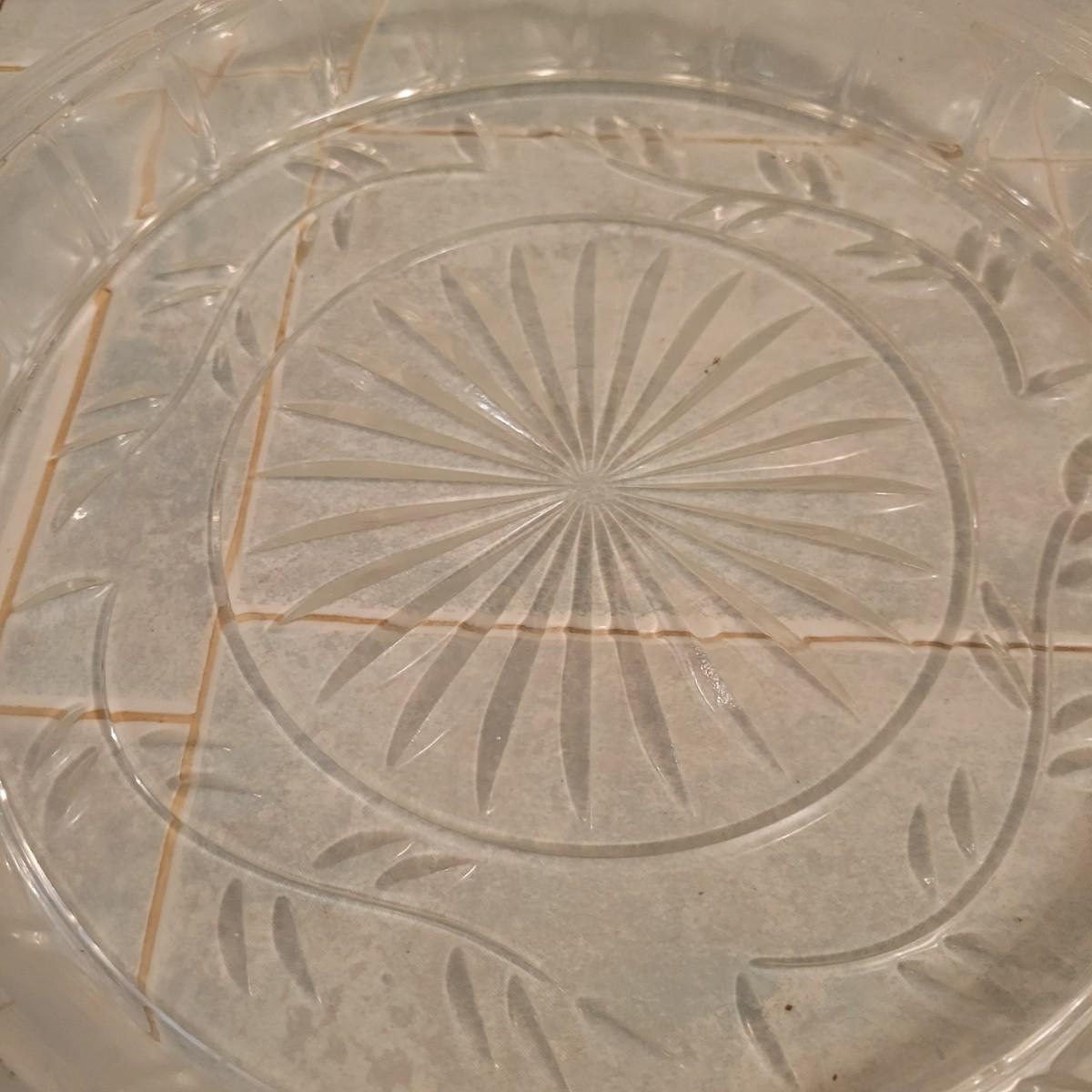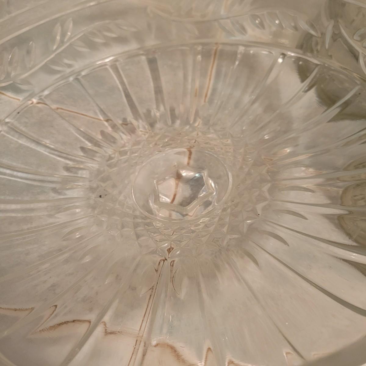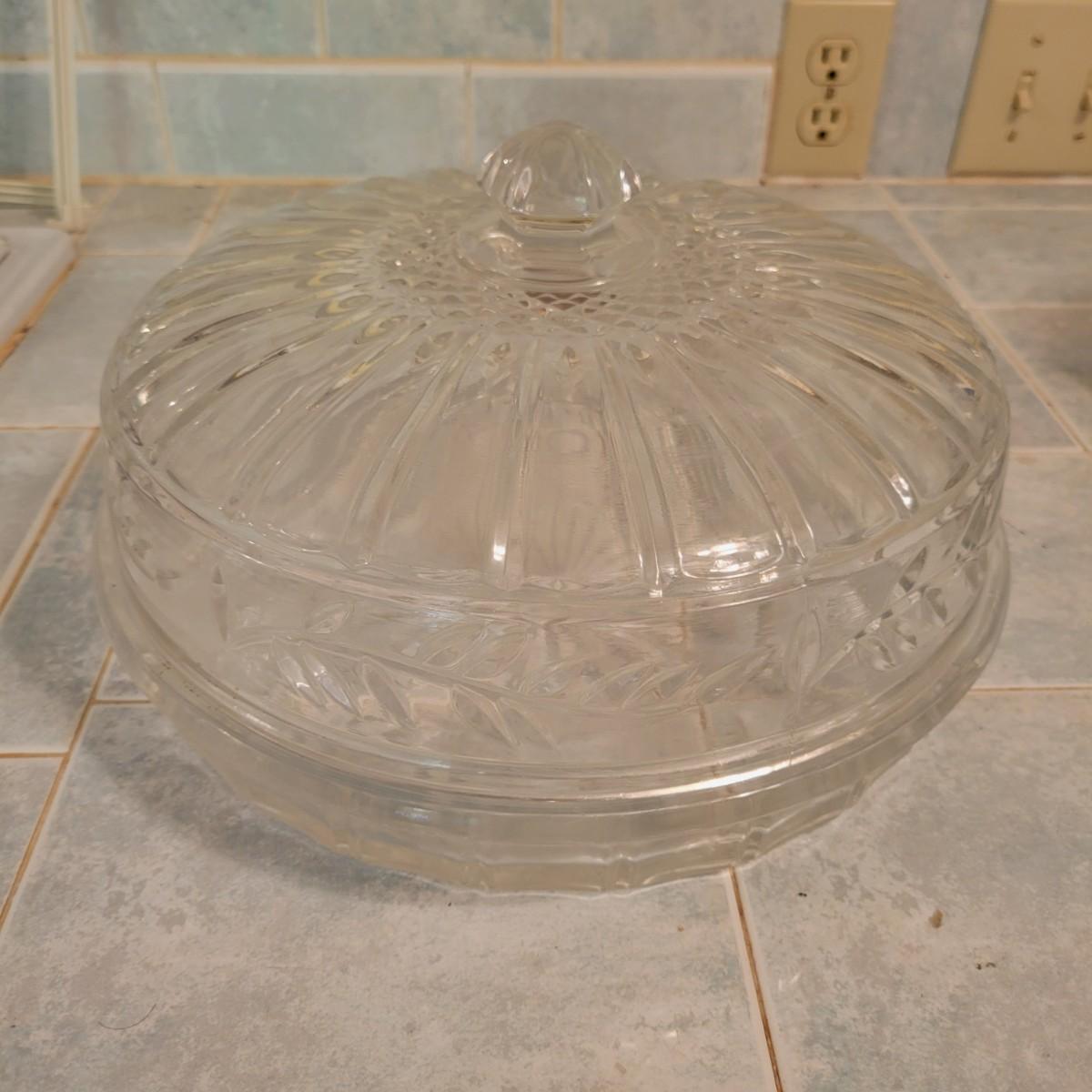 An assortment of cut glass bowls and platters in good condition with no chips. Included is a set of five small bowls, a large bowl, a large platter and a large cake dish with lid. Cake dish and lid measures approximately 12" x 7" Local pickup only
