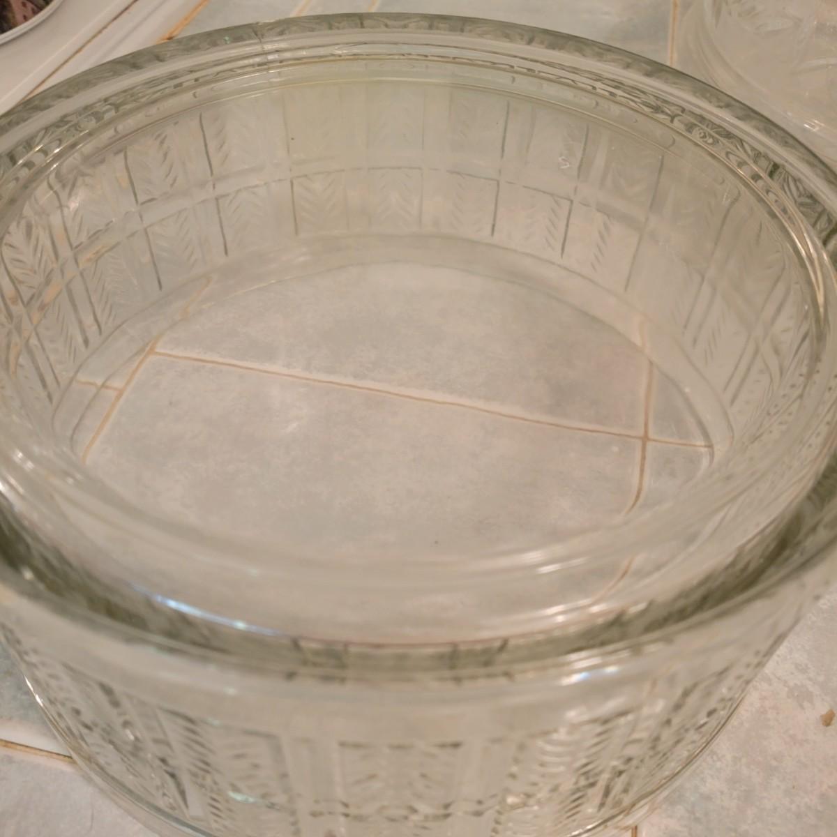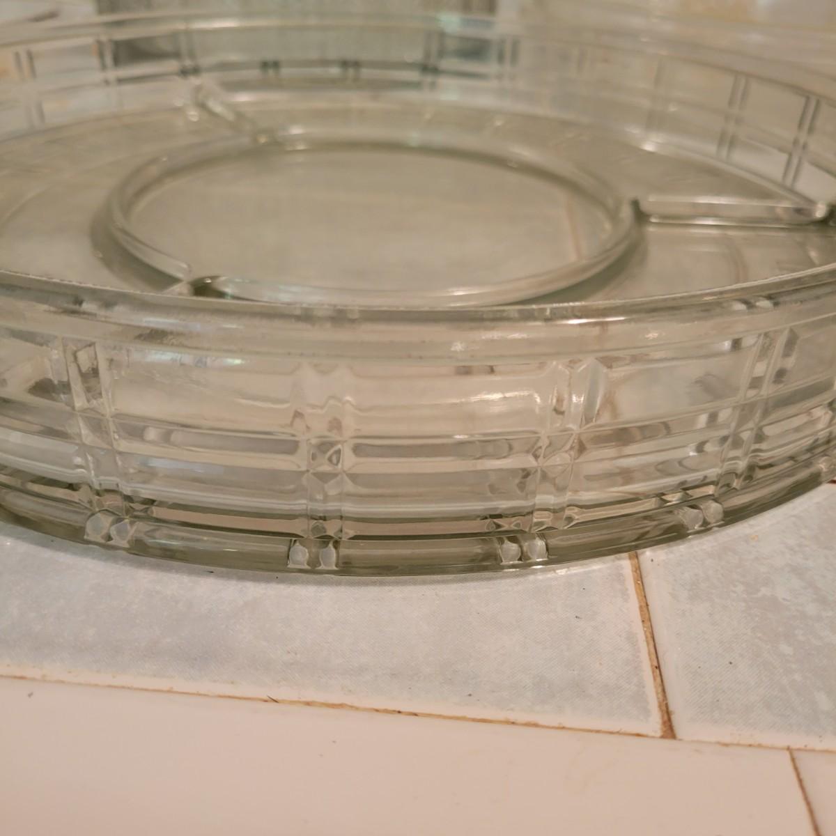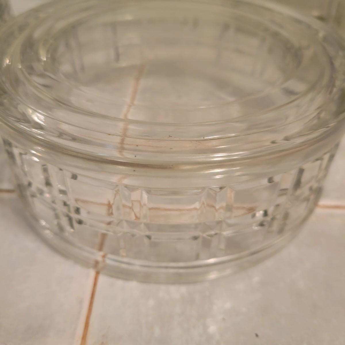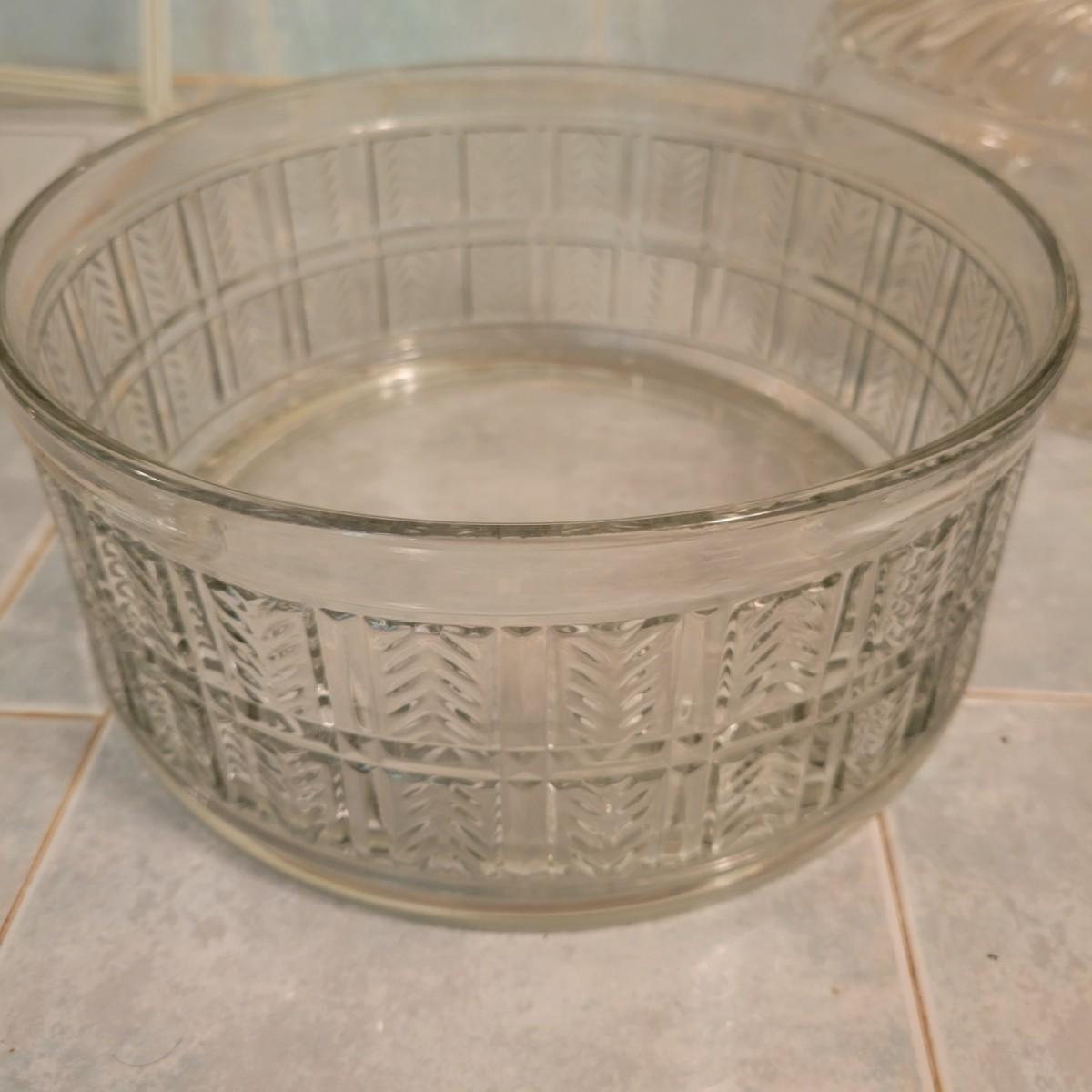 An assortment of cut glass bowls and platters in good condition with no chips. Included is a set of five small bowls, a large bowl, a large platter and a large cake dish with lid. Cake dish and lid measures approximately 12" x 7" Local pickup only