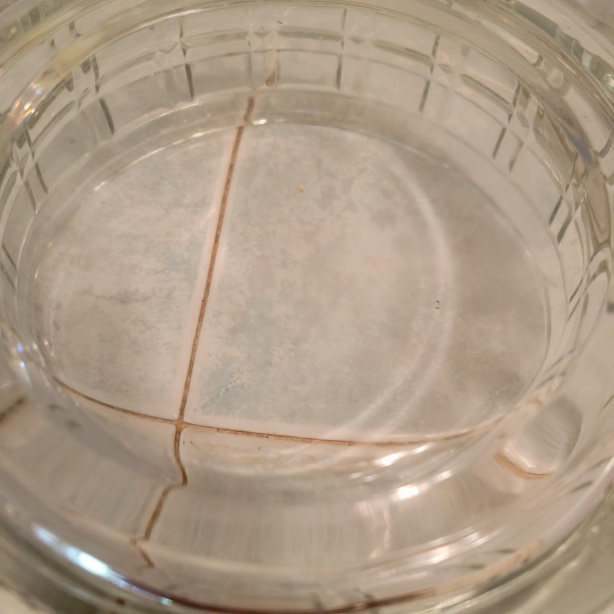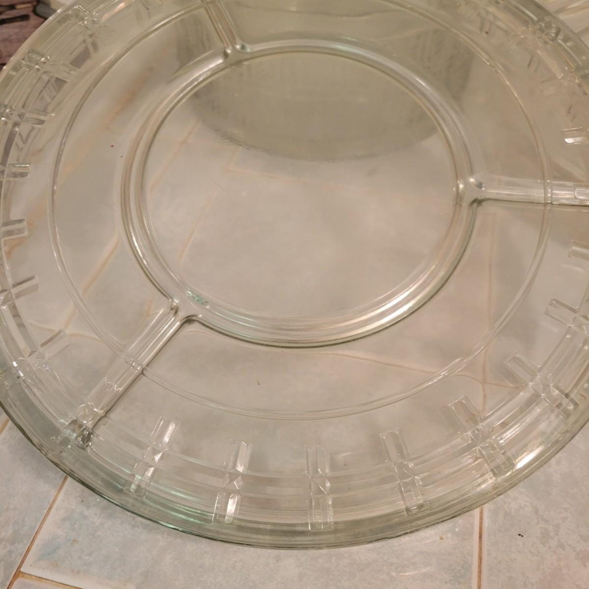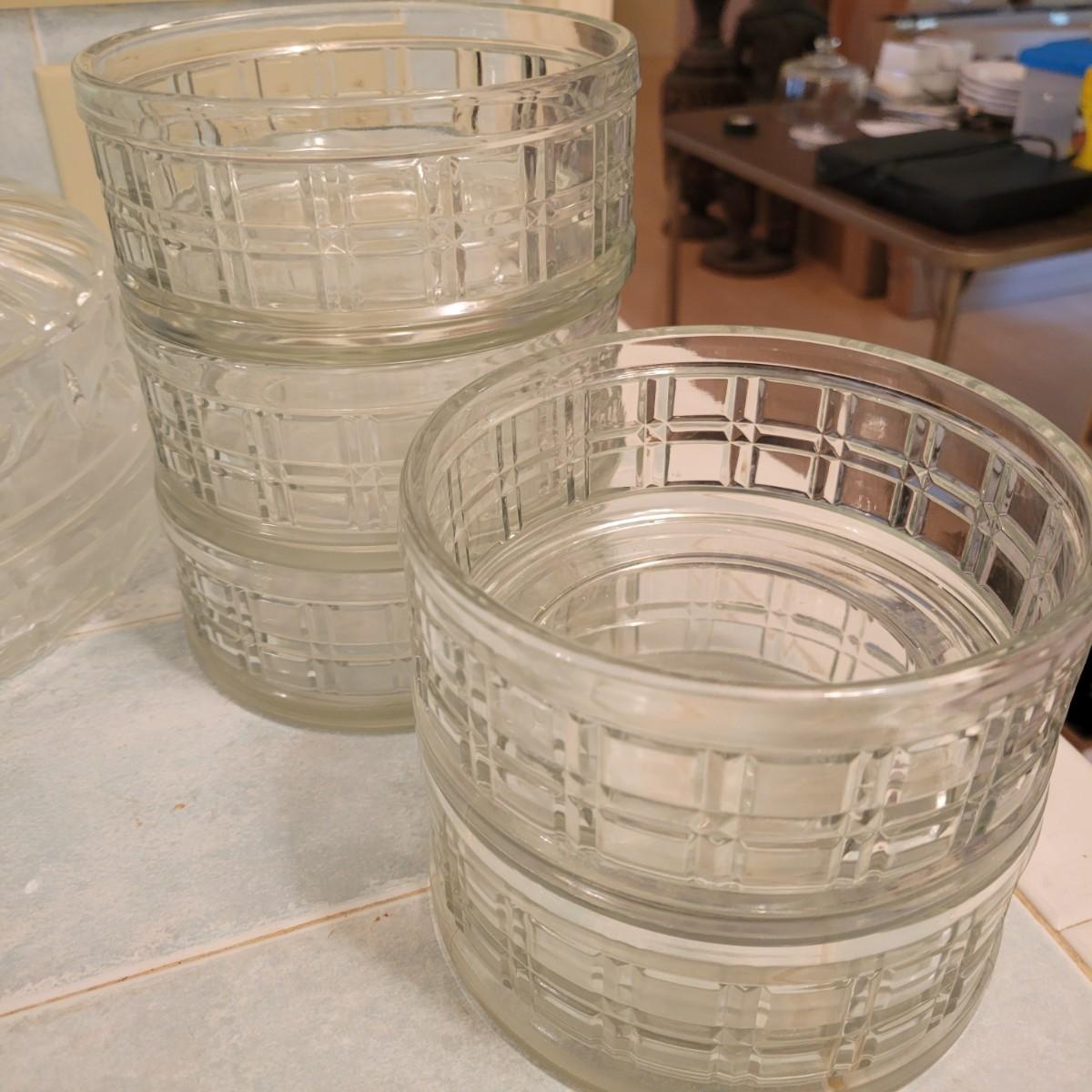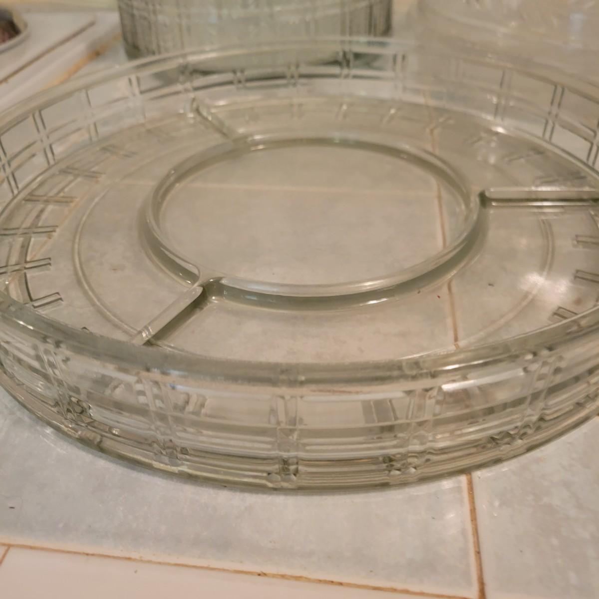 An assortment of cut glass bowls and platters in good condition with no chips. Included is a set of five small bowls, a large bowl, a large platter and a large cake dish with lid. Cake dish and lid measures approximately 12" x 7" Local pickup only