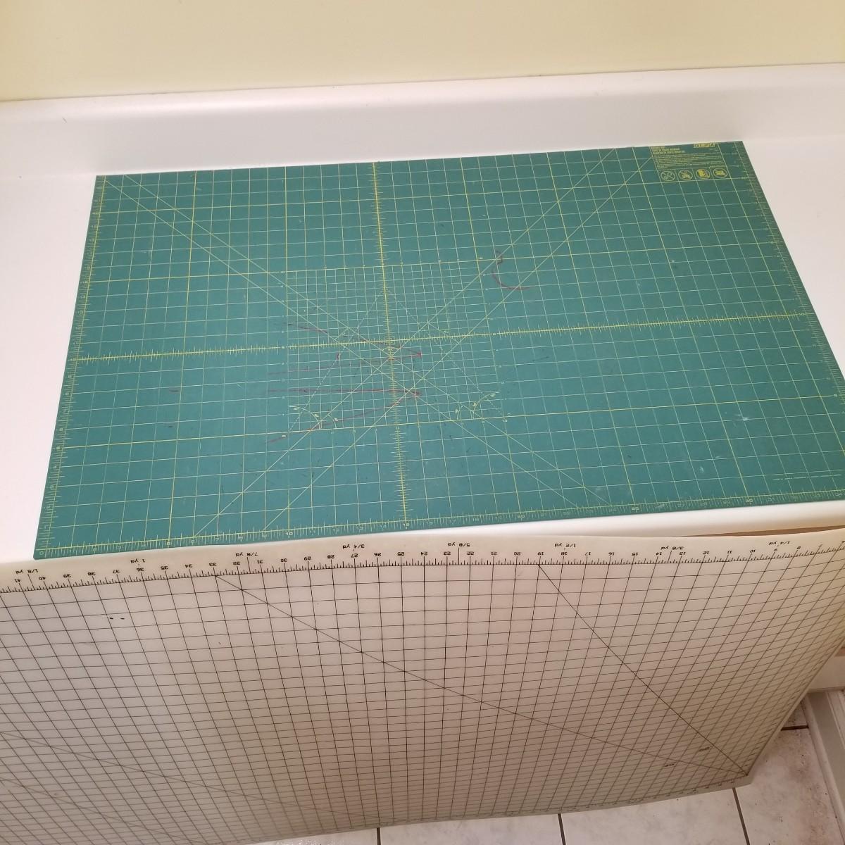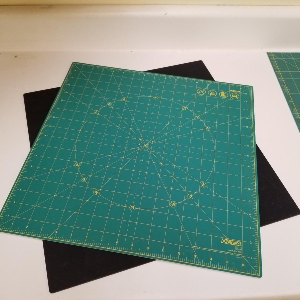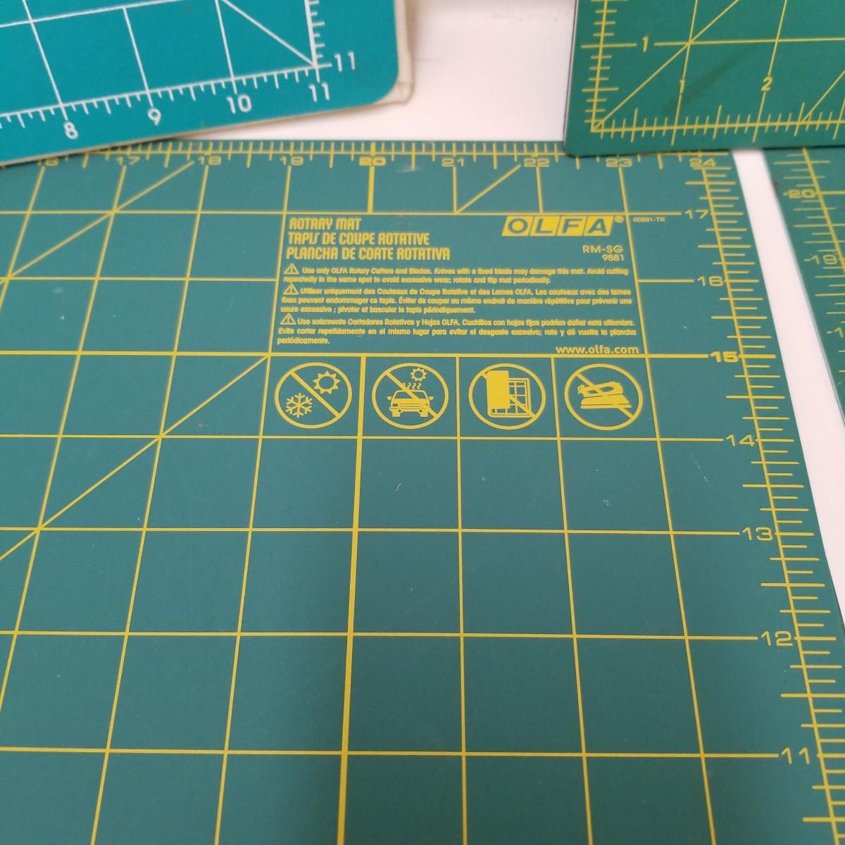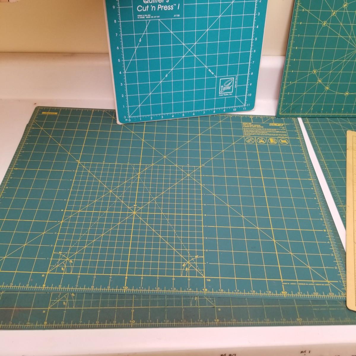 Several different sizes of self healing cutting mats. Olfa, Fiskars and June Tailor are represented here. Some mats have been cut down from larger sizes. 36.5"x59", 18"x24", 18"x22.5", 17.5" sq with spin base, 12.5" sq with spin base, 6"x18" and one June Tailor Cut n Press two side mat, 12"13". See photos for details. Local pickup only.