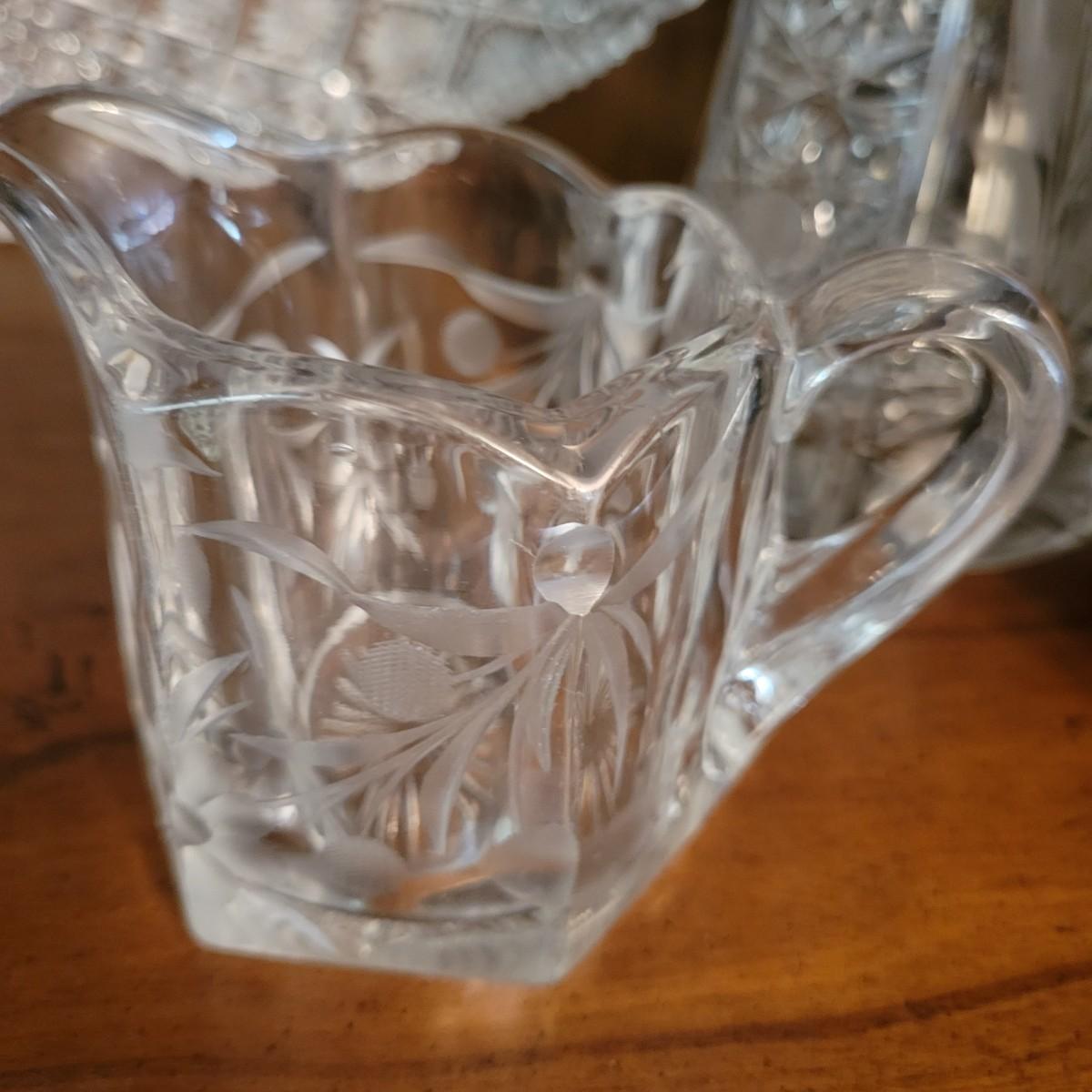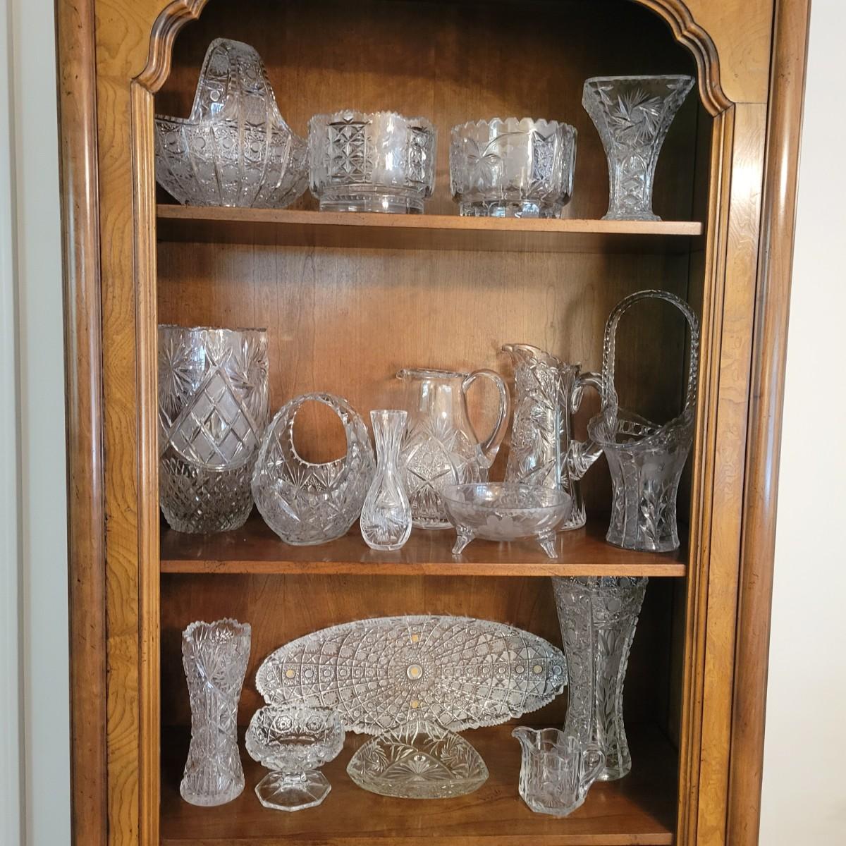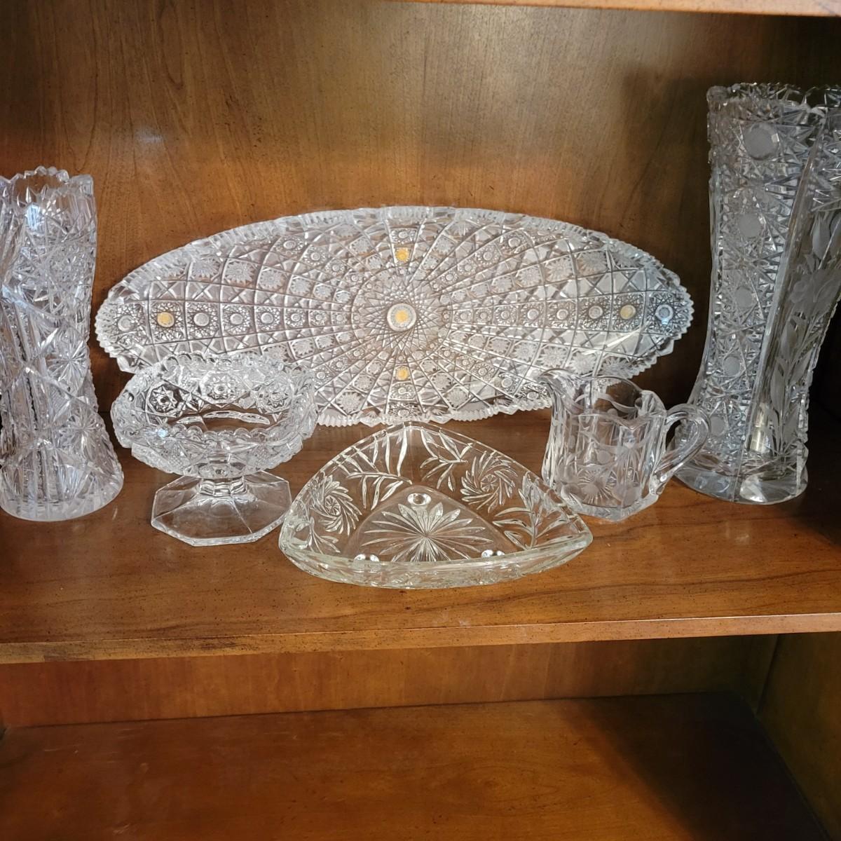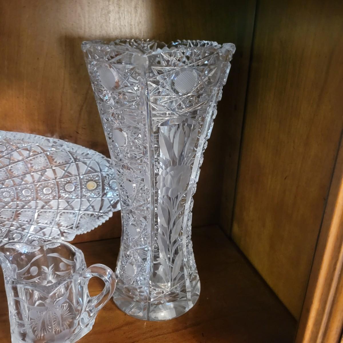 An assortment of etched and cut glass ranging from platters and bowls to pitchers and vases. The largest piece is a vase that measures approximately 6"D x 10"H and is the last item pictured. 17 pieces total are included in this lot. Local pickup only