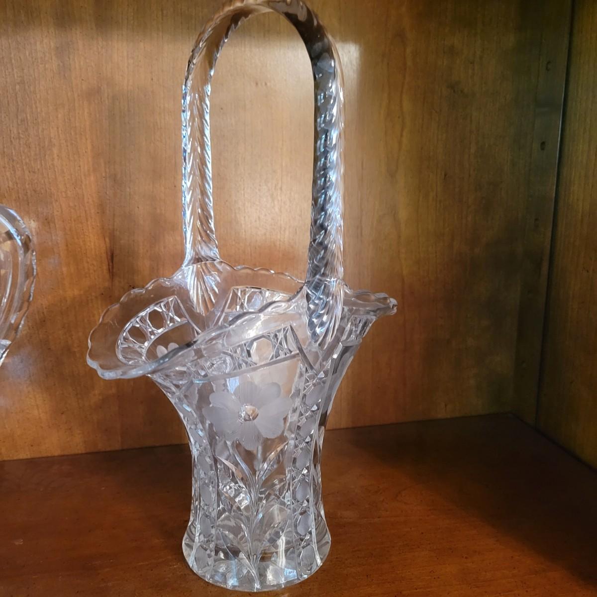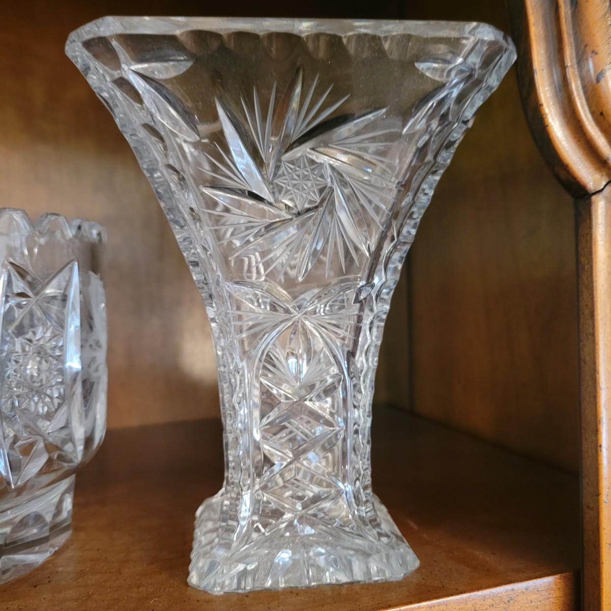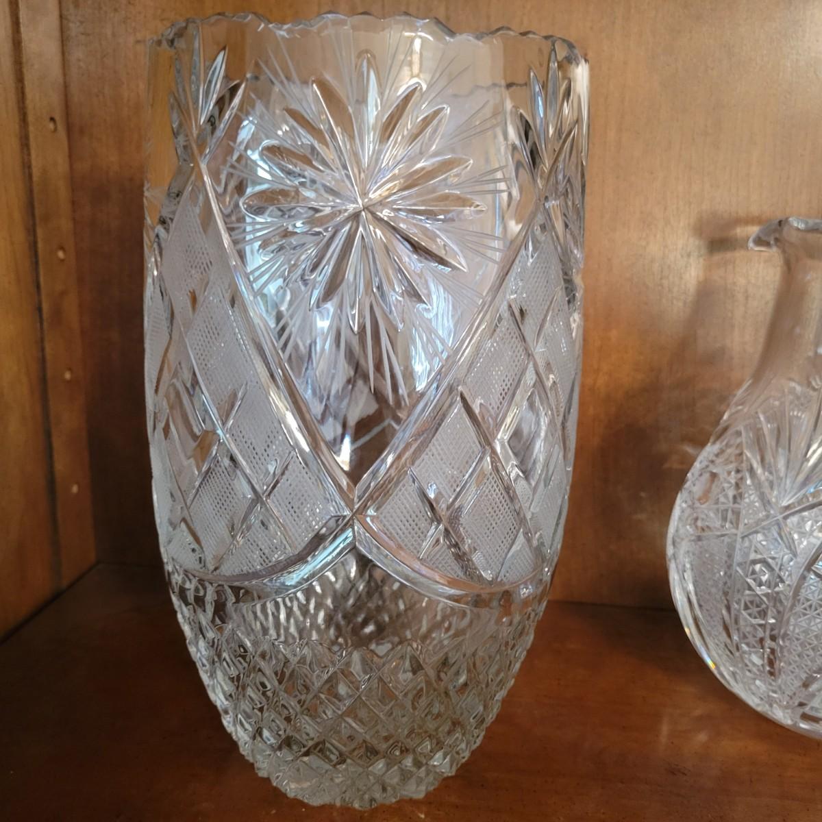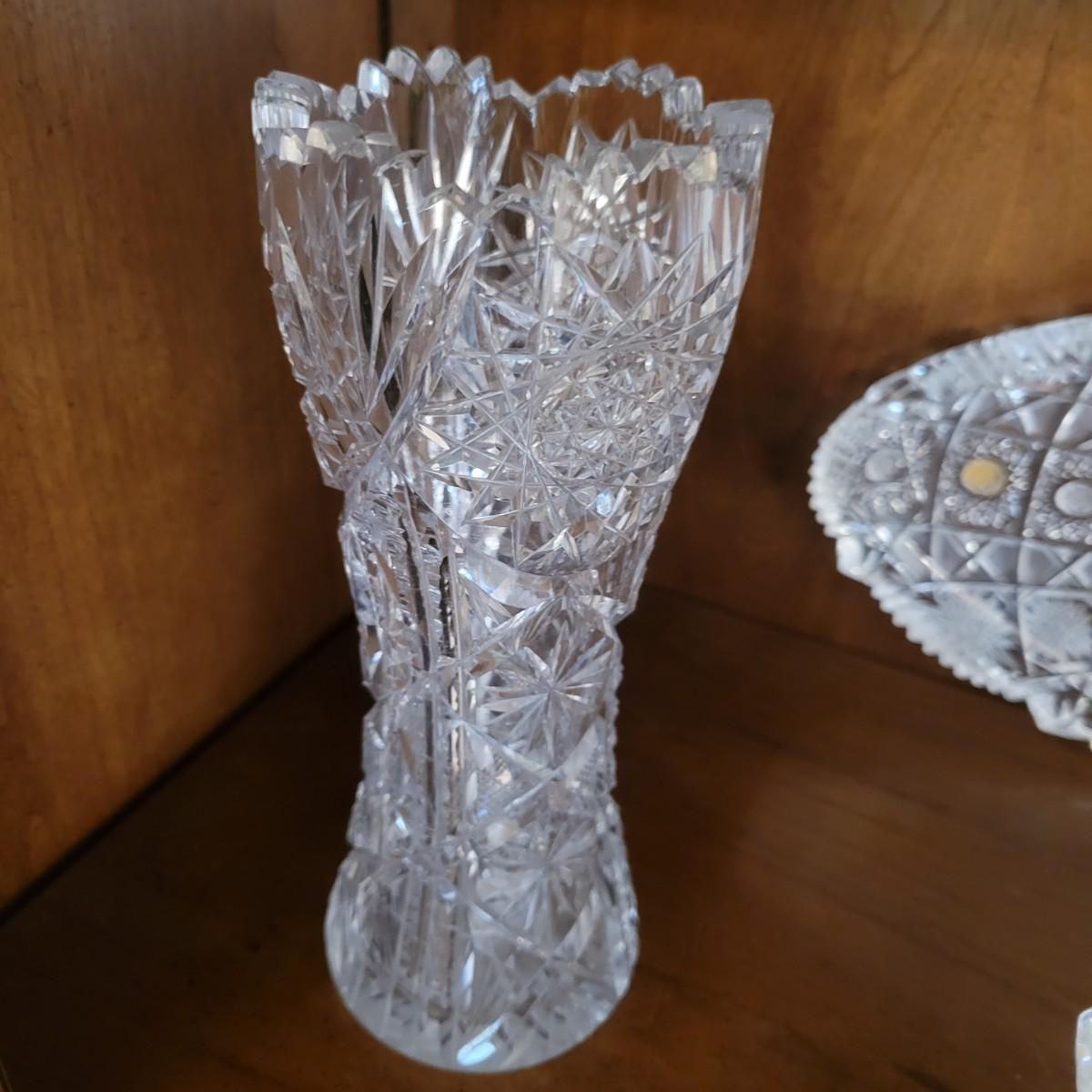 An assortment of etched and cut glass ranging from platters and bowls to pitchers and vases. The largest piece is a vase that measures approximately 6"D x 10"H and is the last item pictured. 17 pieces total are included in this lot. Local pickup only