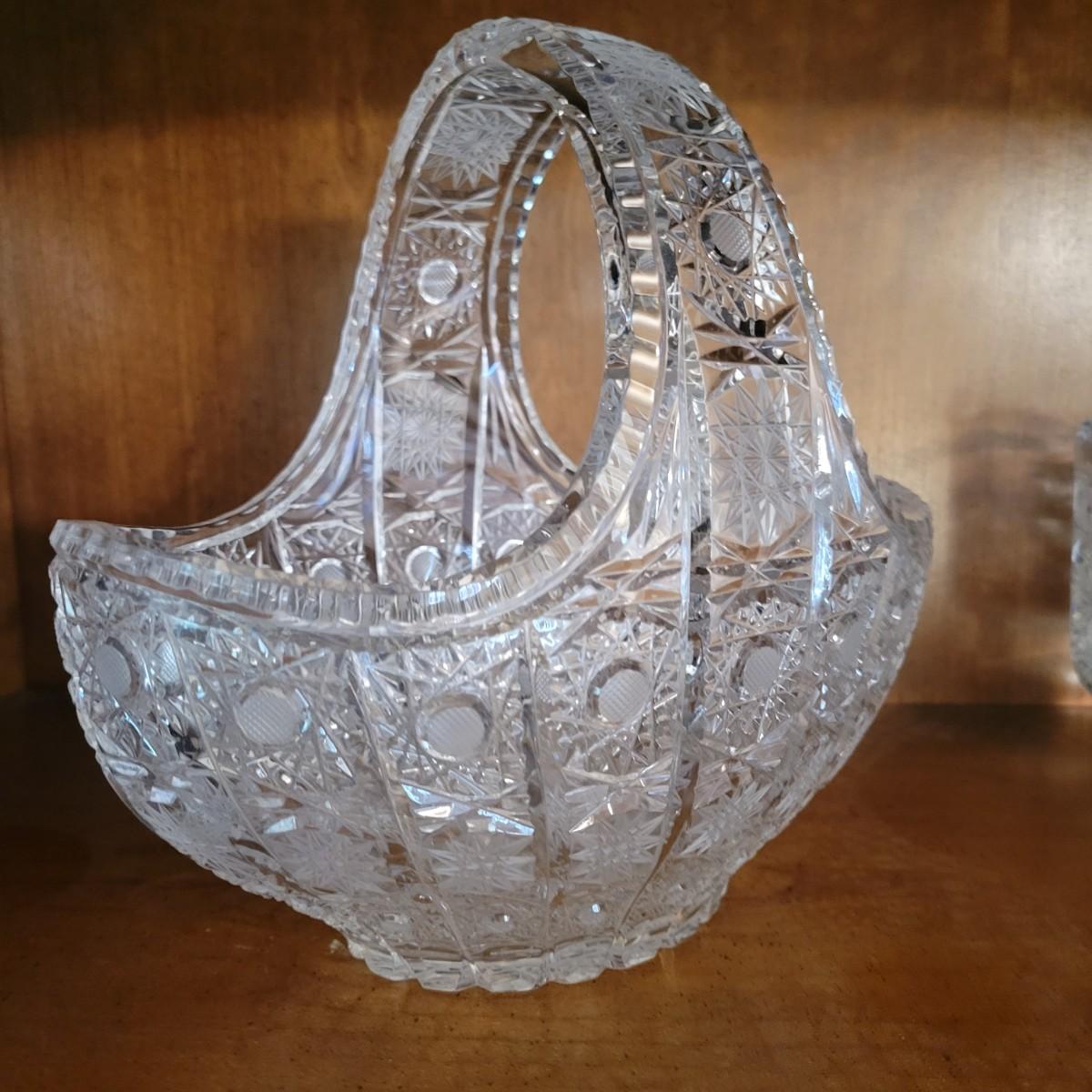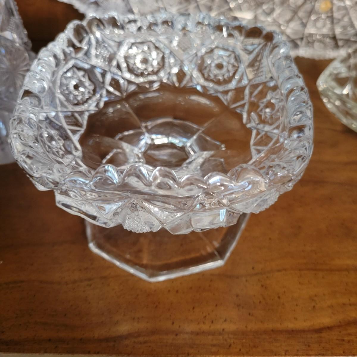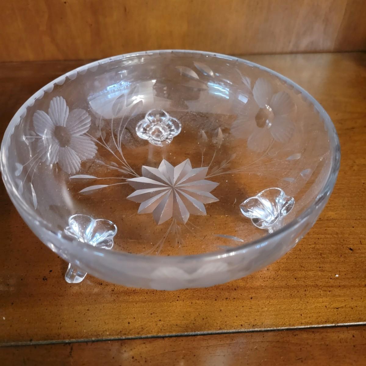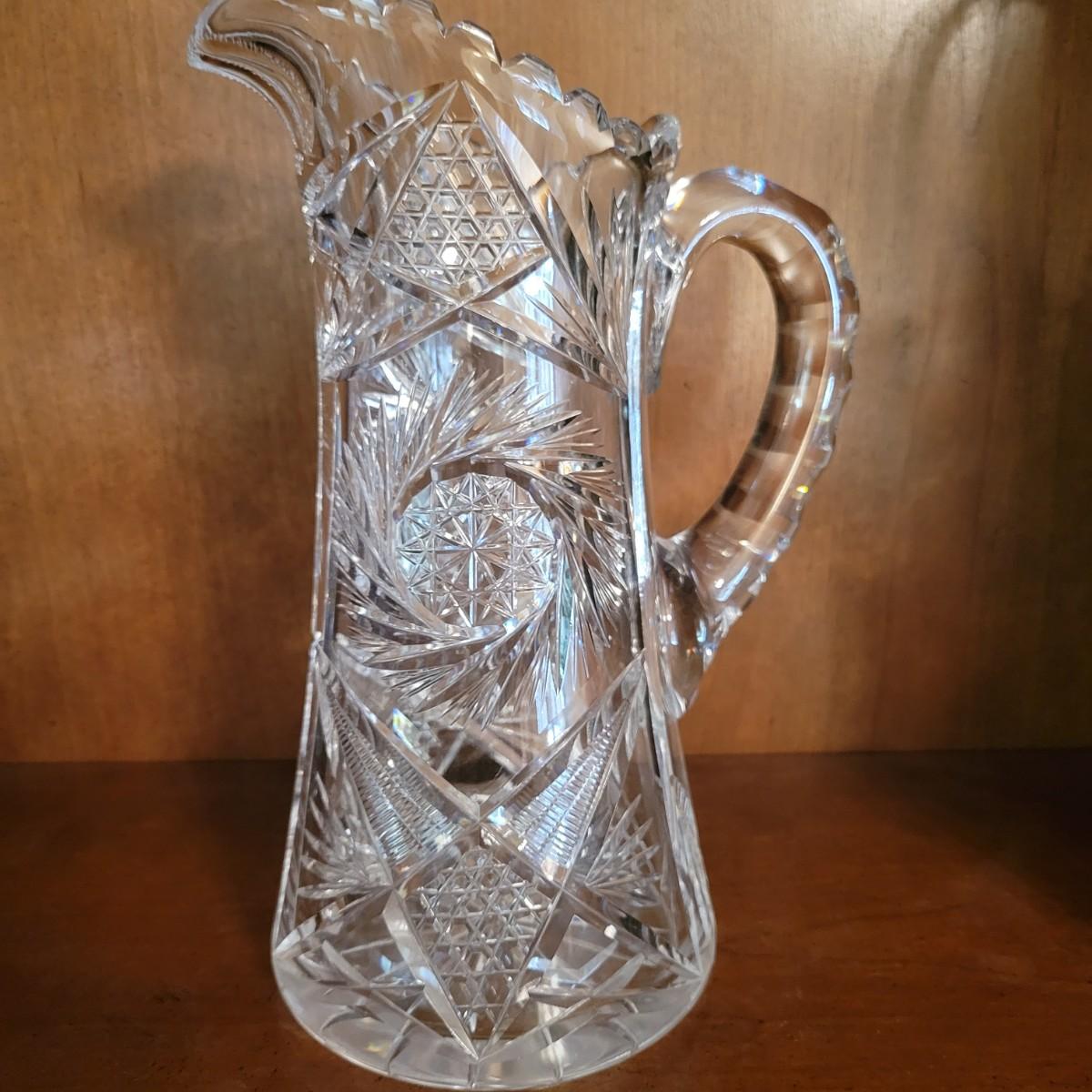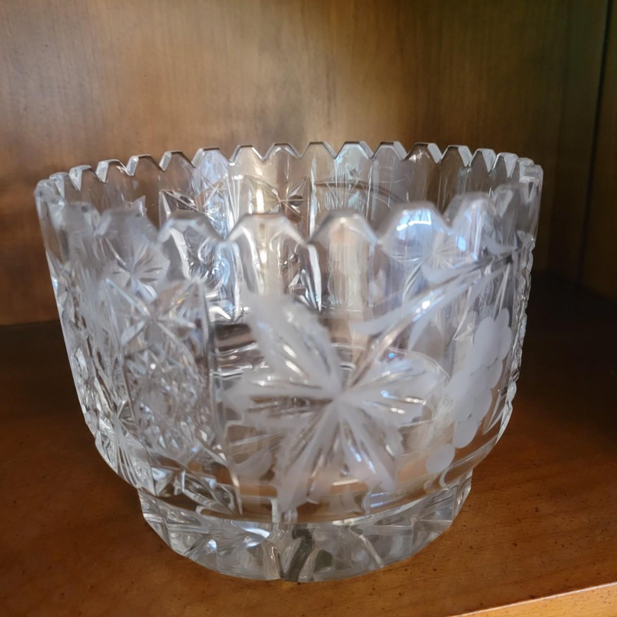 An assortment of etched and cut glass ranging from platters and bowls to pitchers and vases. The largest piece is a vase that measures approximately 6"D x 10"H and is the last item pictured. 17 pieces total are included in this lot. Local pickup only