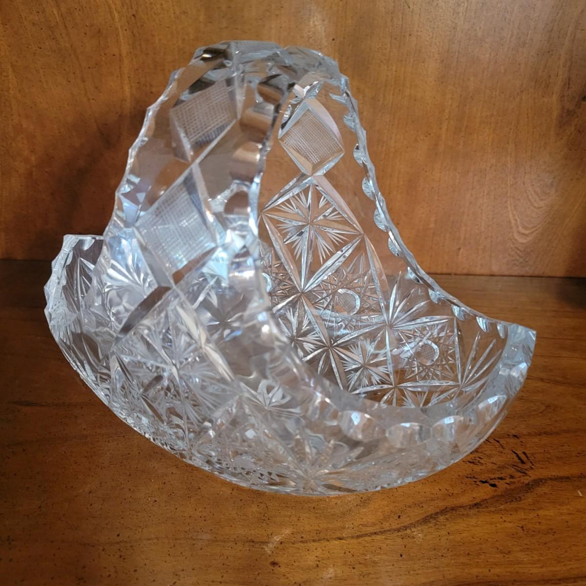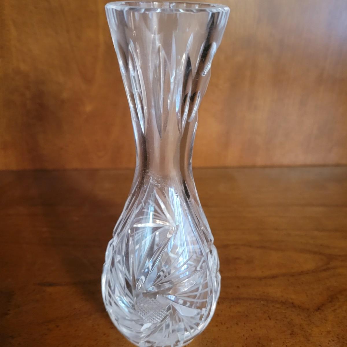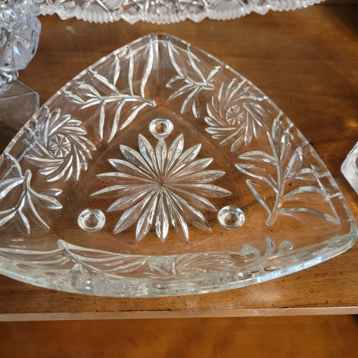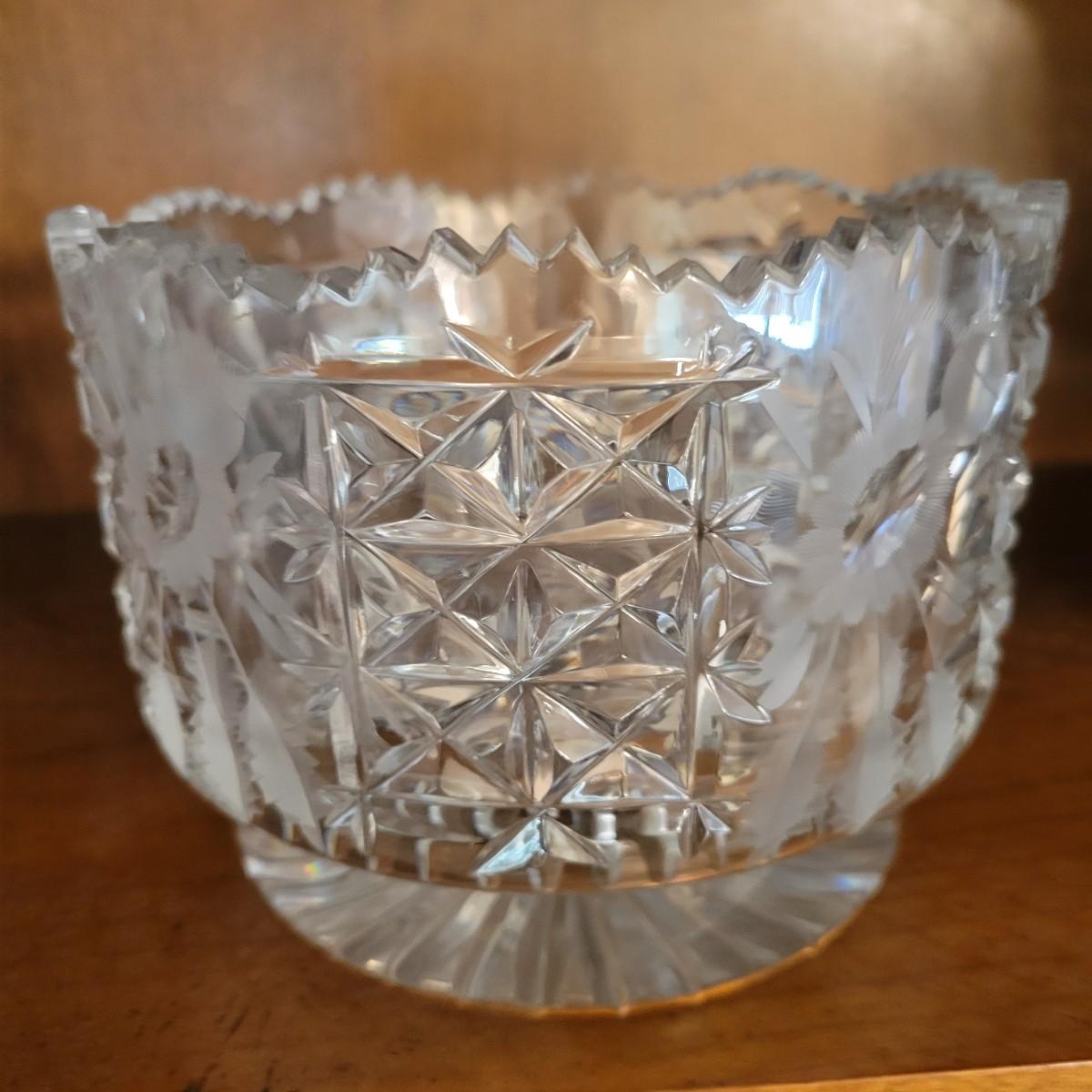 An assortment of etched and cut glass ranging from platters and bowls to pitchers and vases. The largest piece is a vase that measures approximately 6"D x 10"H and is the last item pictured. 17 pieces total are included in this lot. Local pickup only
