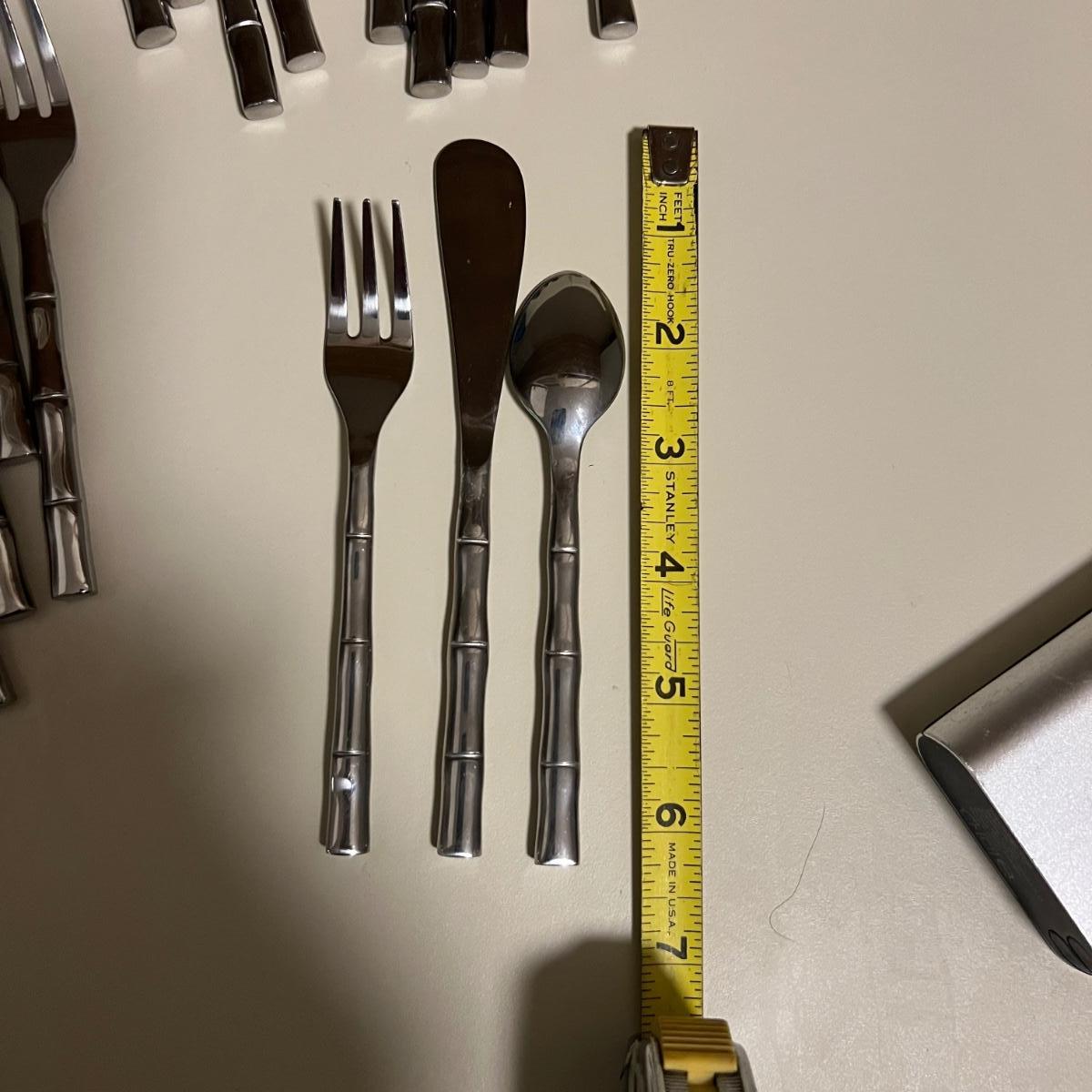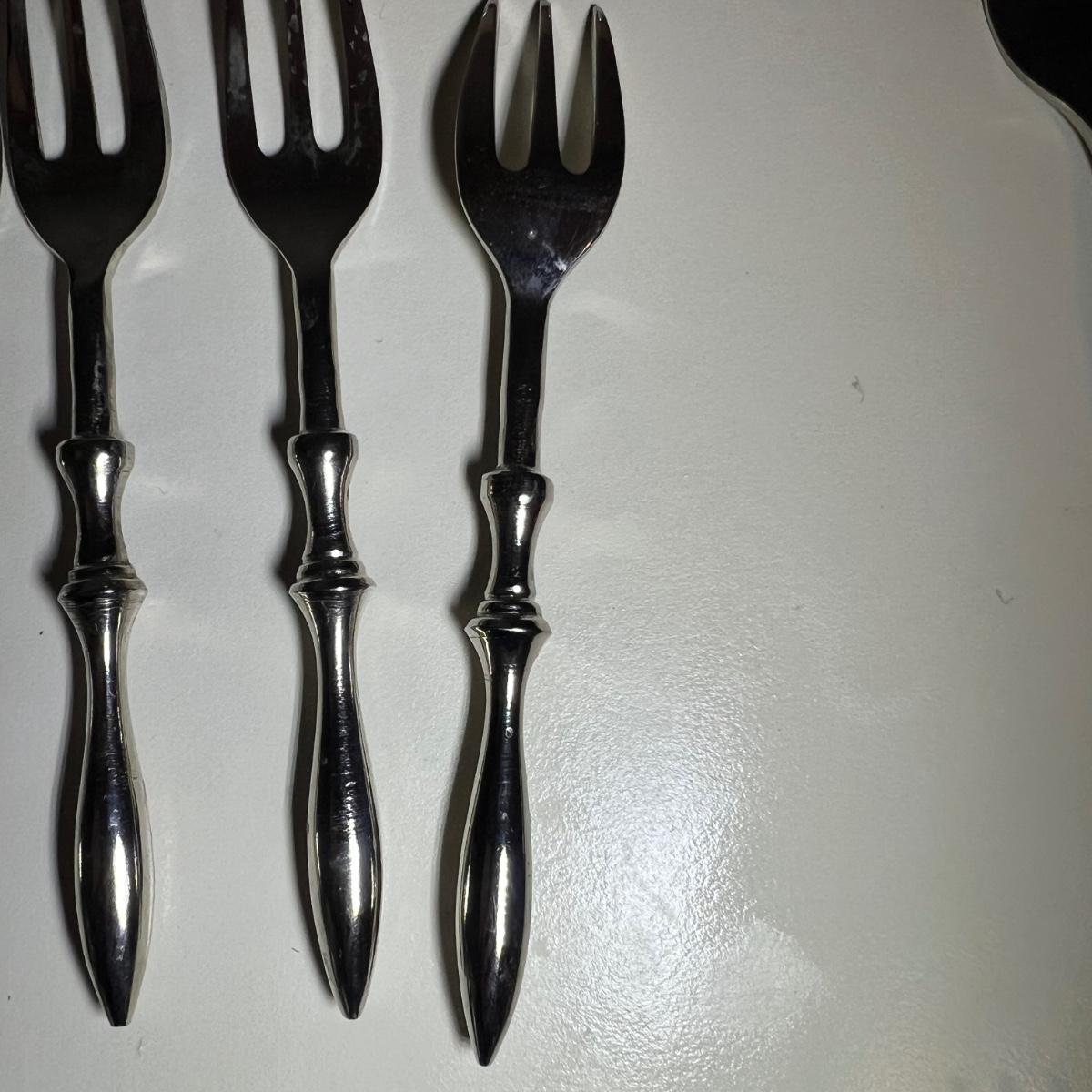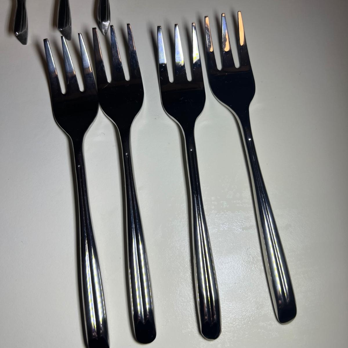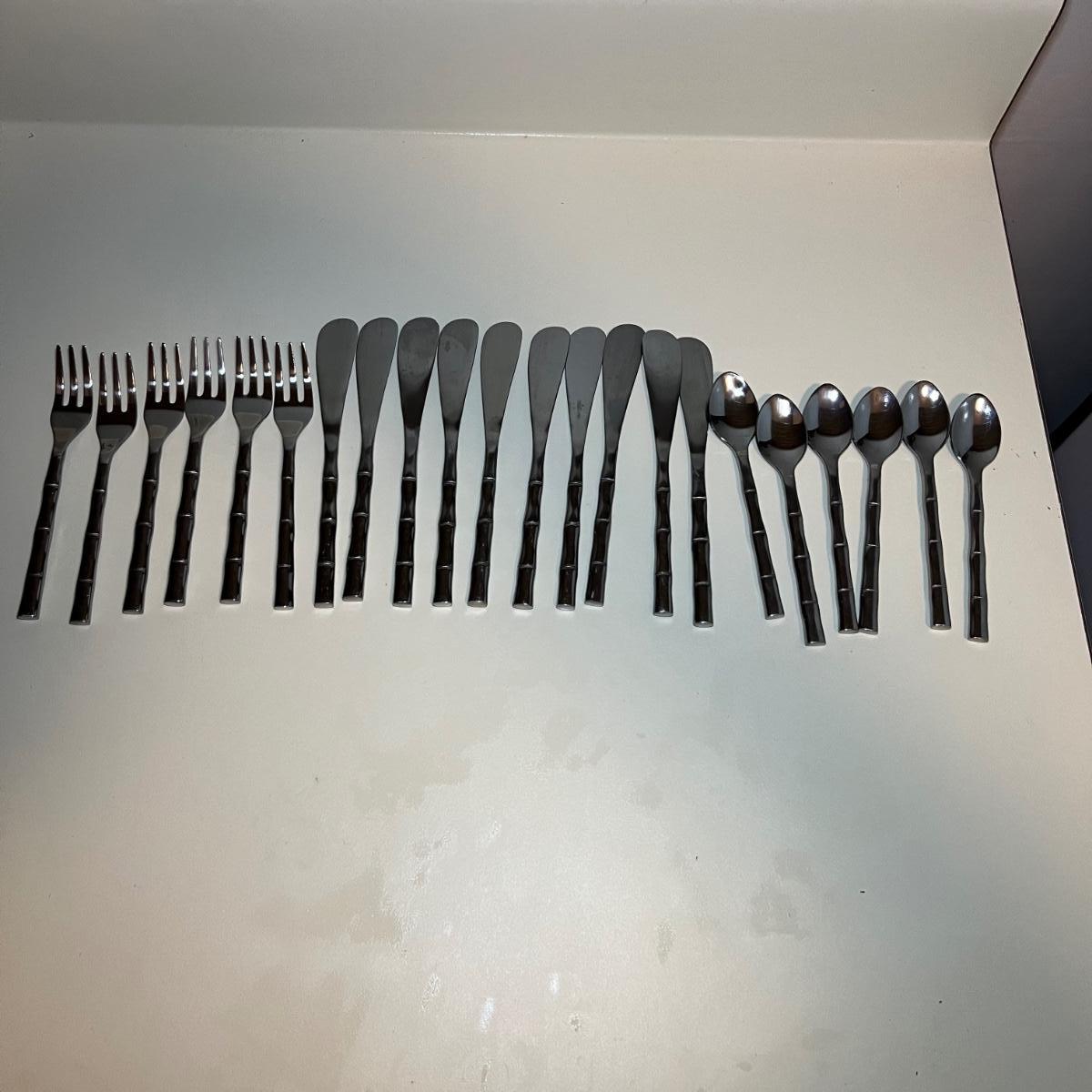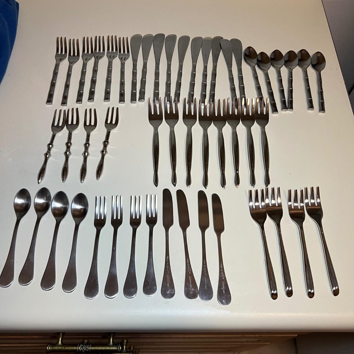 Five varieties of dessert cutlery includes a set by Food Network which contains four each of knives, forks and spoons. The other pieces are all unmarked. The largest set has a sugar cane style design and includes 6 forks, 10 knives and 5 spoons. The largest knife measures 6” long.