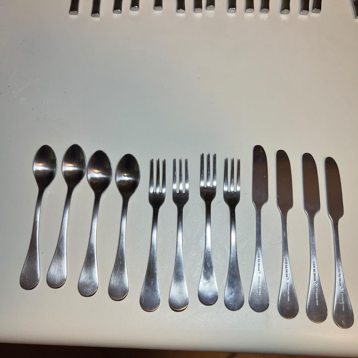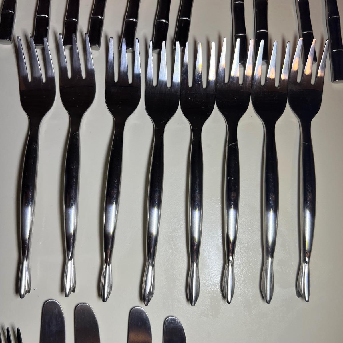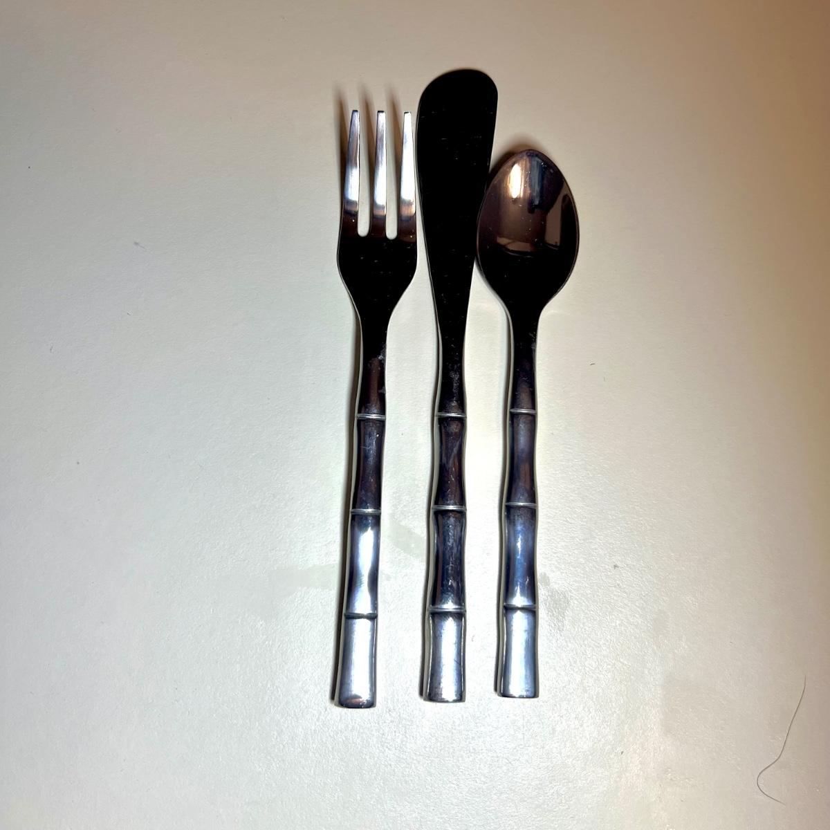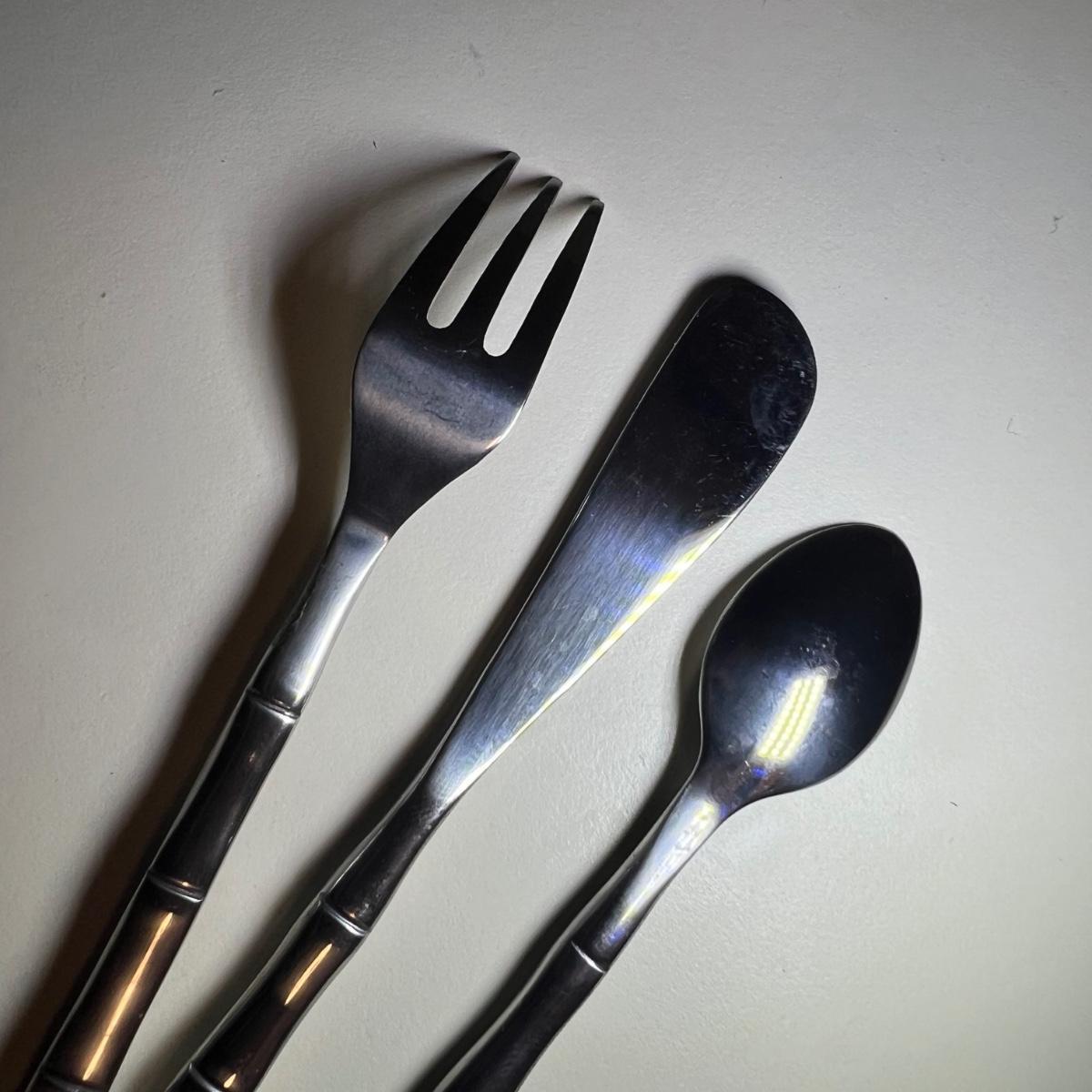 Five varieties of dessert cutlery includes a set by Food Network which contains four each of knives, forks and spoons. The other pieces are all unmarked. The largest set has a sugar cane style design and includes 6 forks, 10 knives and 5 spoons. The largest knife measures 6” long.
