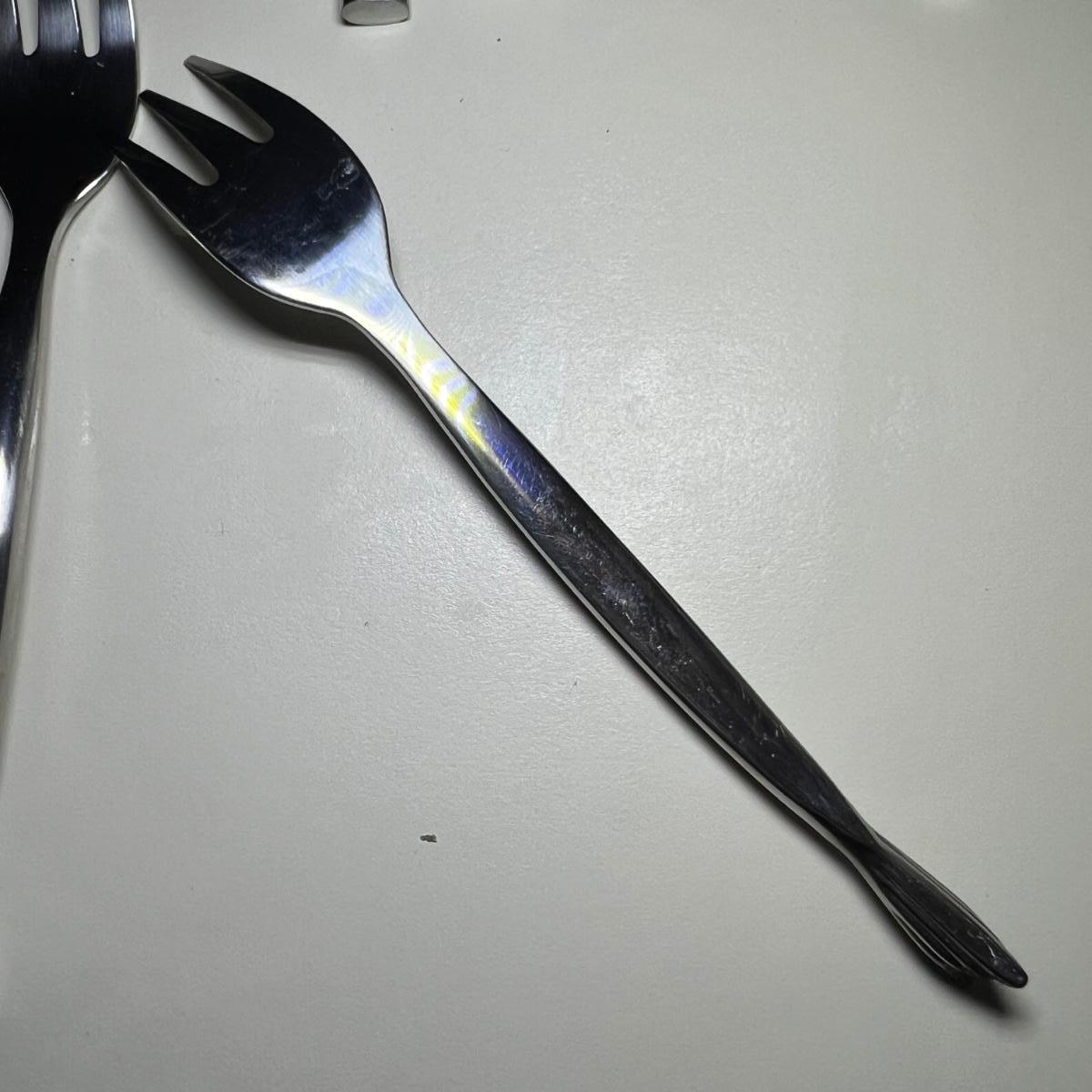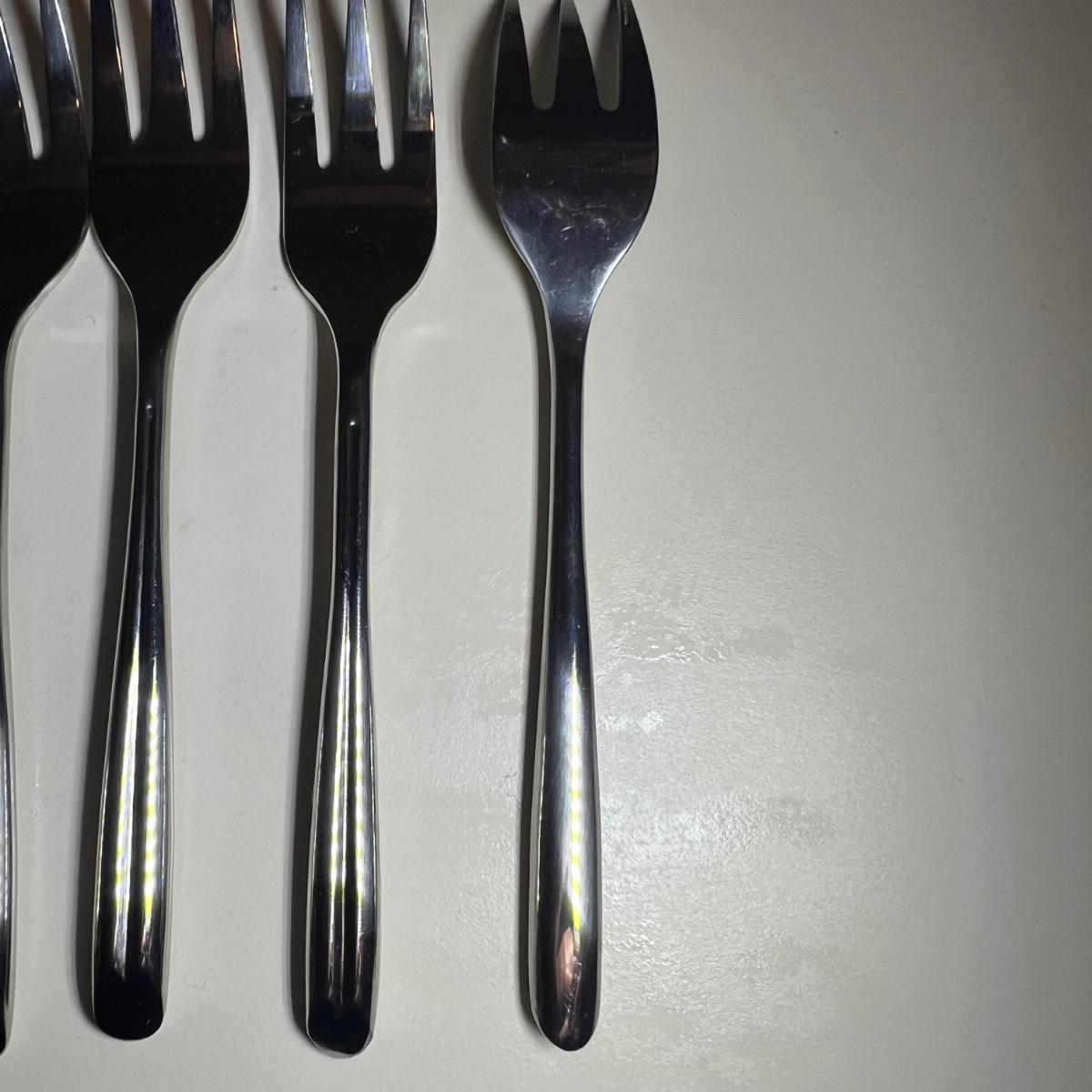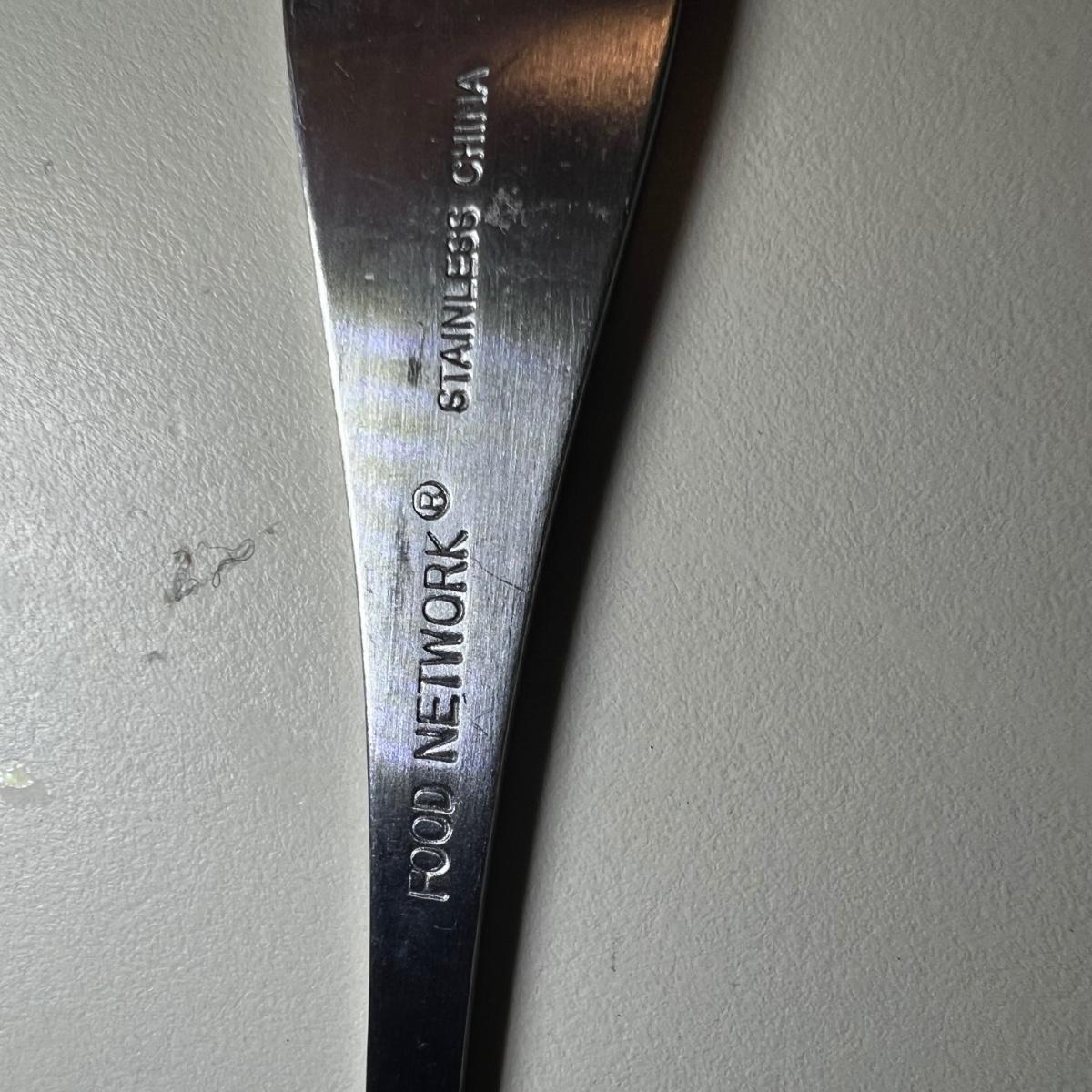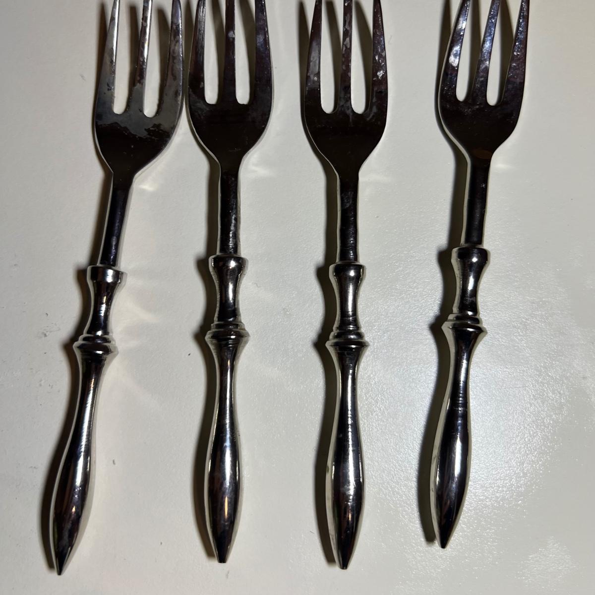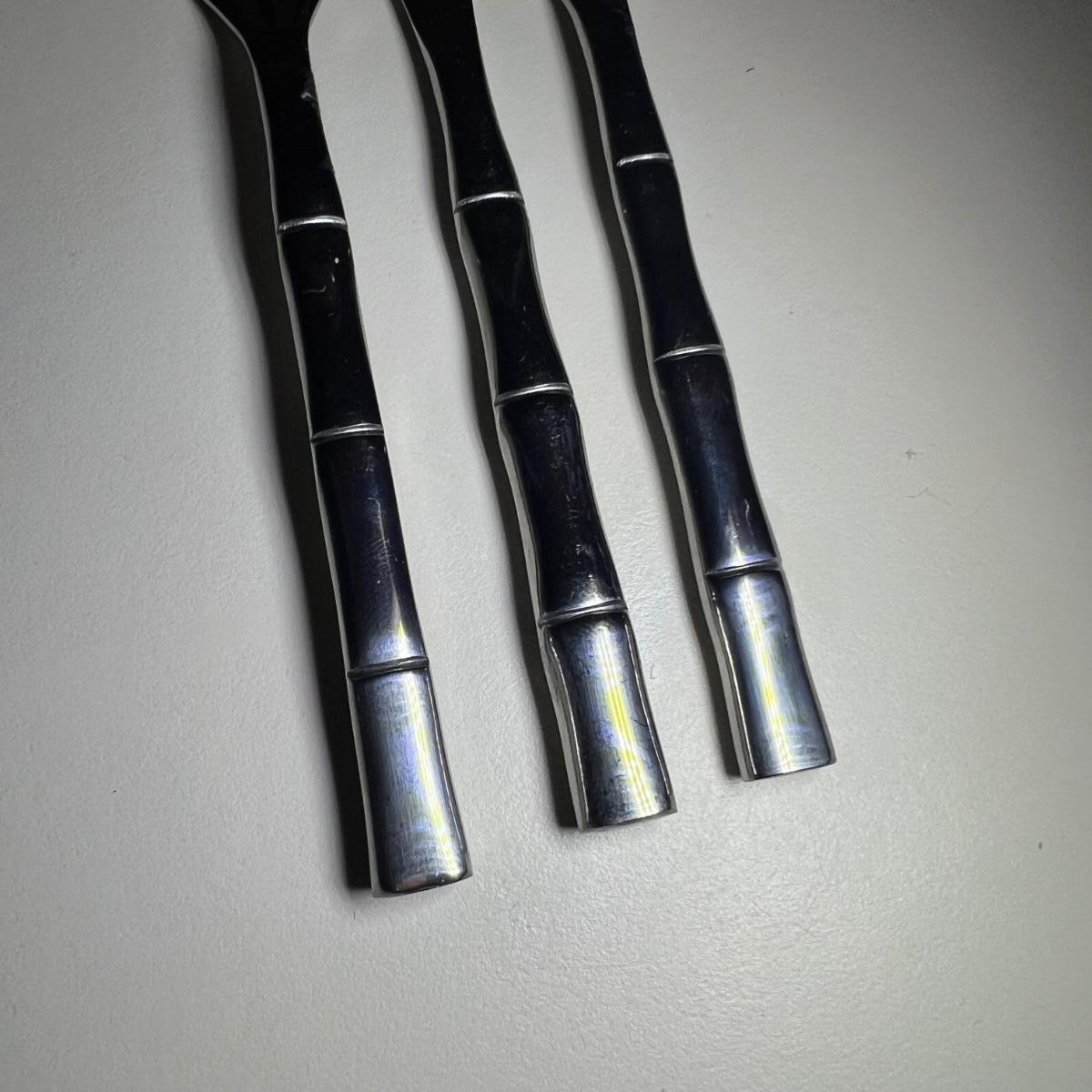 Five varieties of dessert cutlery includes a set by Food Network which contains four each of knives, forks and spoons. The other pieces are all unmarked. The largest set has a sugar cane style design and includes 6 forks, 10 knives and 5 spoons. The largest knife measures 6” long.