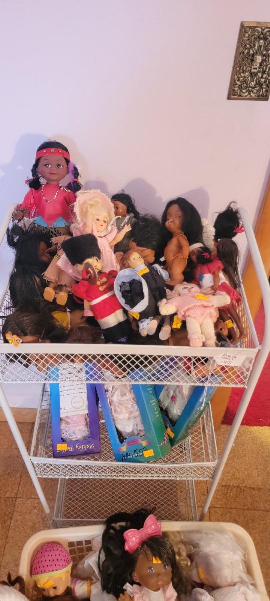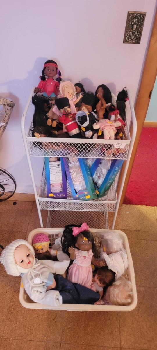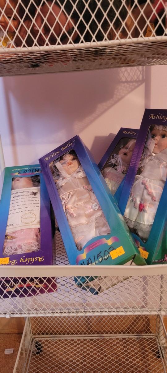 Ashley Belle boxed dolls, Other small and larger dolls. Shelf unit and clothing basket excluded