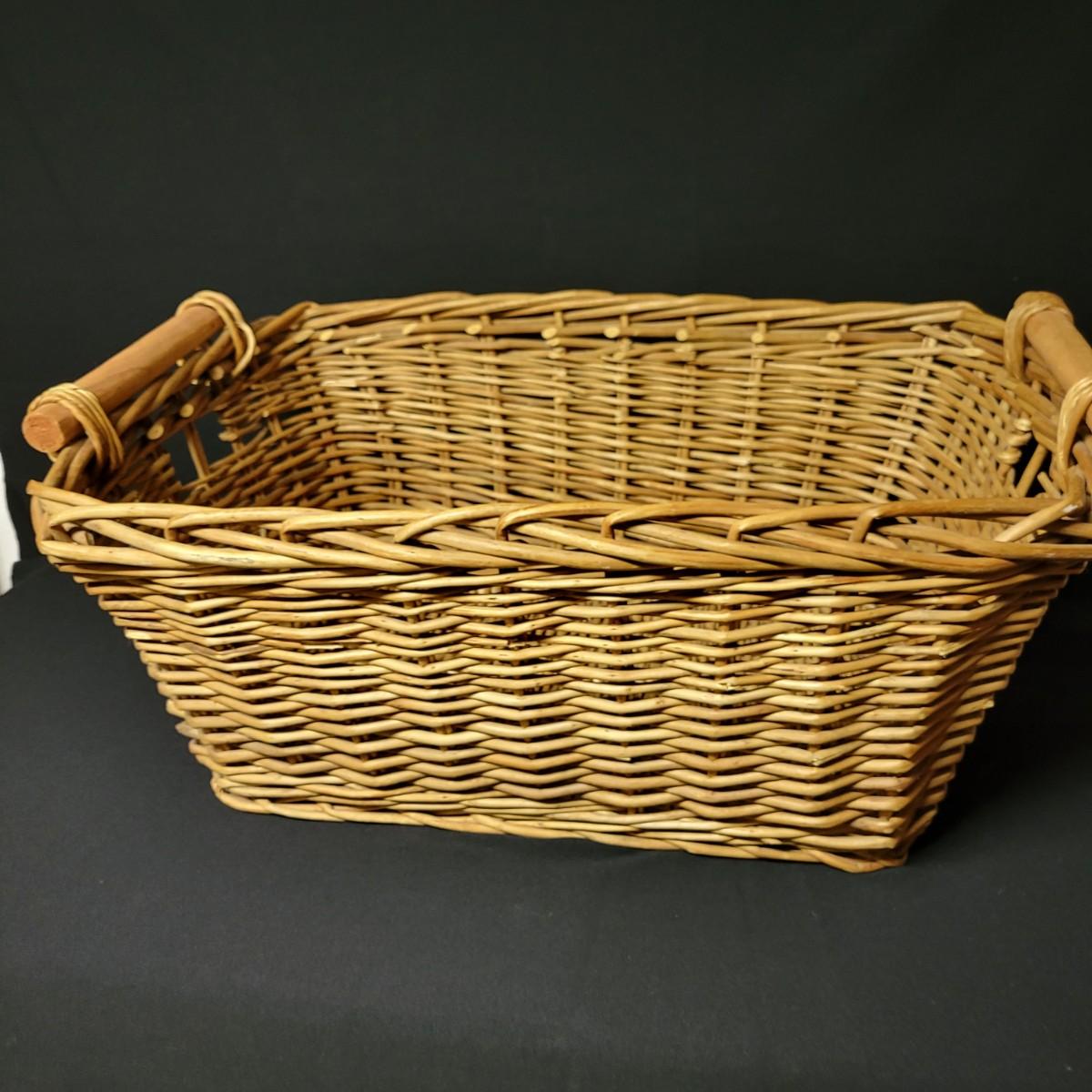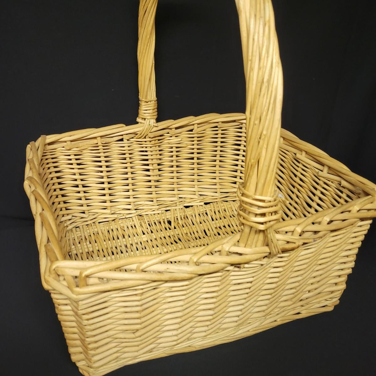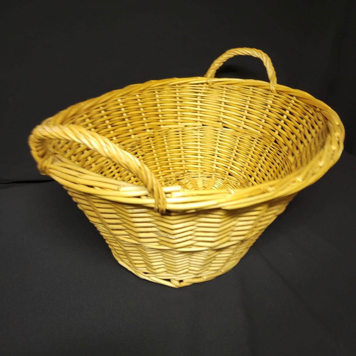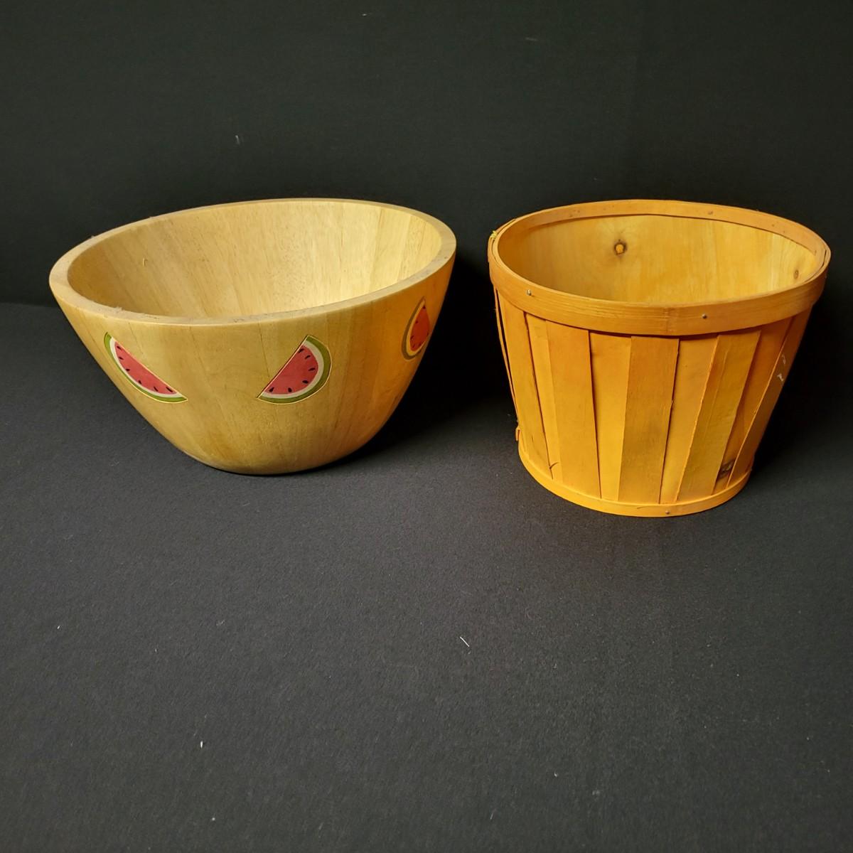 An assortment of eleven baskets in a variety of sizes and materials that are in good condition with minimal damage. Most are made of wicker, but some are also made of stripped wood. One wooden bowl with handpainted watermelons. Lot also includes a box of silk flowers and fruit. Largest basket measures approximately 28" x 21" x 12.5" Local pickup only