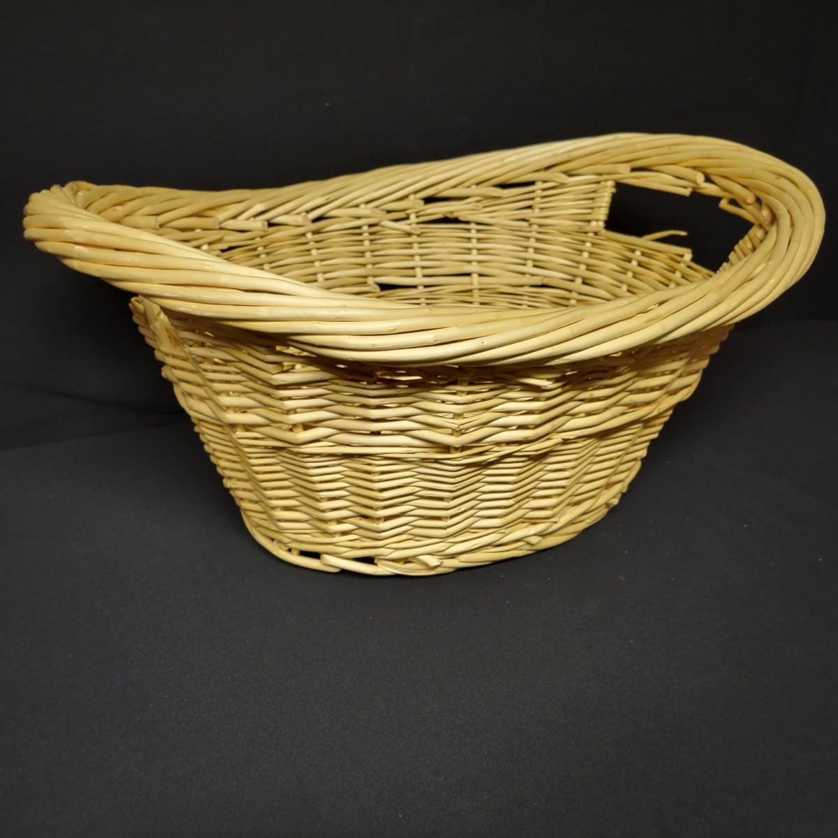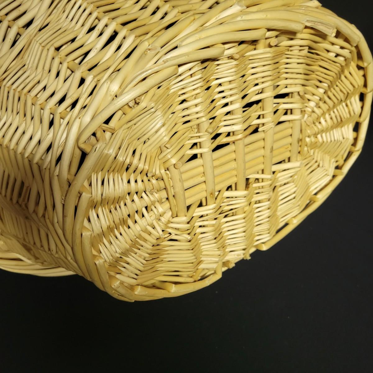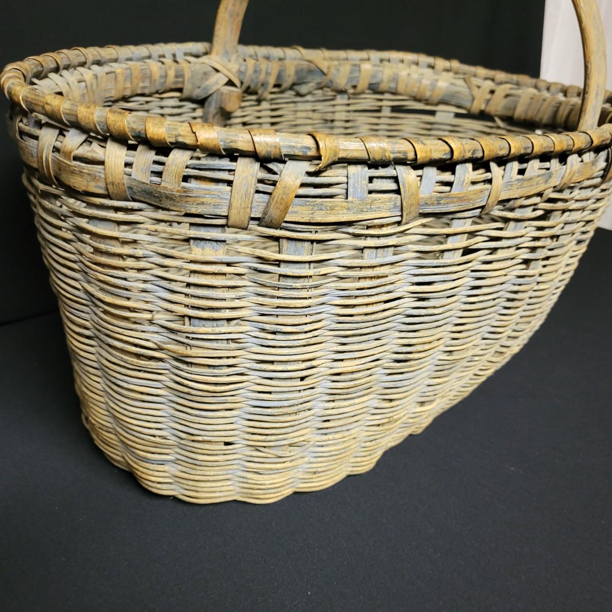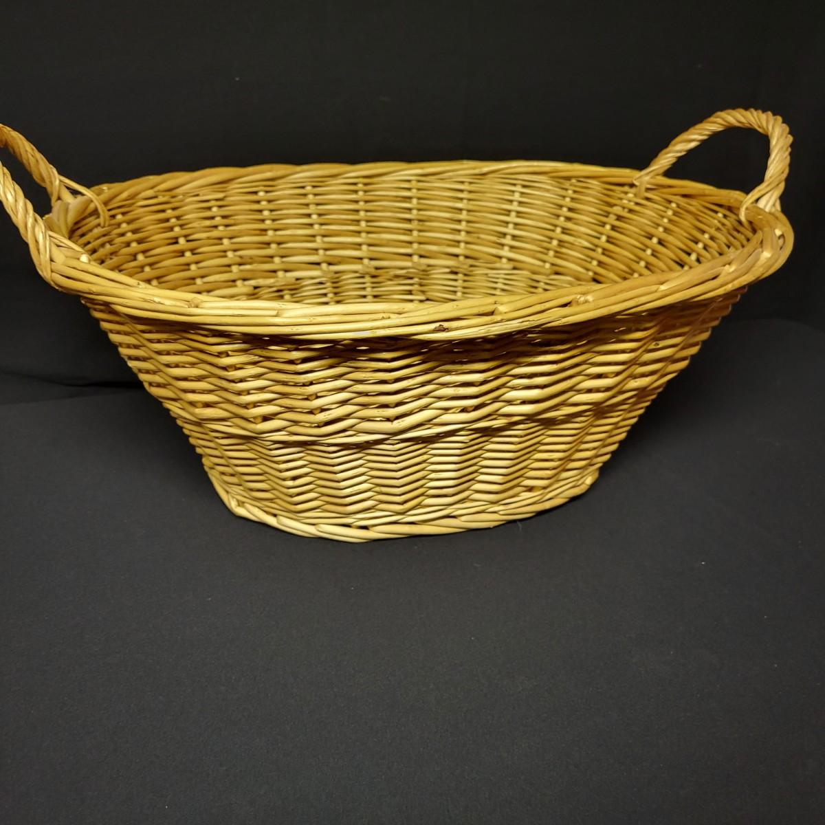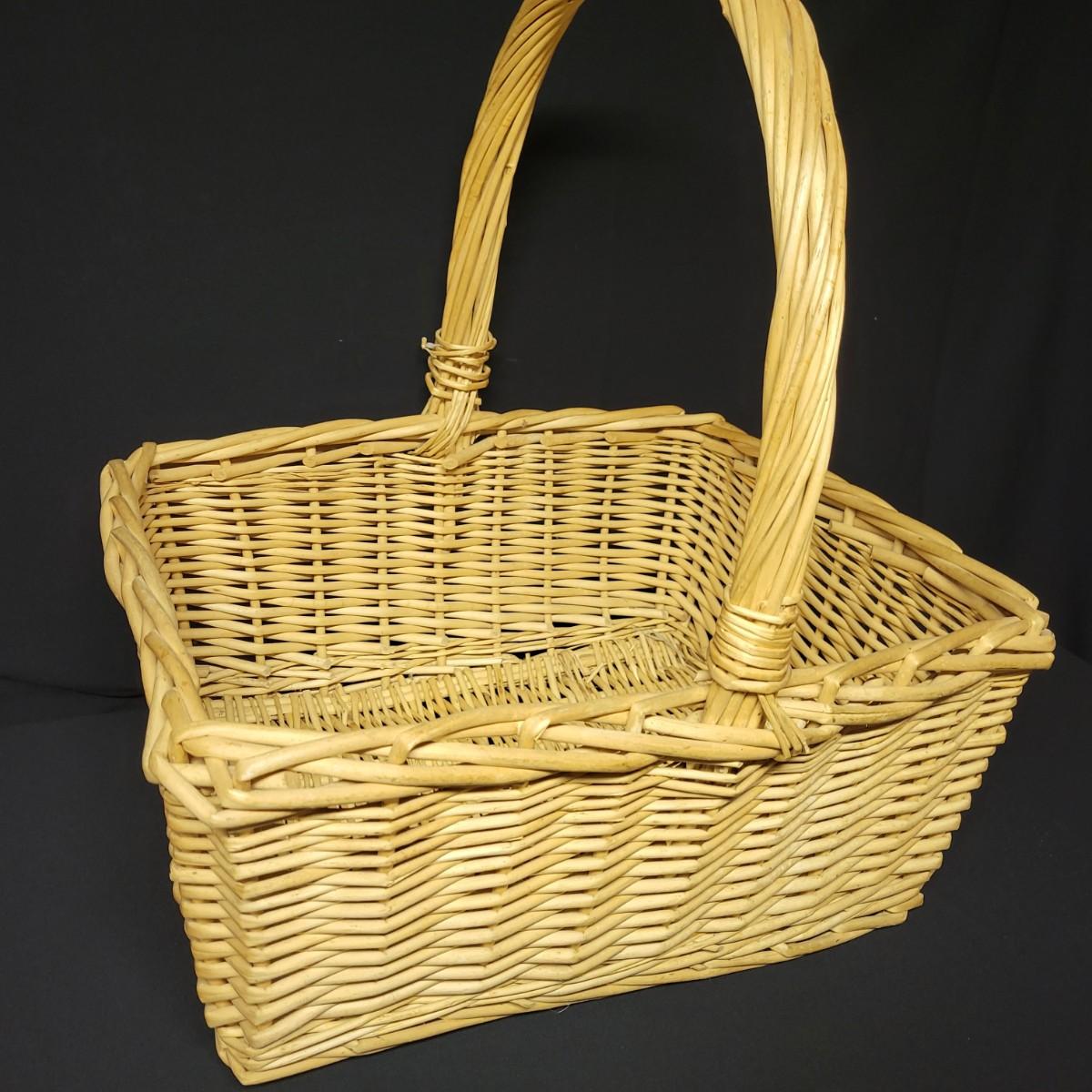 An assortment of eleven baskets in a variety of sizes and materials that are in good condition with minimal damage. Most are made of wicker, but some are also made of stripped wood. One wooden bowl with handpainted watermelons. Lot also includes a box of silk flowers and fruit. Largest basket measures approximately 28" x 21" x 12.5" Local pickup only