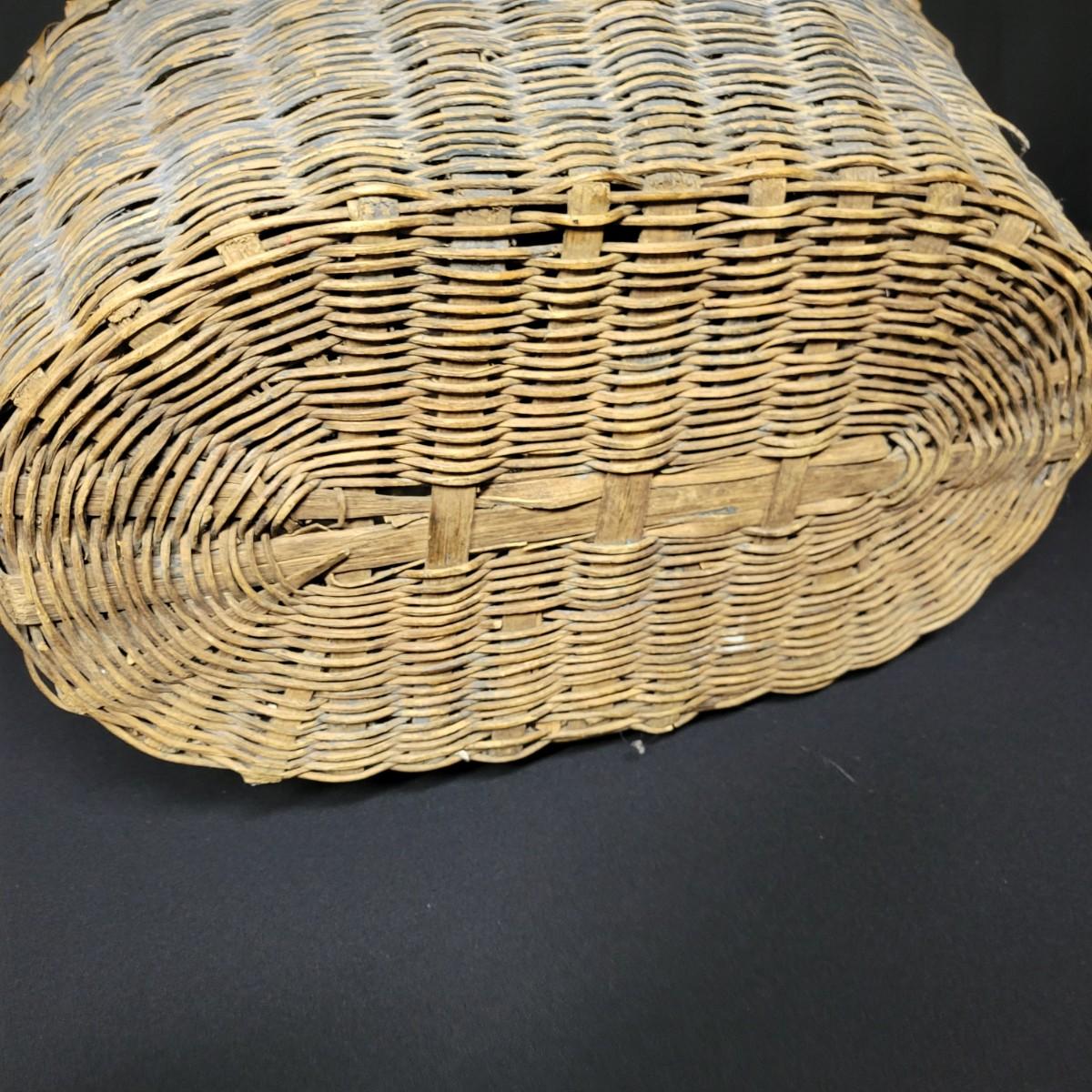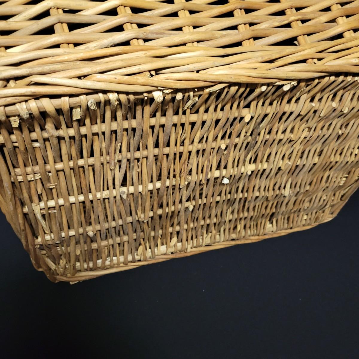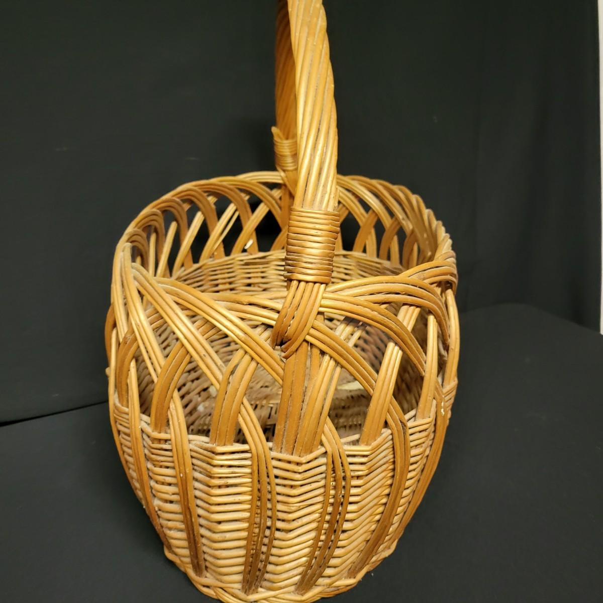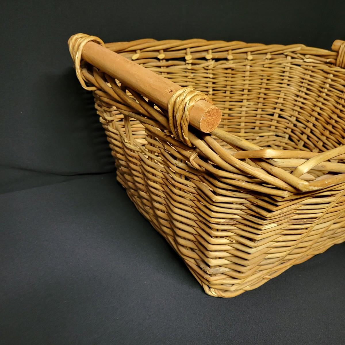 An assortment of eleven baskets in a variety of sizes and materials that are in good condition with minimal damage. Most are made of wicker, but some are also made of stripped wood. One wooden bowl with handpainted watermelons. Lot also includes a box of silk flowers and fruit. Largest basket measures approximately 28" x 21" x 12.5" Local pickup only