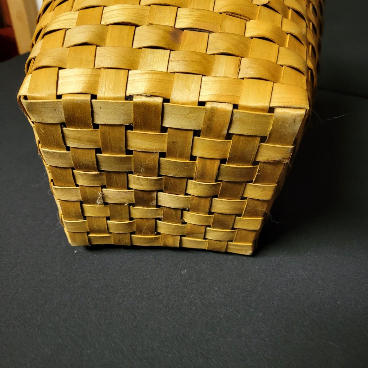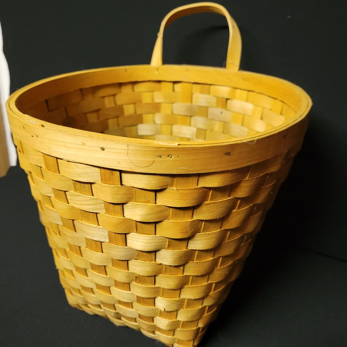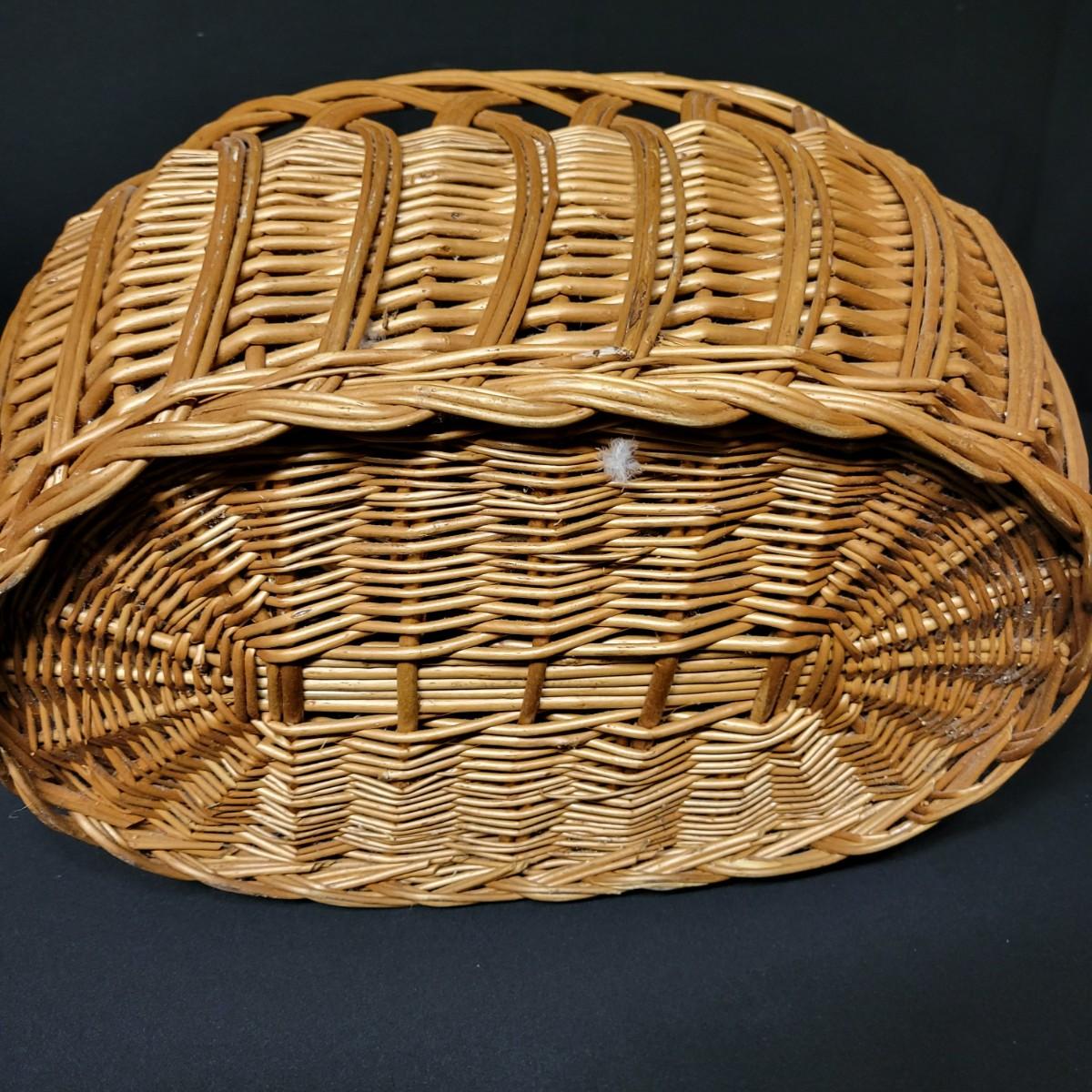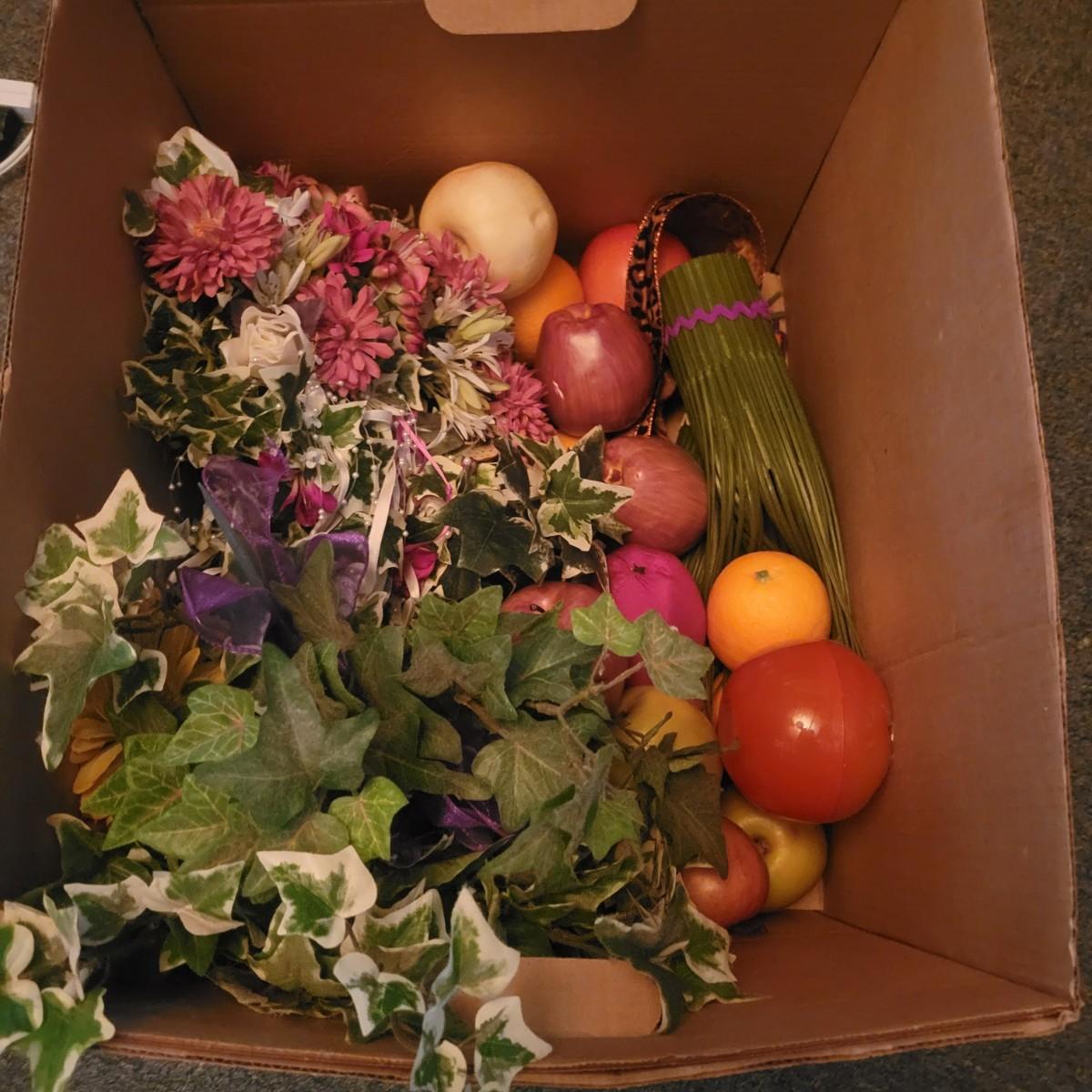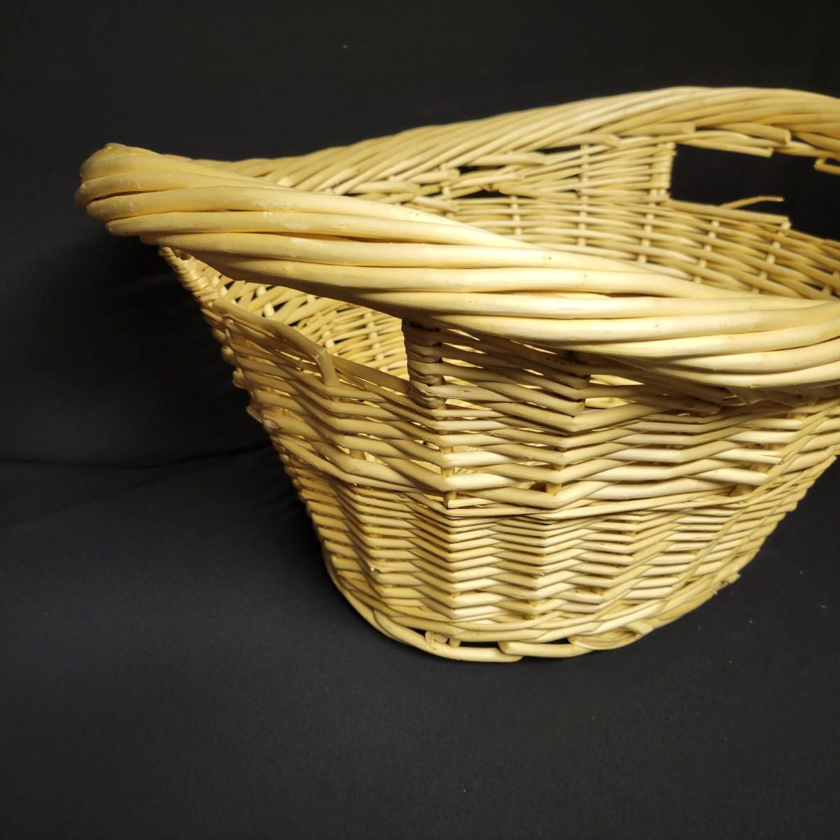 An assortment of eleven baskets in a variety of sizes and materials that are in good condition with minimal damage. Most are made of wicker, but some are also made of stripped wood. One wooden bowl with handpainted watermelons. Lot also includes a box of silk flowers and fruit. Largest basket measures approximately 28" x 21" x 12.5" Local pickup only