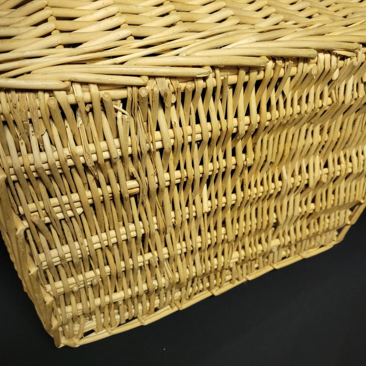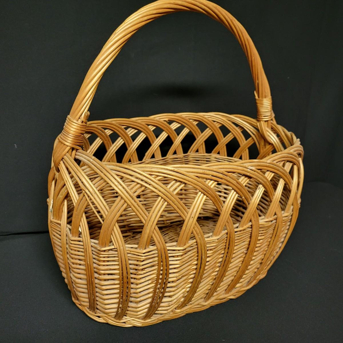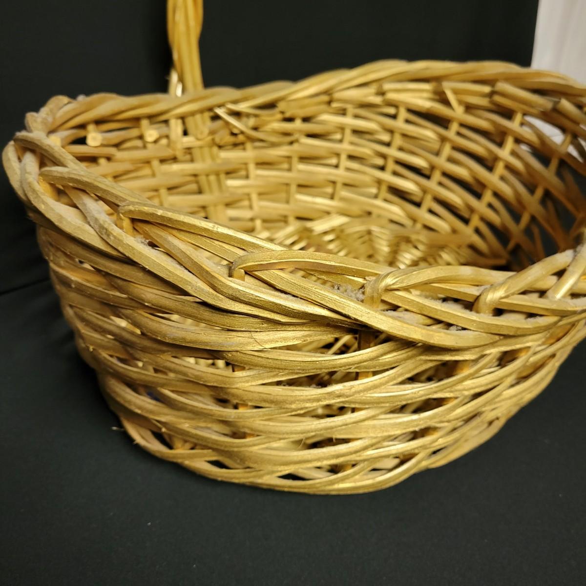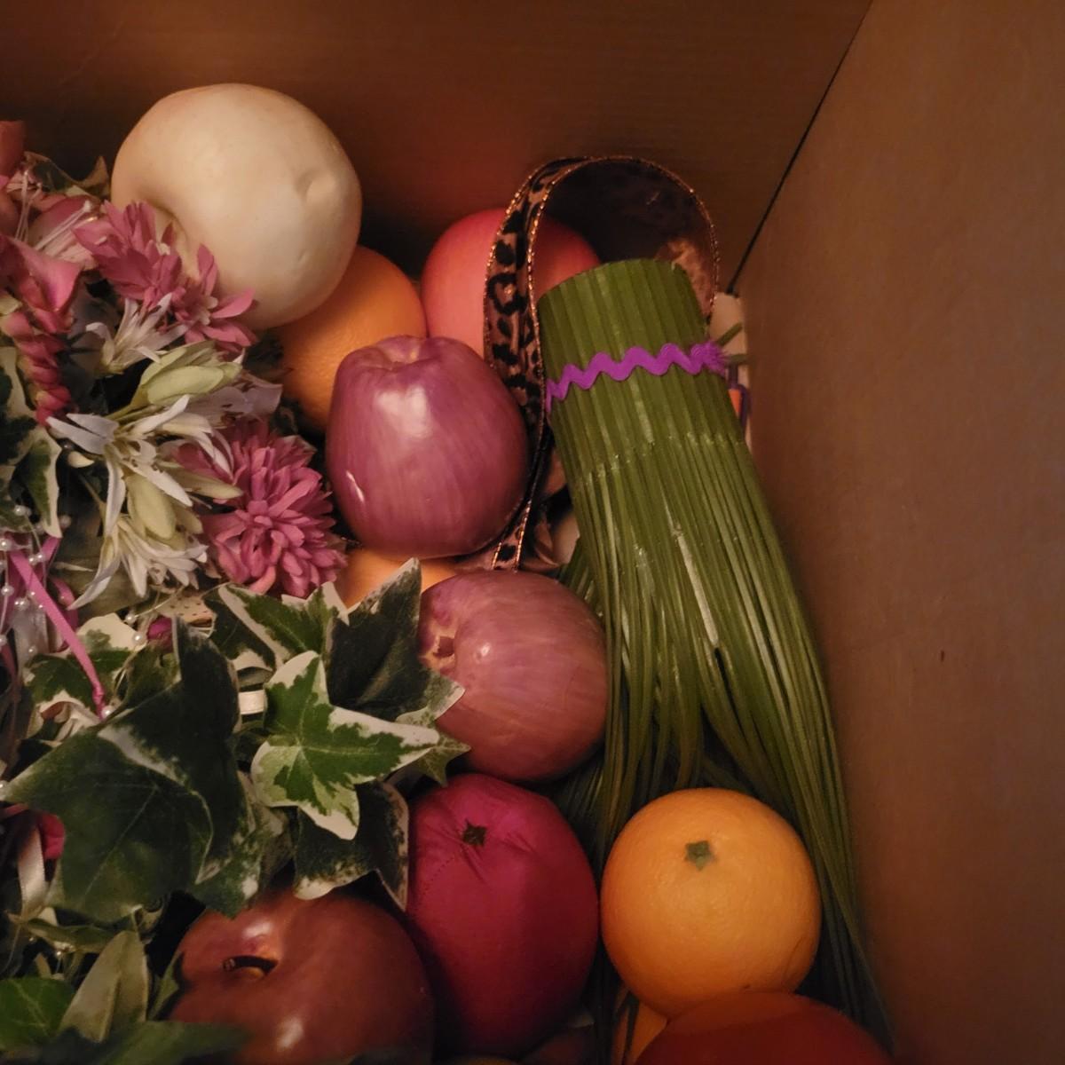 An assortment of eleven baskets in a variety of sizes and materials that are in good condition with minimal damage. Most are made of wicker, but some are also made of stripped wood. One wooden bowl with handpainted watermelons. Lot also includes a box of silk flowers and fruit. Largest basket measures approximately 28" x 21" x 12.5" Local pickup only
