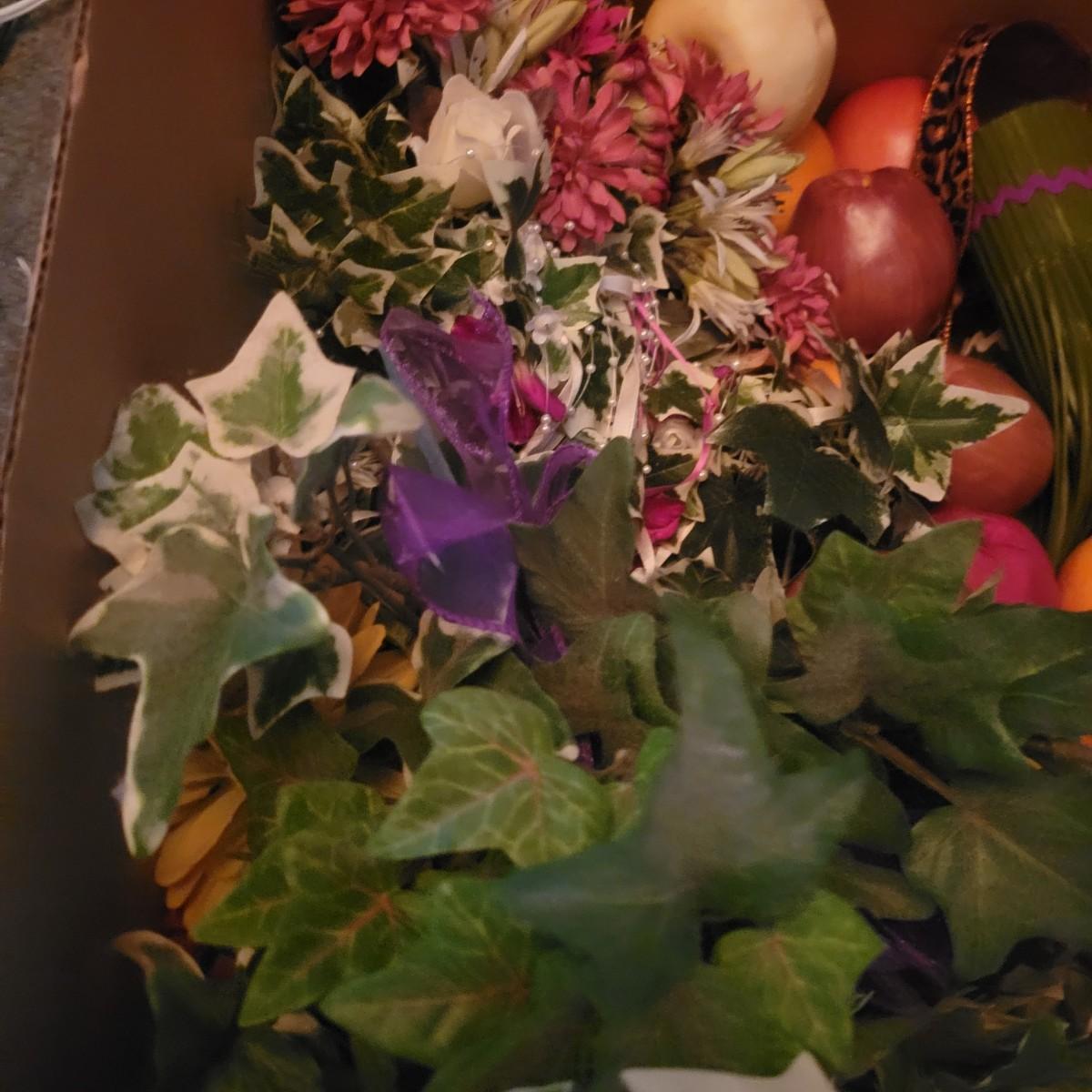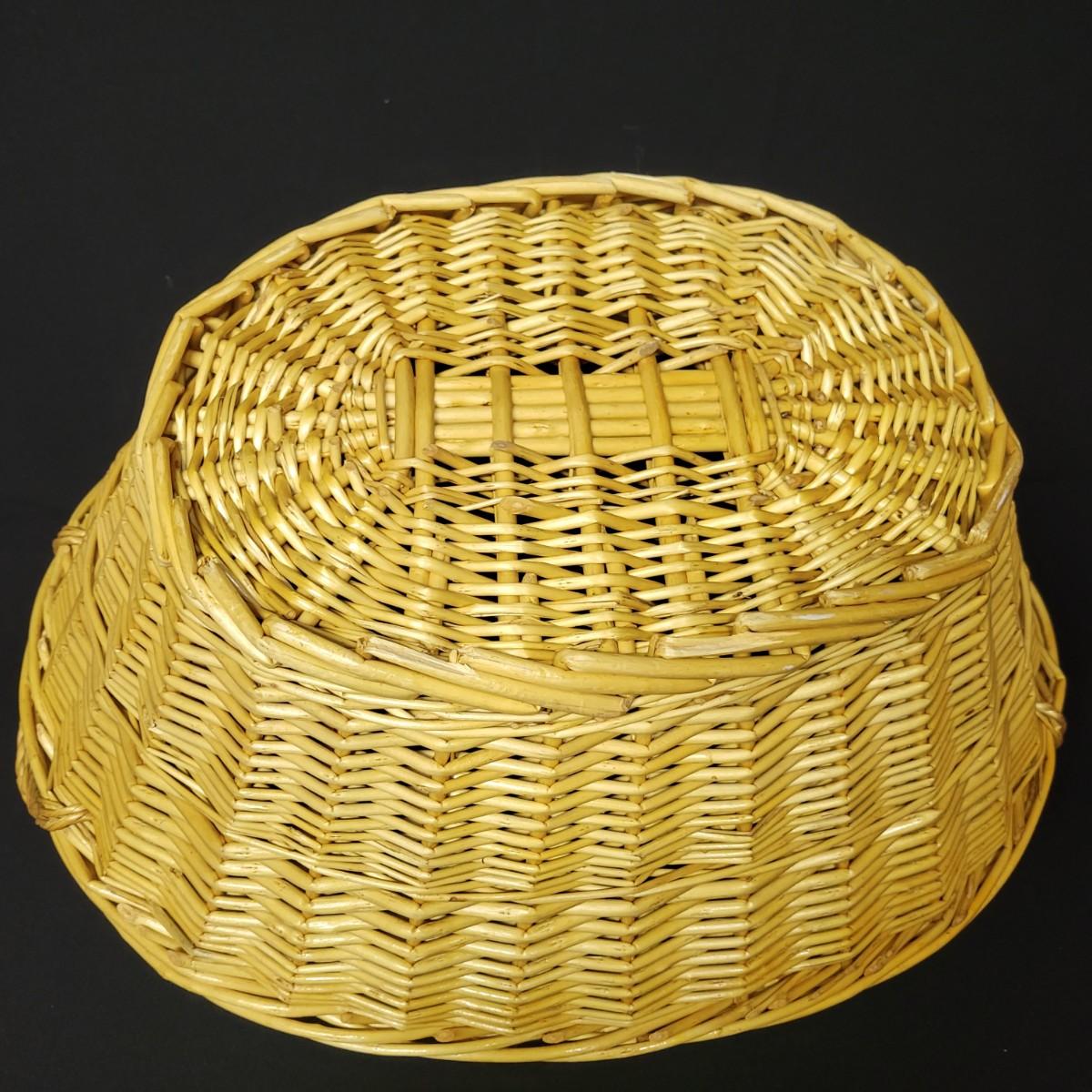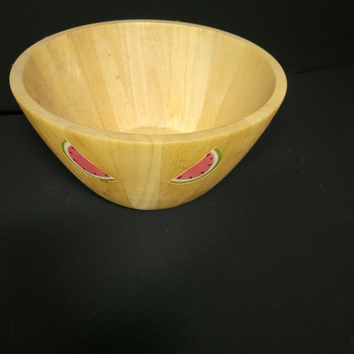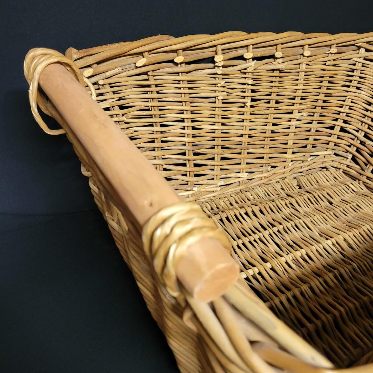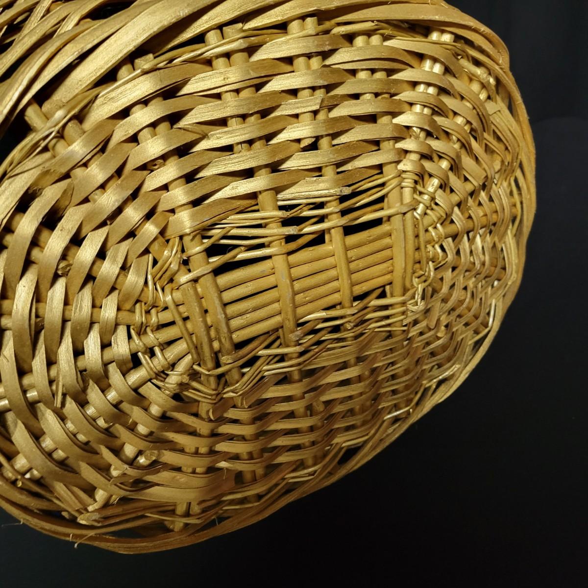 An assortment of eleven baskets in a variety of sizes and materials that are in good condition with minimal damage. Most are made of wicker, but some are also made of stripped wood. One wooden bowl with handpainted watermelons. Lot also includes a box of silk flowers and fruit. Largest basket measures approximately 28" x 21" x 12.5" Local pickup only