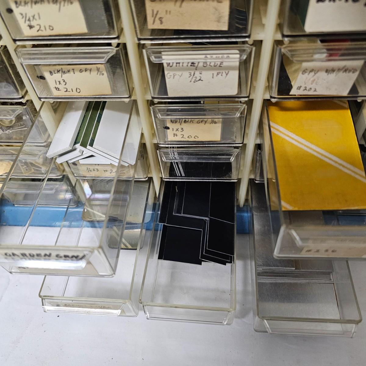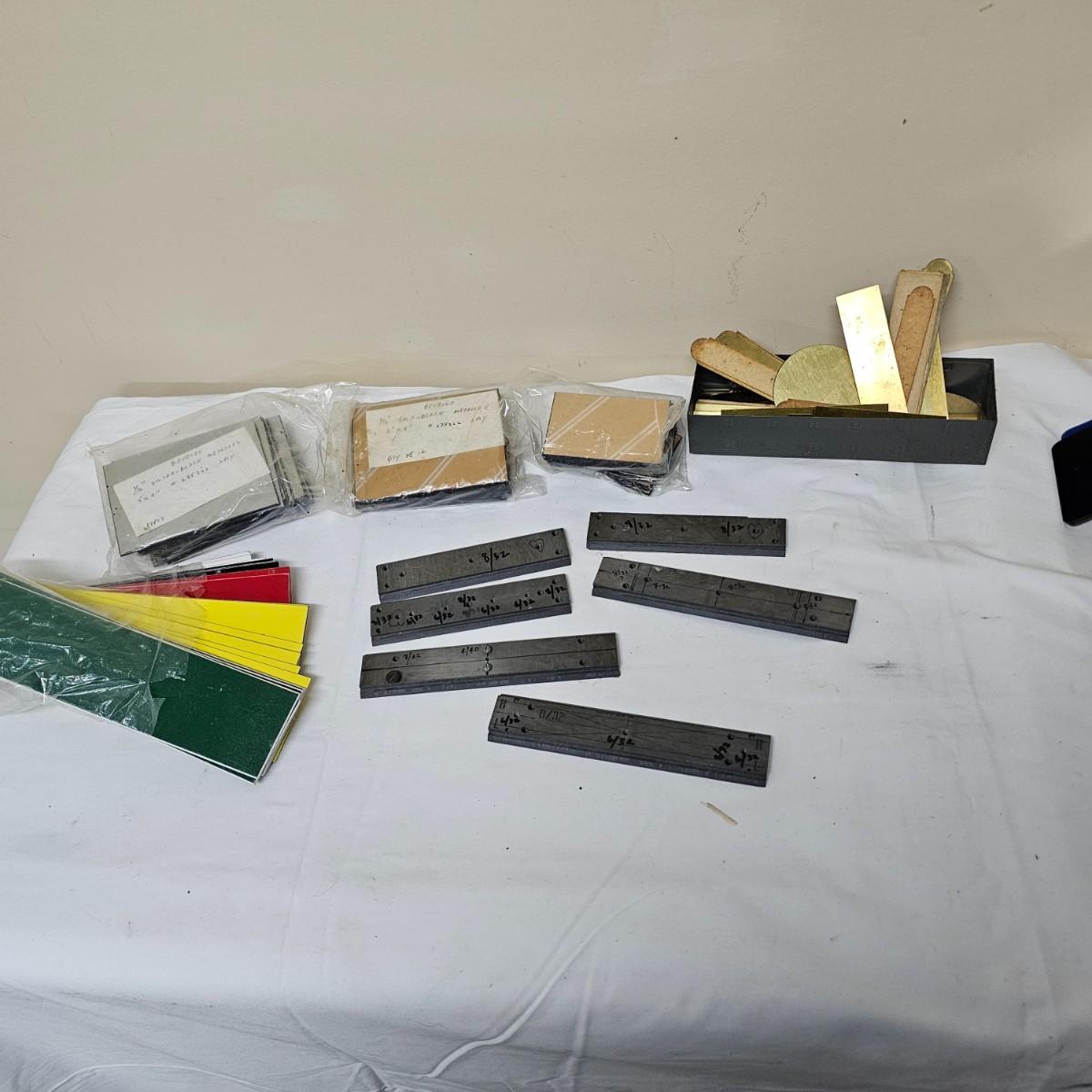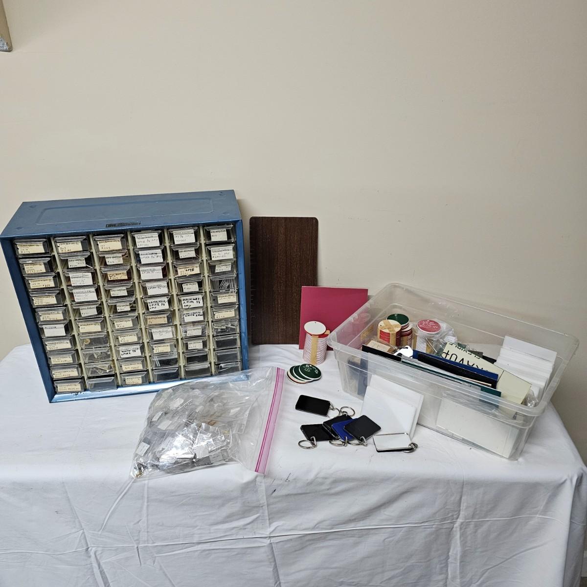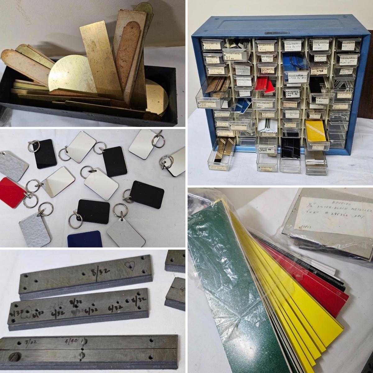 Dozens of plastic and polymer plate pieces, key chains, discs and more for engraving or other. Large assortment of flat pieces various sizes and colors. Gray items with numbers are probably drilling templates. One box of small brass scrap and pieces. A 60 drawer chest full of sorted color and size plates, fittings, backs and such. Large bag of cosmetic silver & gold chains, new in package. Too many pieces to count. See photos for details. Shipping available.