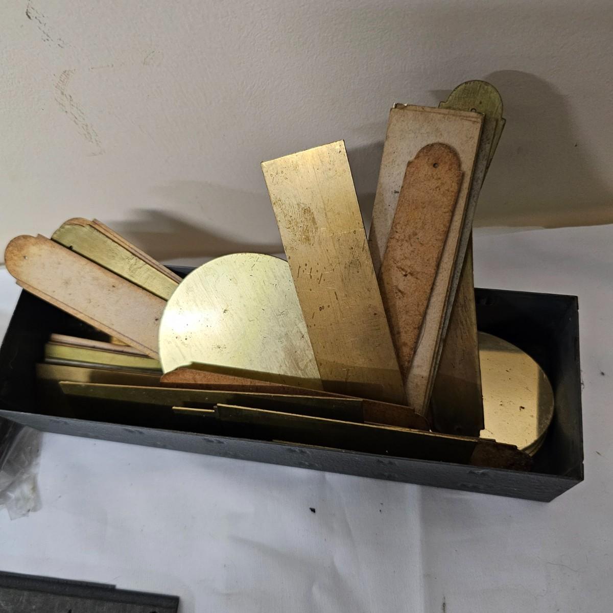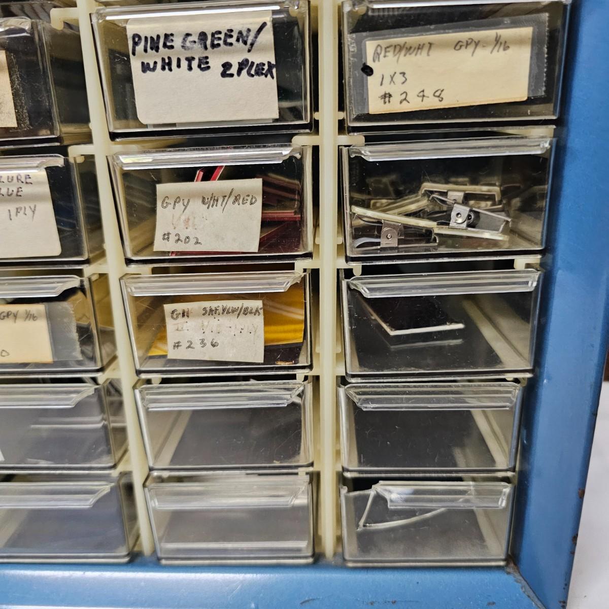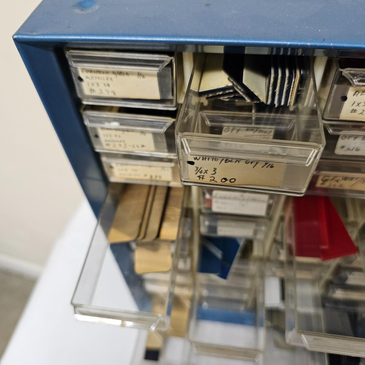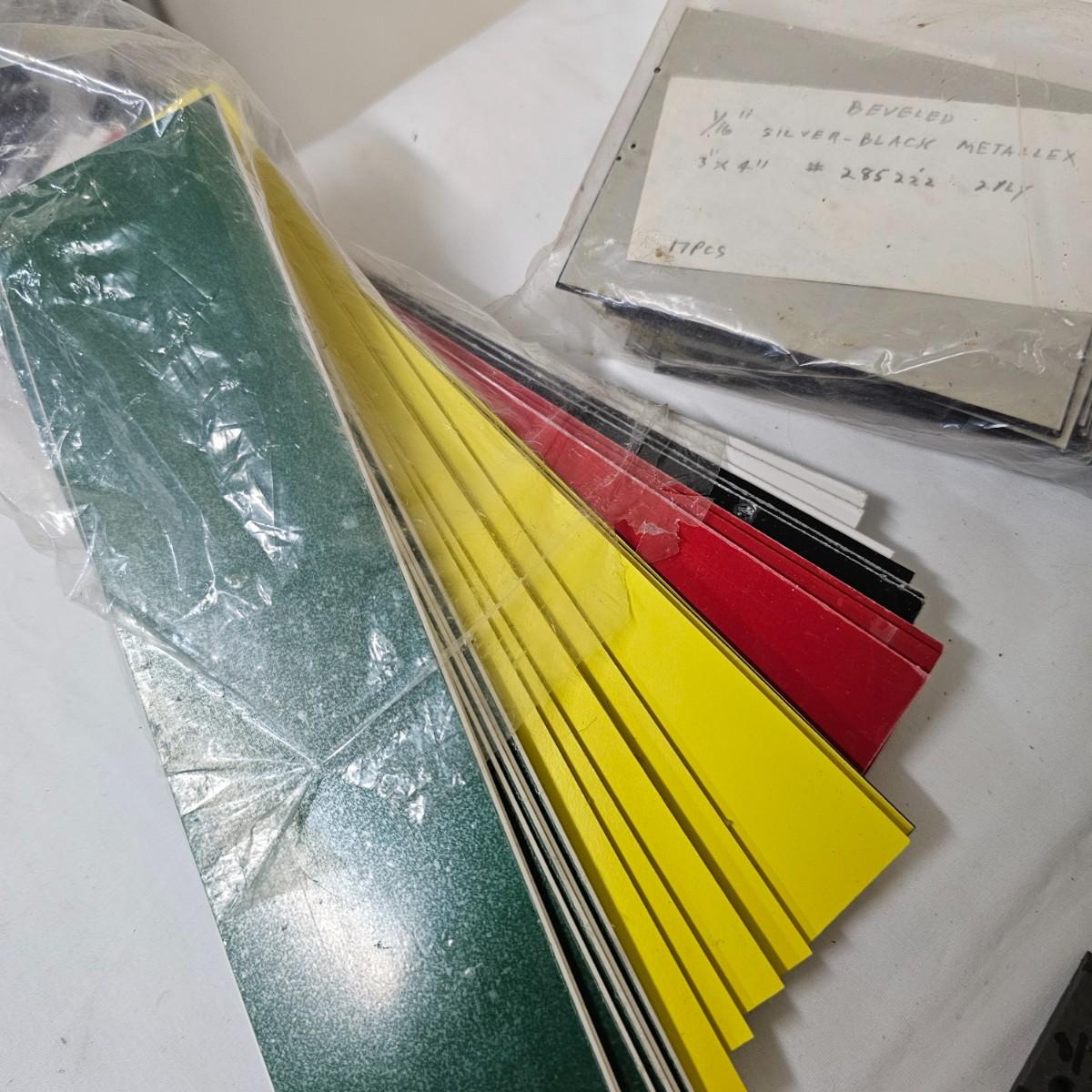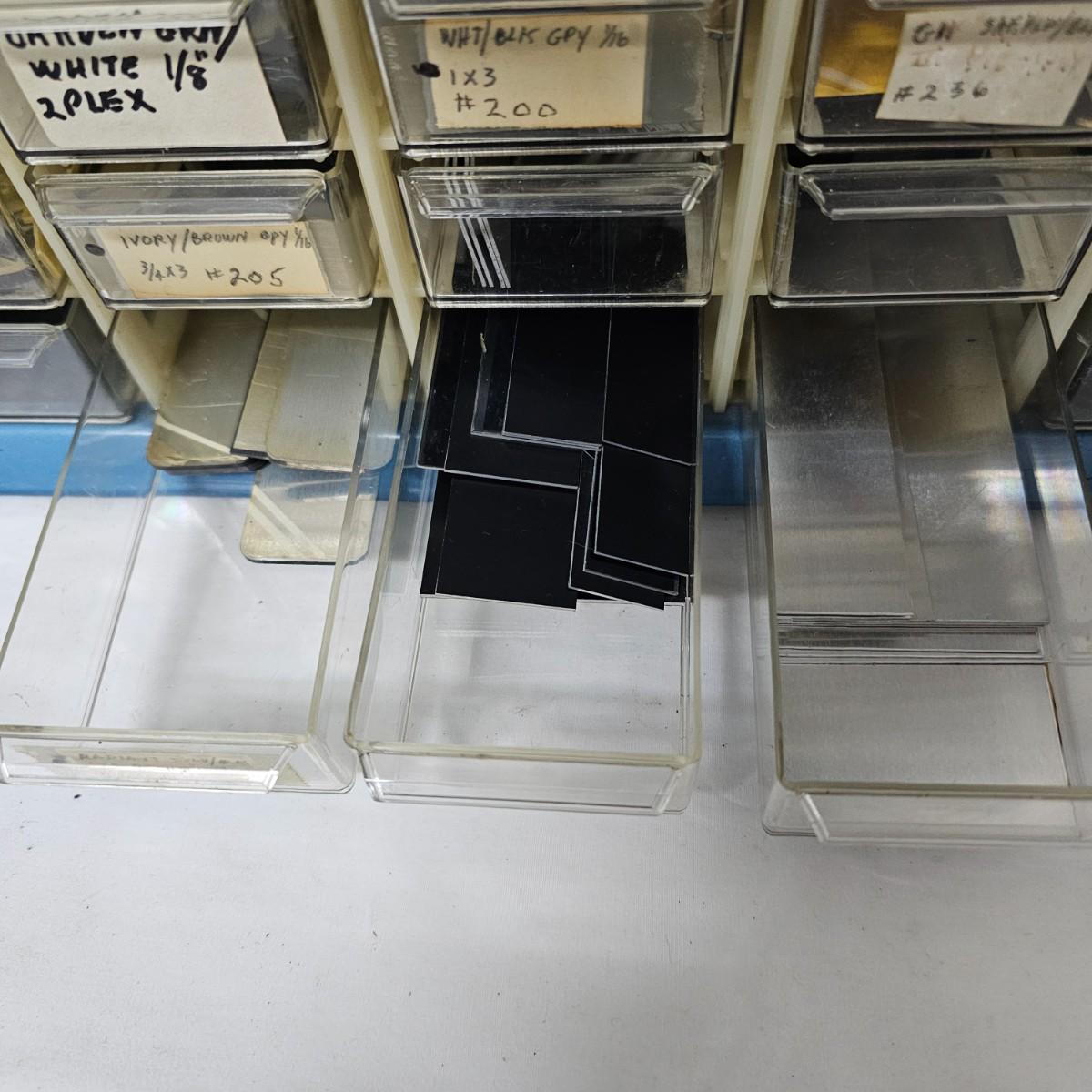 Dozens of plastic and polymer plate pieces, key chains, discs and more for engraving or other. Large assortment of flat pieces various sizes and colors. Gray items with numbers are probably drilling templates. One box of small brass scrap and pieces. A 60 drawer chest full of sorted color and size plates, fittings, backs and such. Large bag of cosmetic silver & gold chains, new in package. Too many pieces to count. See photos for details. Shipping available.
