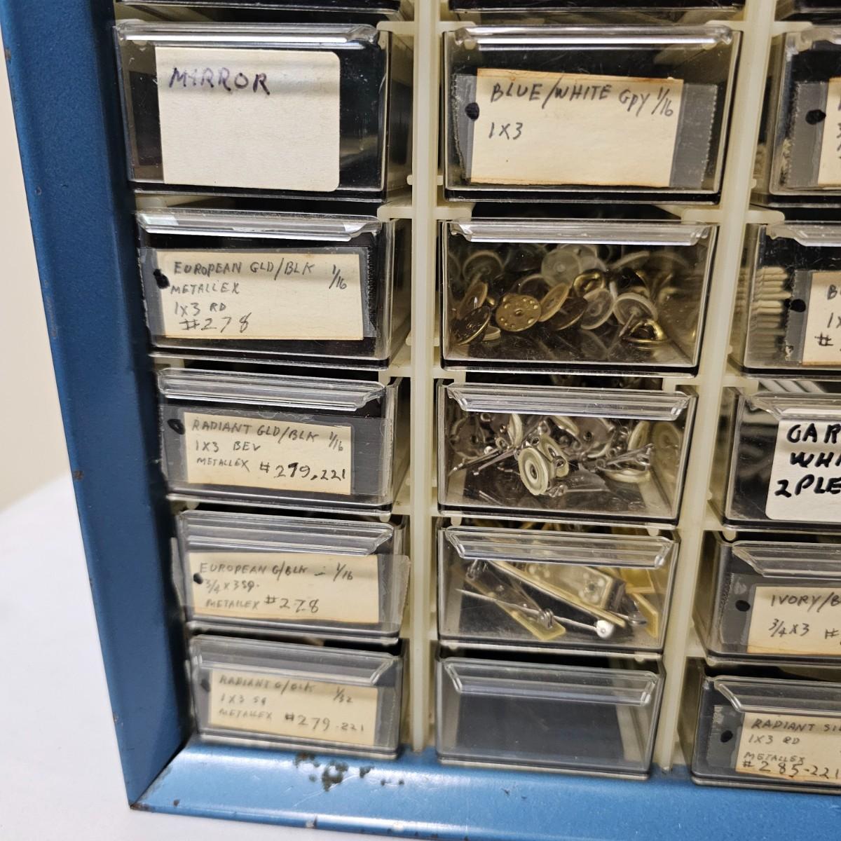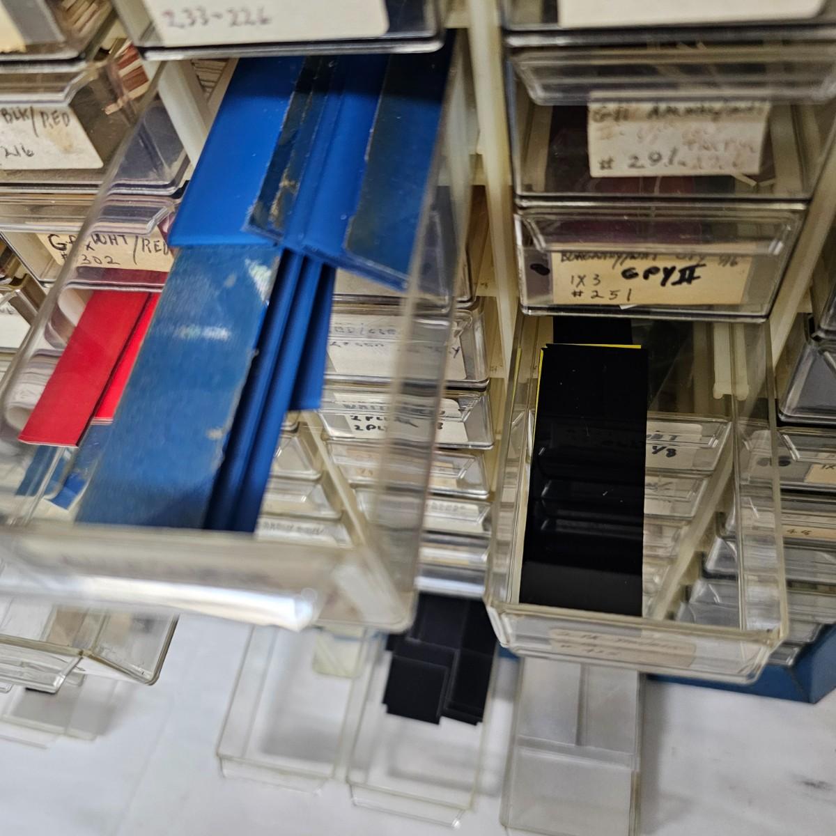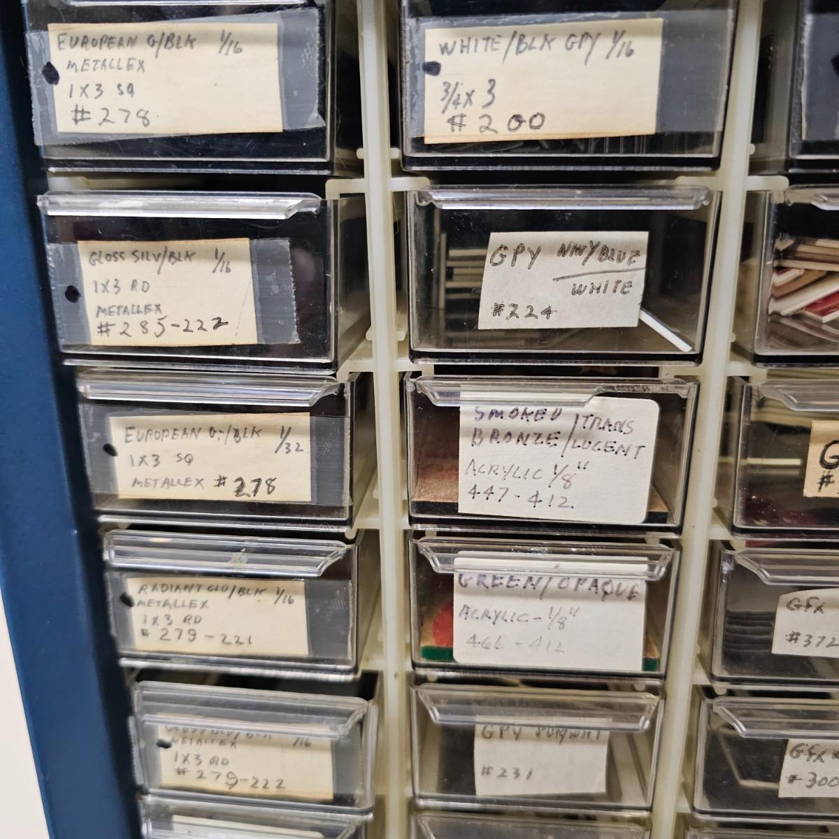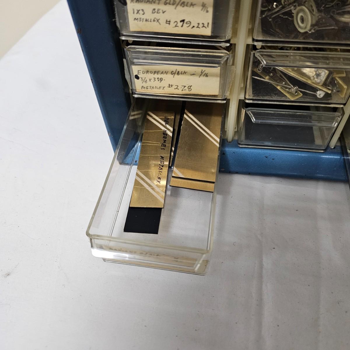 Dozens of plastic and polymer plate pieces, key chains, discs and more for engraving or other. Large assortment of flat pieces various sizes and colors. Gray items with numbers are probably drilling templates. One box of small brass scrap and pieces. A 60 drawer chest full of sorted color and size plates, fittings, backs and such. Large bag of cosmetic silver & gold chains, new in package. Too many pieces to count. See photos for details. Shipping available.