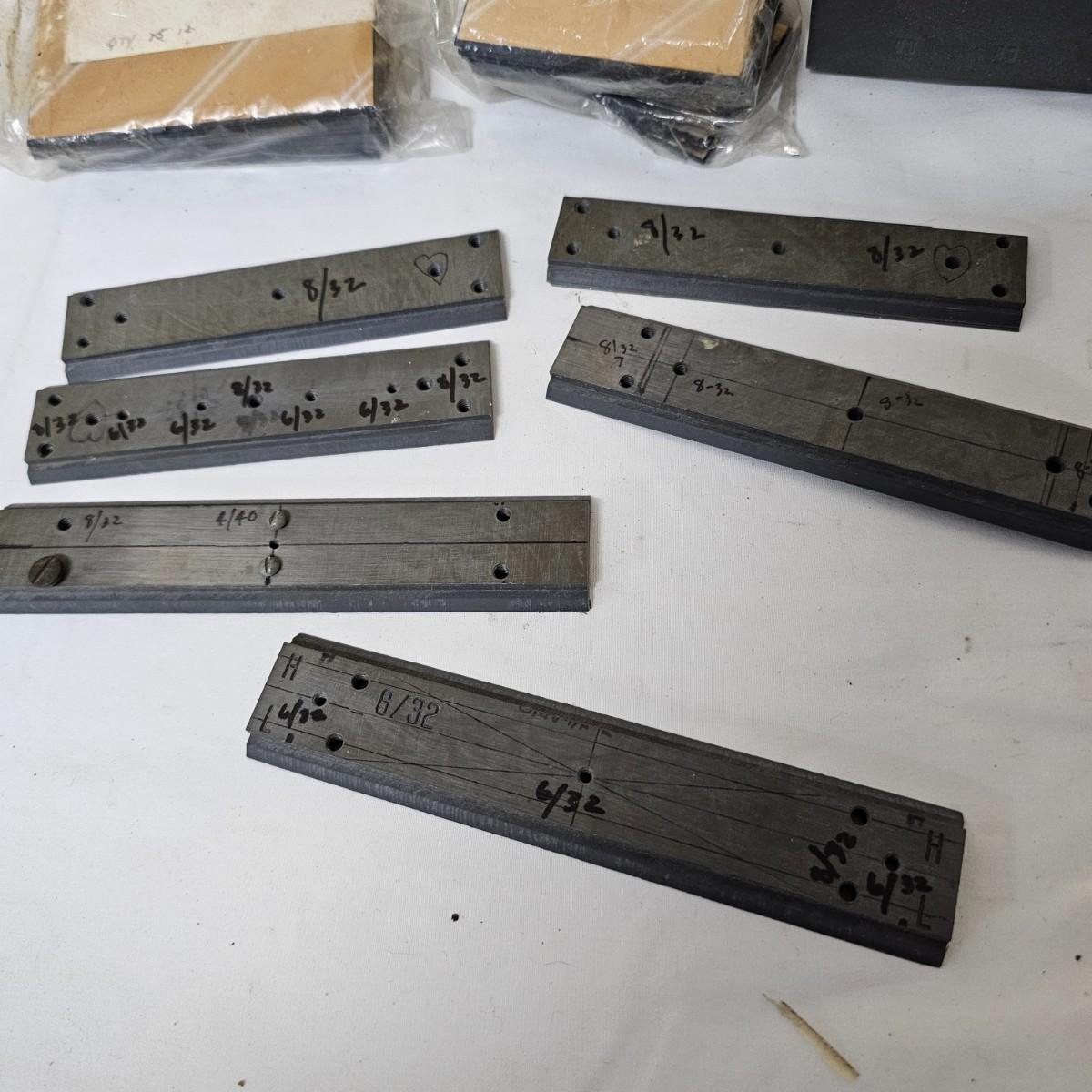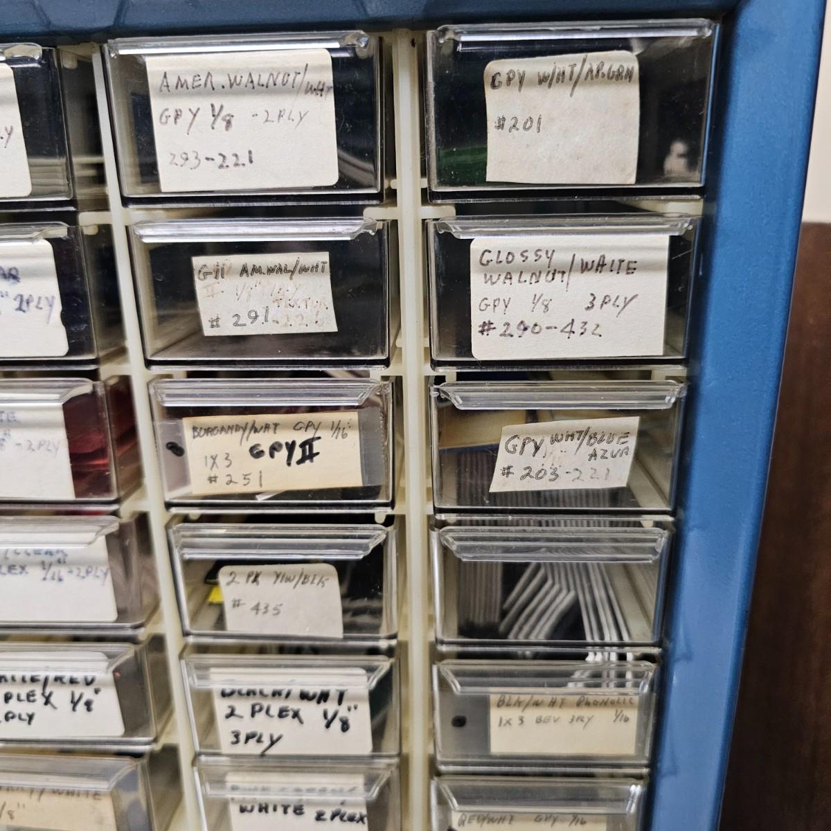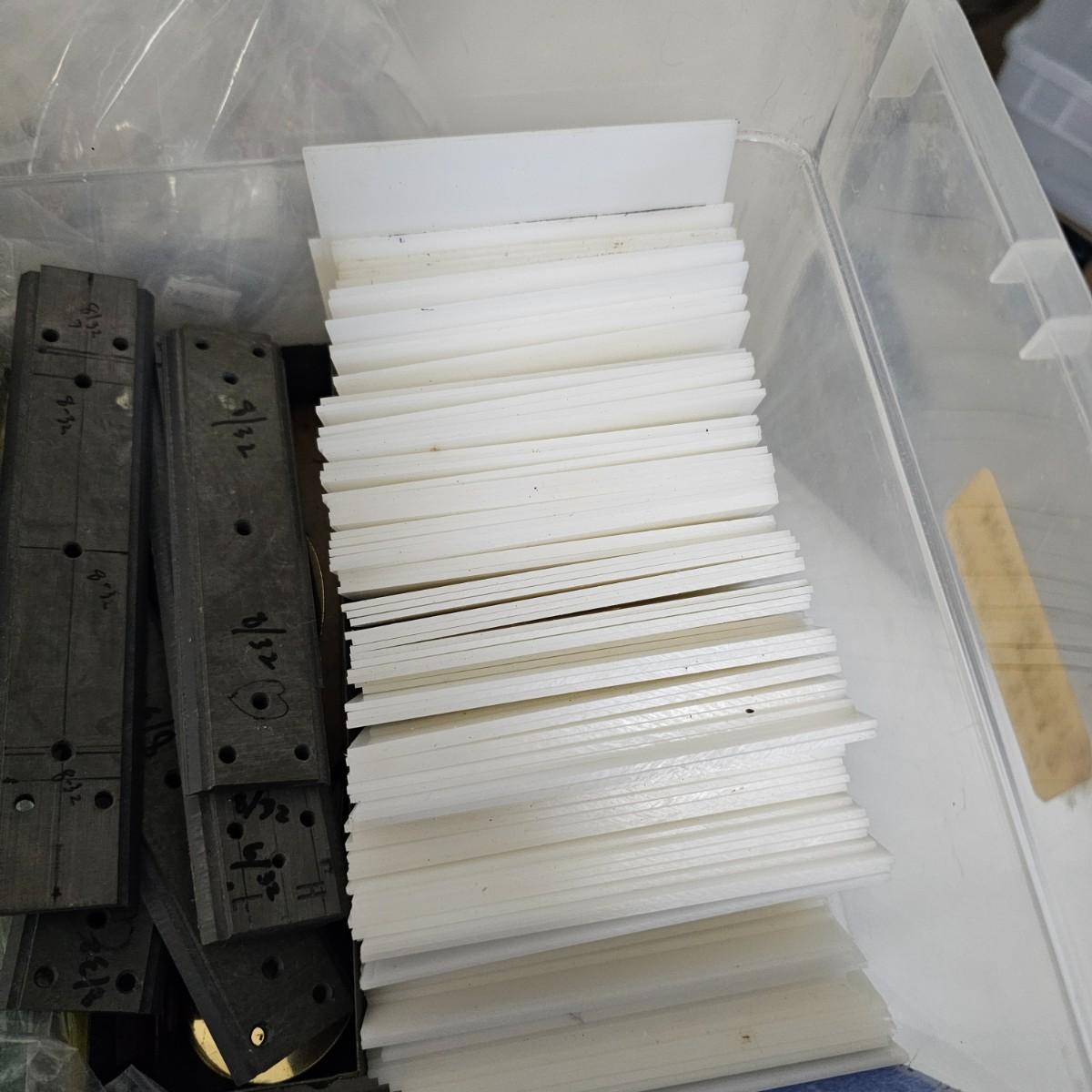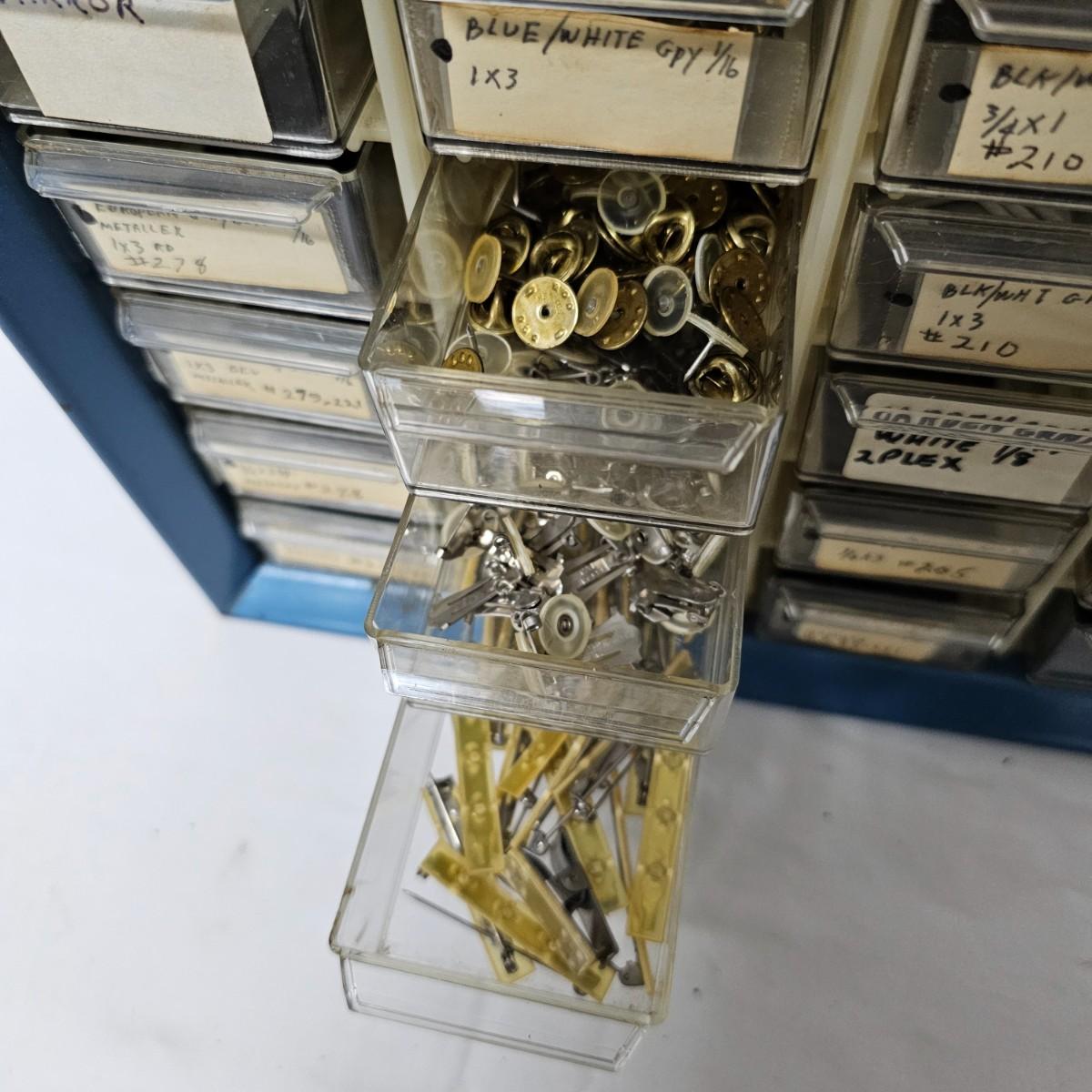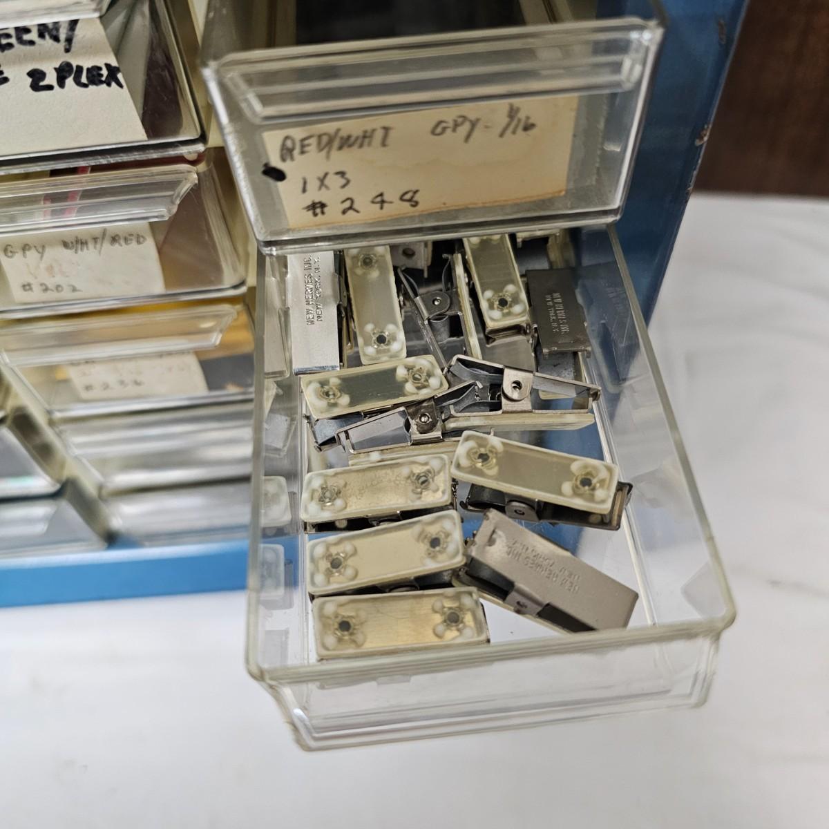 Dozens of plastic and polymer plate pieces, key chains, discs and more for engraving or other. Large assortment of flat pieces various sizes and colors. Gray items with numbers are probably drilling templates. One box of small brass scrap and pieces. A 60 drawer chest full of sorted color and size plates, fittings, backs and such. Large bag of cosmetic silver & gold chains, new in package. Too many pieces to count. See photos for details. Shipping available.