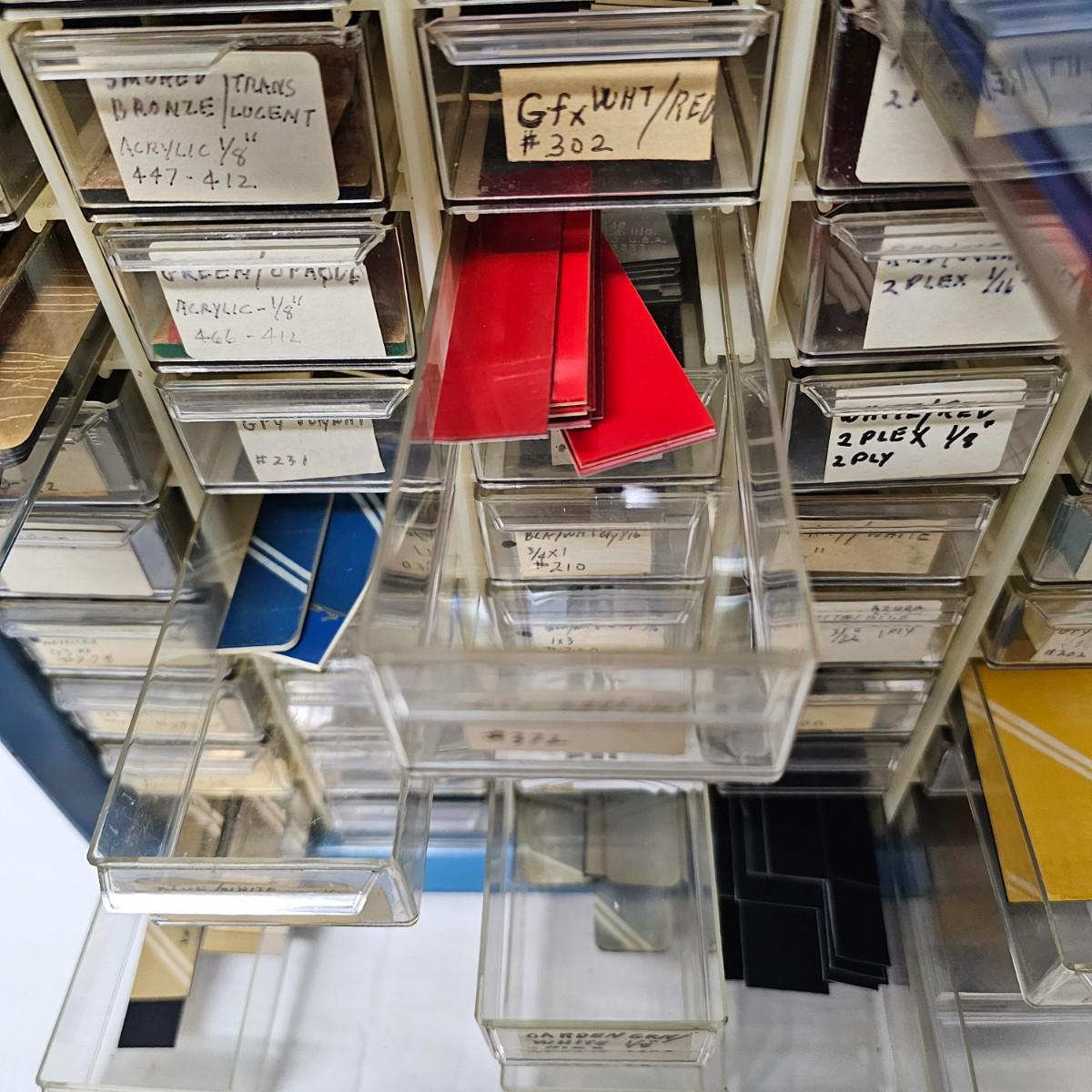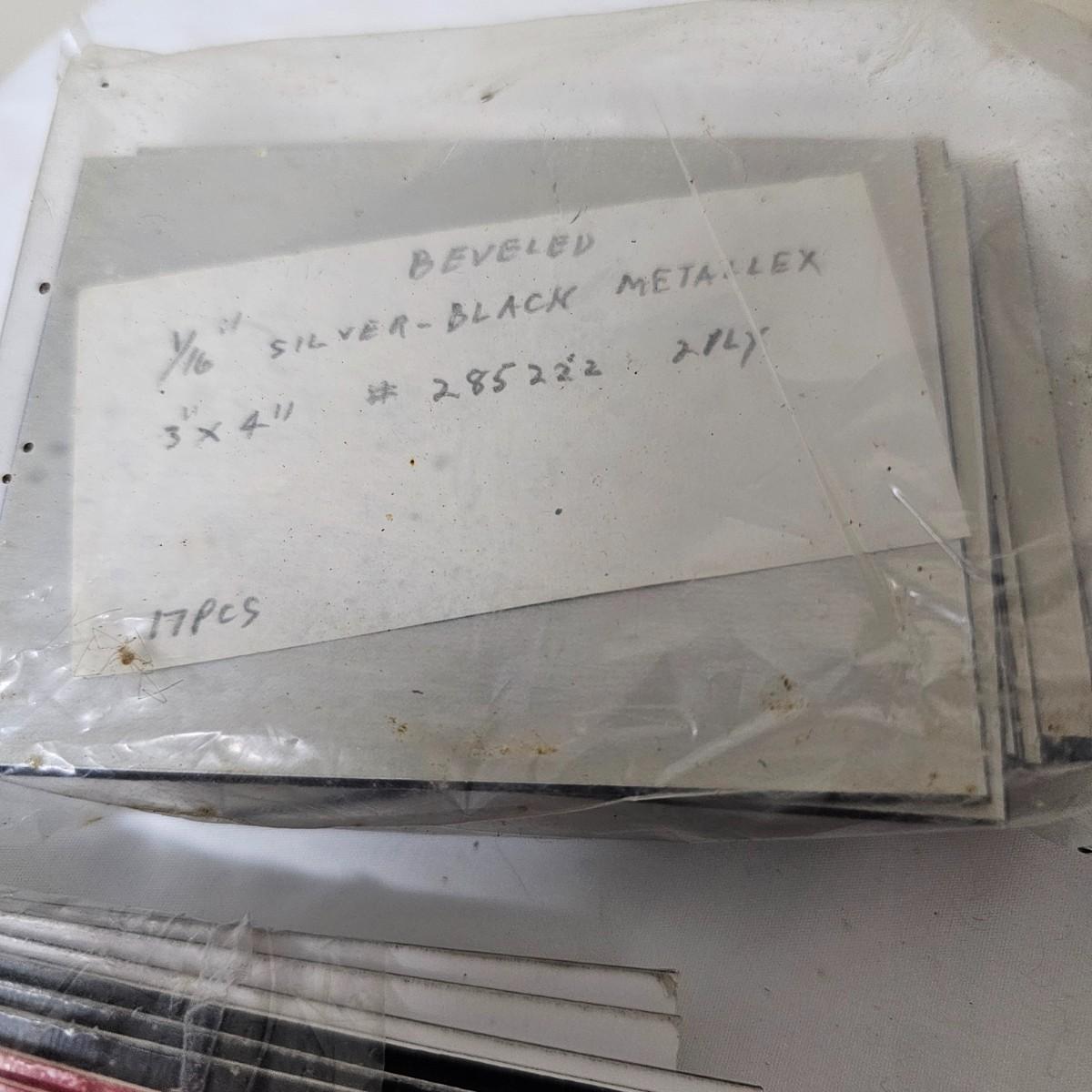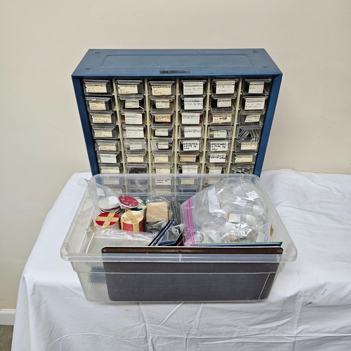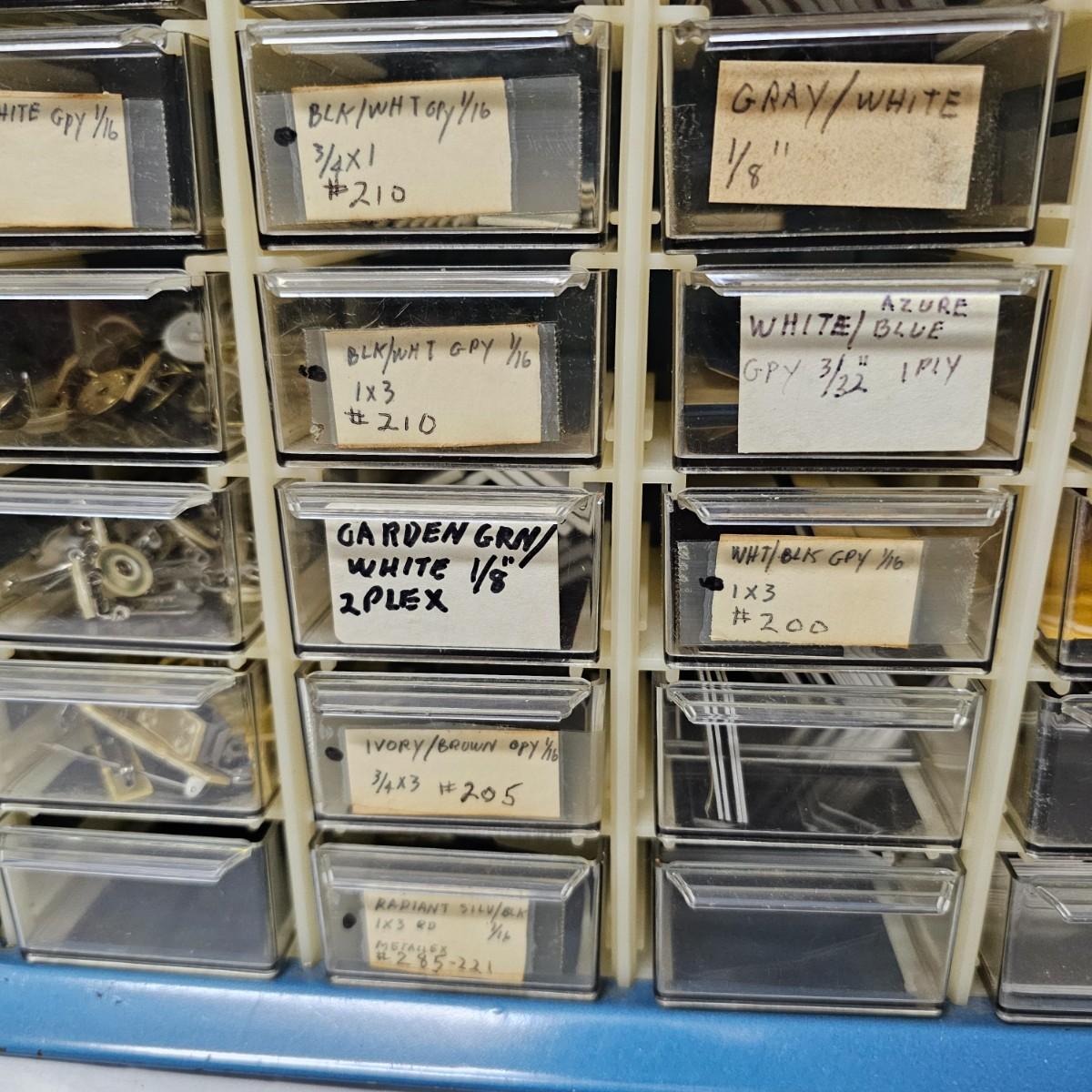 Dozens of plastic and polymer plate pieces, key chains, discs and more for engraving or other. Large assortment of flat pieces various sizes and colors. Gray items with numbers are probably drilling templates. One box of small brass scrap and pieces. A 60 drawer chest full of sorted color and size plates, fittings, backs and such. Large bag of cosmetic silver & gold chains, new in package. Too many pieces to count. See photos for details. Shipping available.