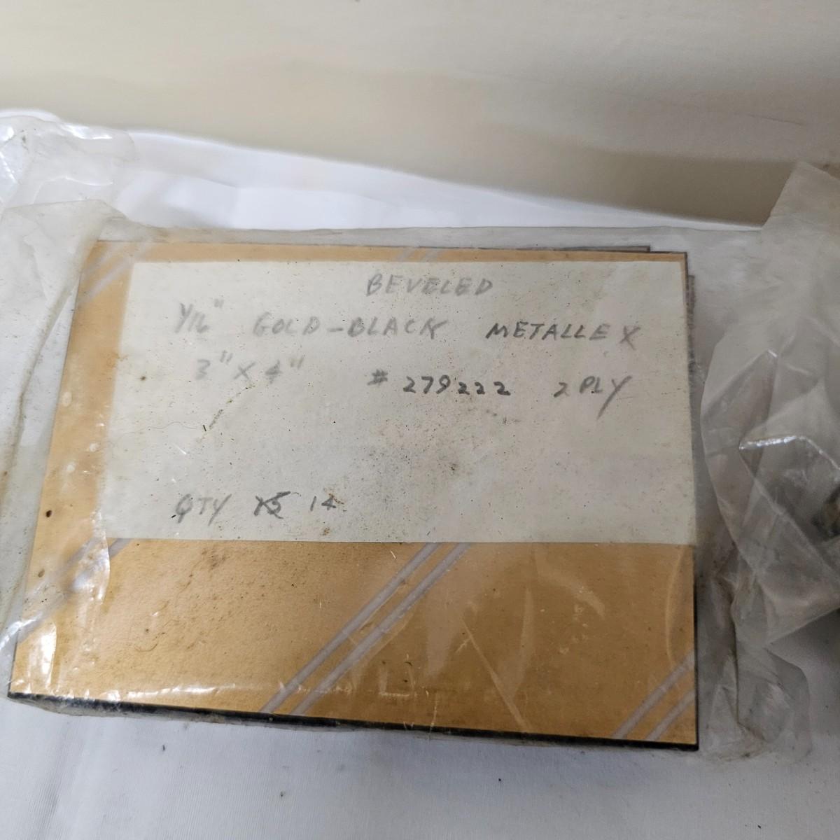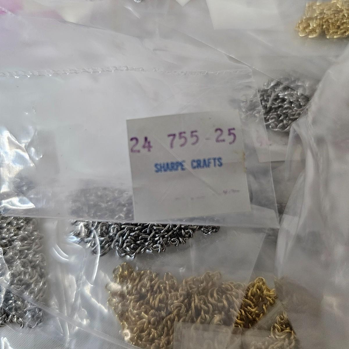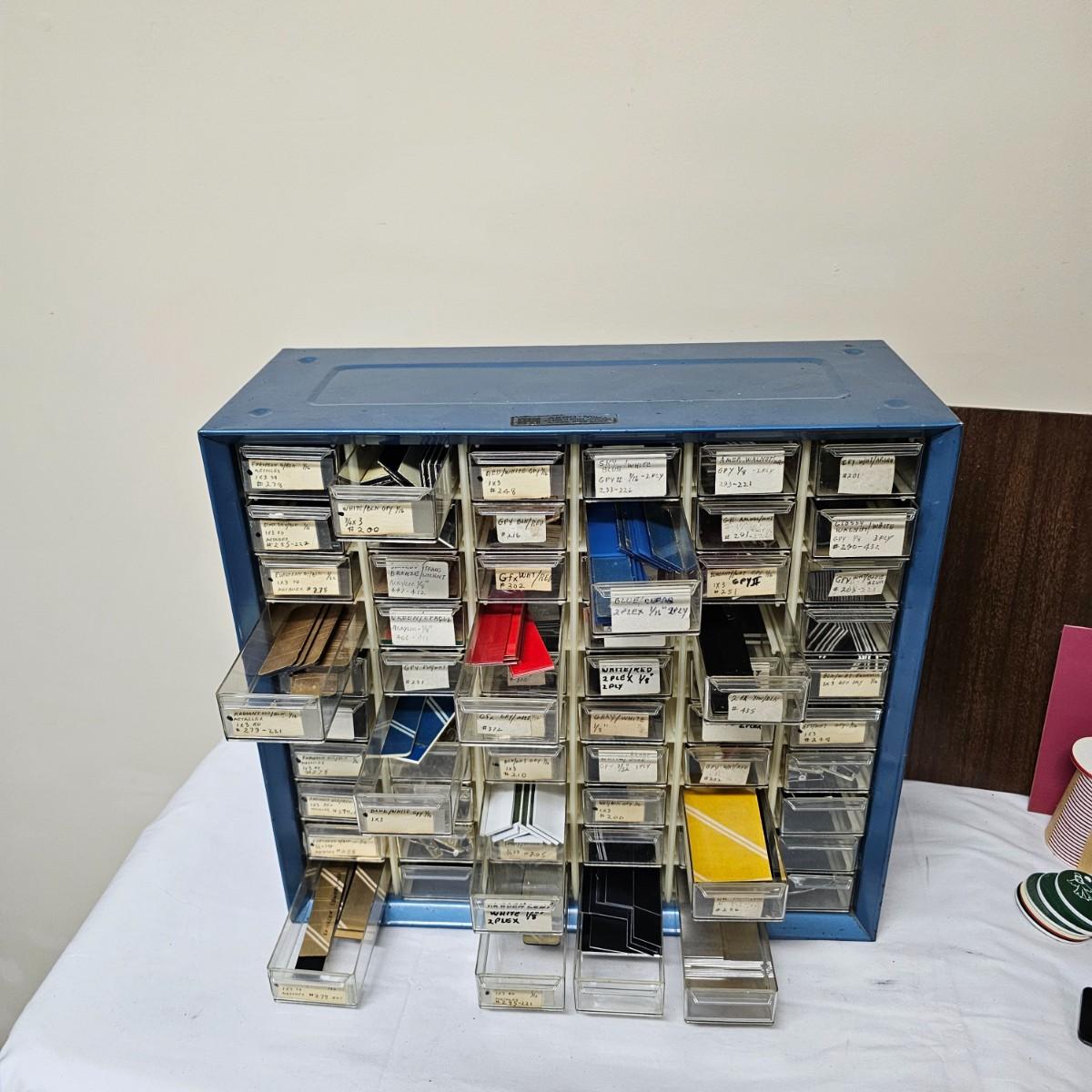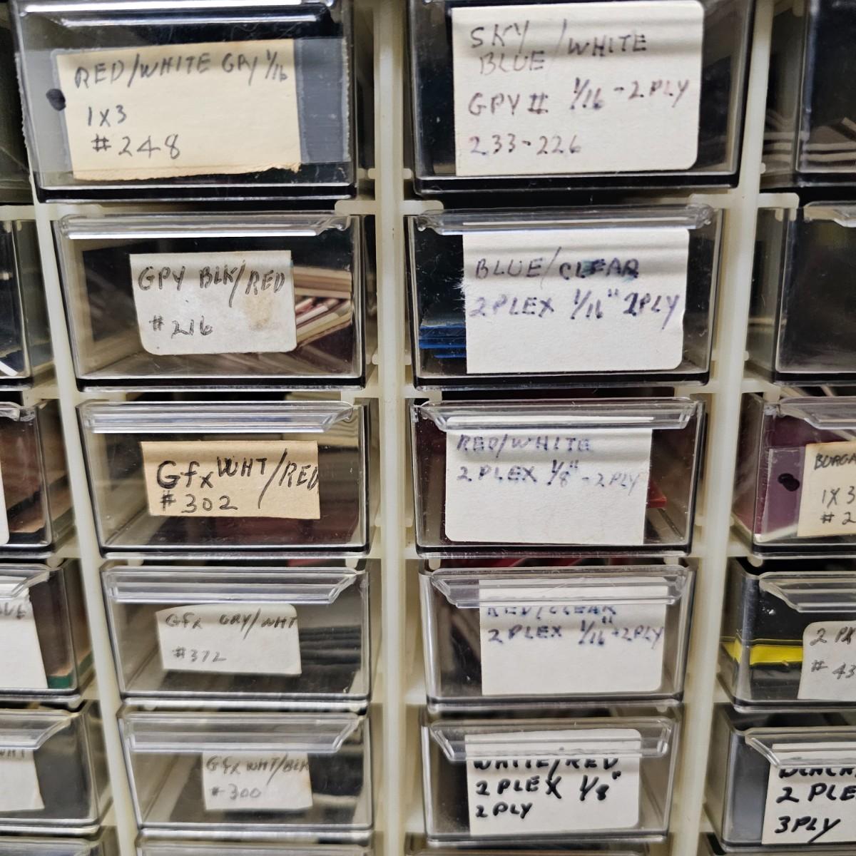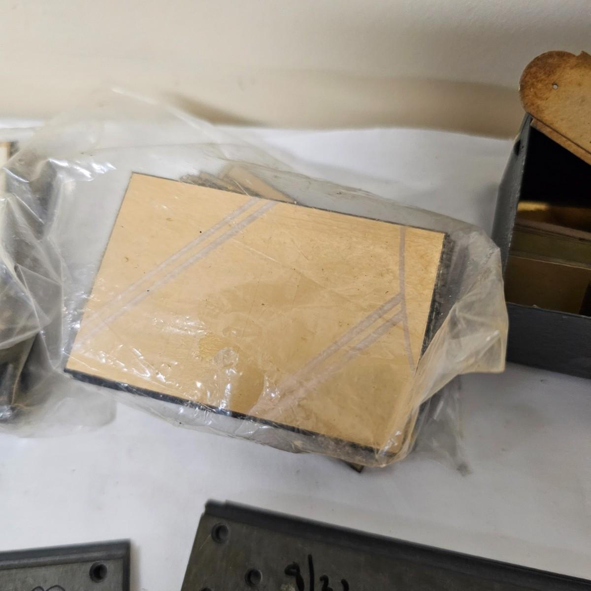 Dozens of plastic and polymer plate pieces, key chains, discs and more for engraving or other. Large assortment of flat pieces various sizes and colors. Gray items with numbers are probably drilling templates. One box of small brass scrap and pieces. A 60 drawer chest full of sorted color and size plates, fittings, backs and such. Large bag of cosmetic silver & gold chains, new in package. Too many pieces to count. See photos for details. Shipping available.