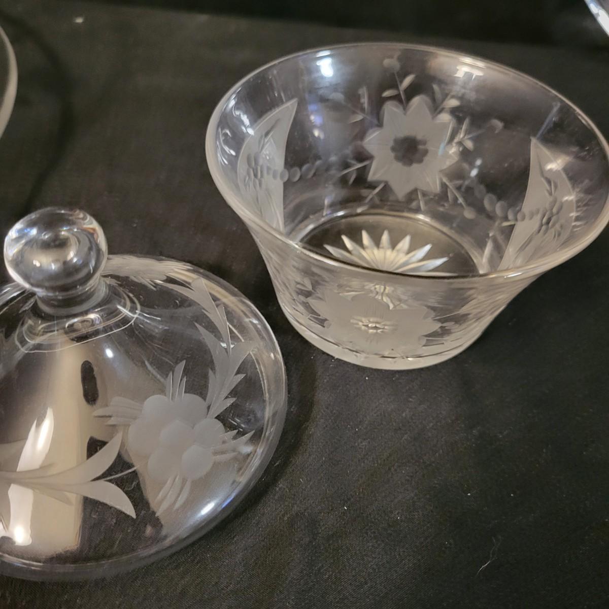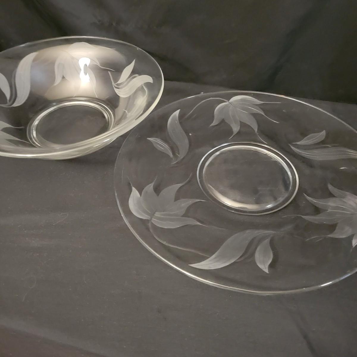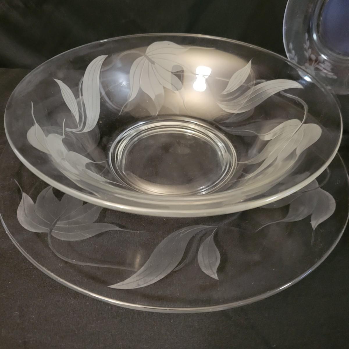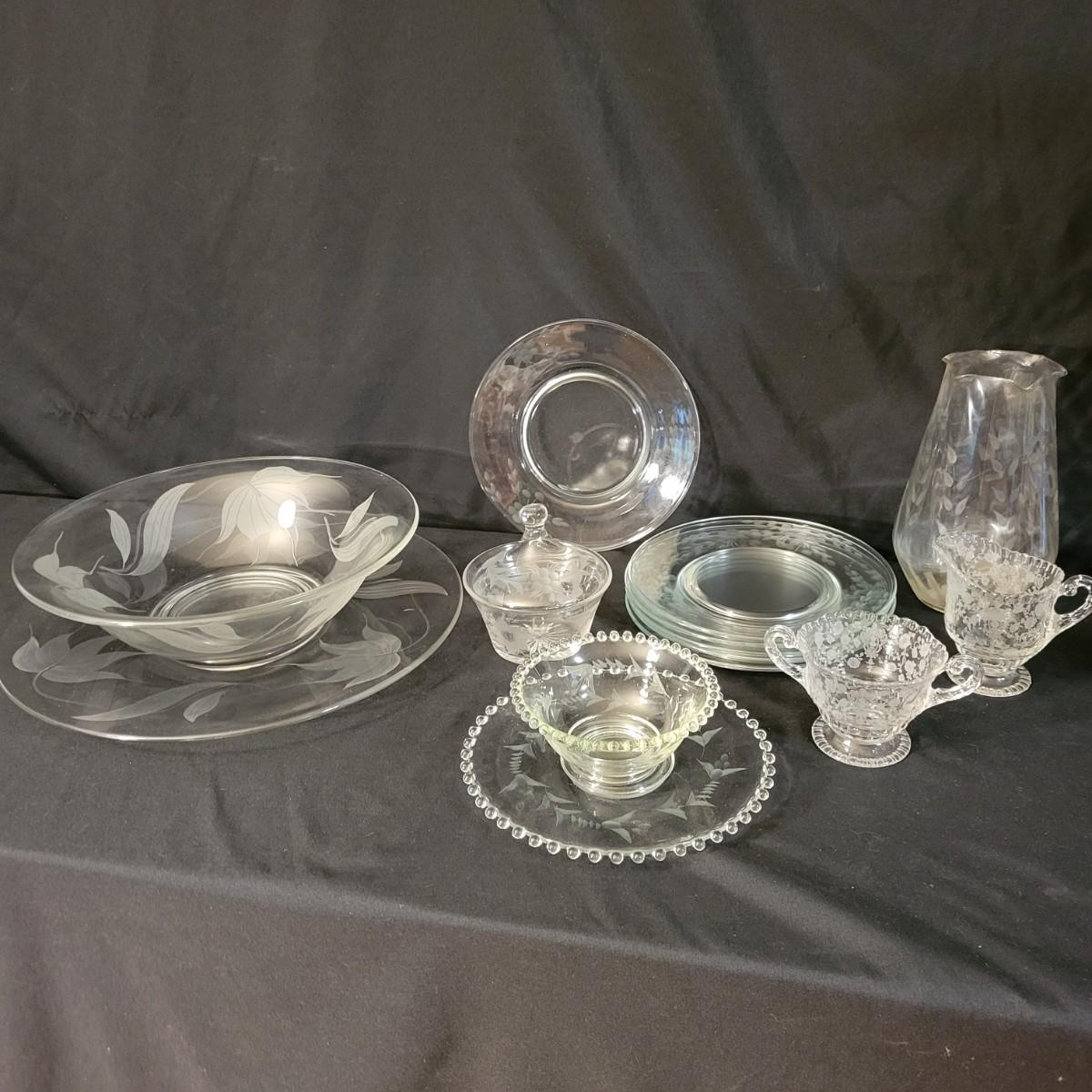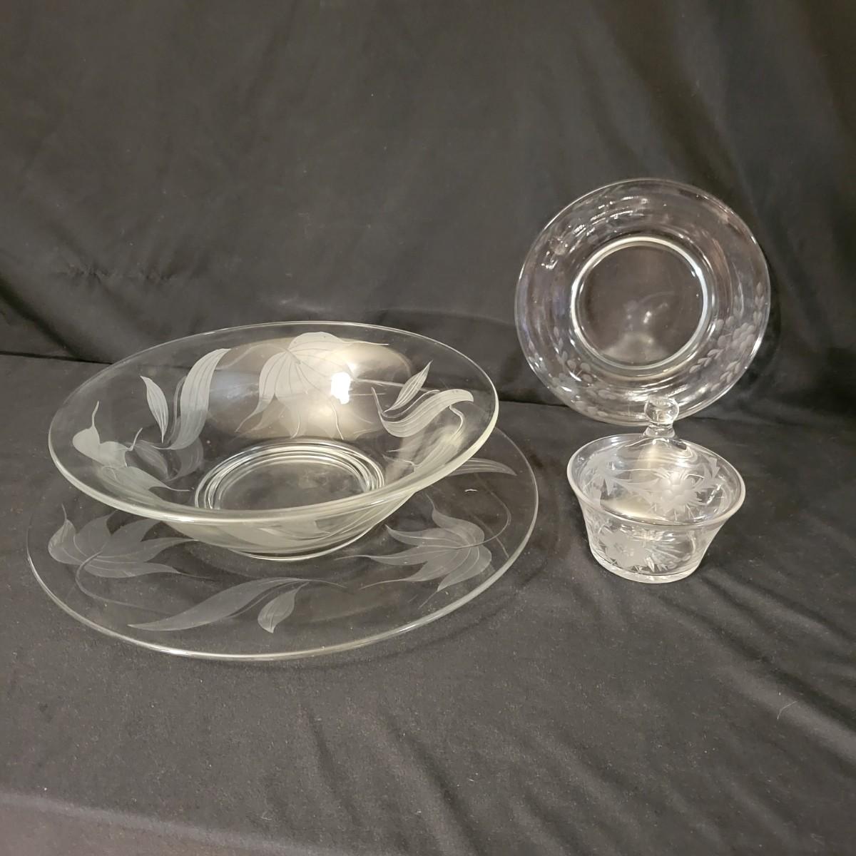 An assortment of etched glass in good condition with no notable damage. Included is a large bowl and matching plate with a leaf etching, six etched plates, a smaller bowl and plate with beaded edges, a lidded jar, a vase and and two etched bowls with handles. Largest bowl and platter measures approximately 14.5" x 4" Local pickup only