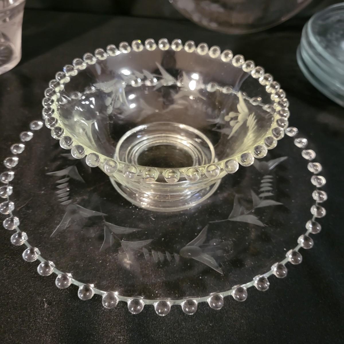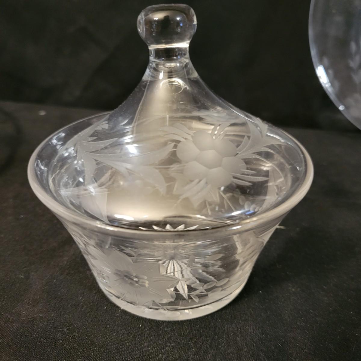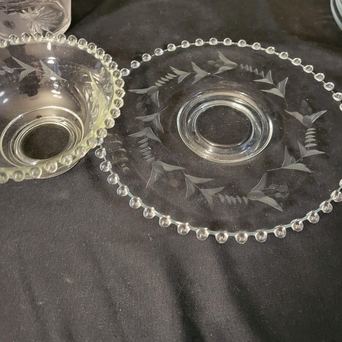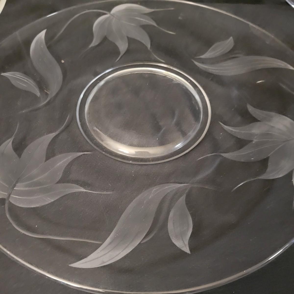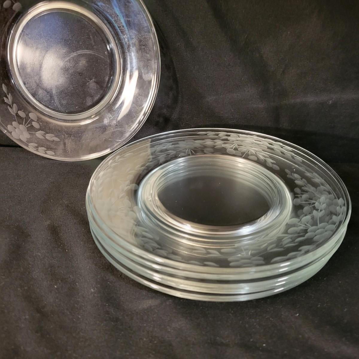An assortment of etched glass in good condition with no notable damage. Included is a large bowl and matching plate with a leaf etching, six etched plates, a smaller bowl and plate with beaded edges, a lidded jar, a vase and and two etched bowls with handles. Largest bowl and platter measures approximately 14.5" x 4" Local pickup only