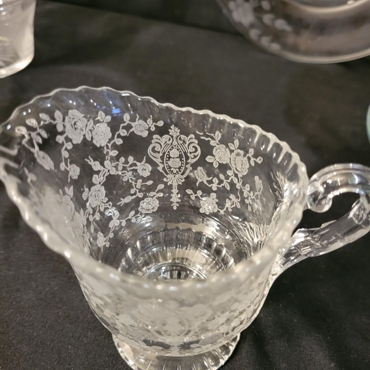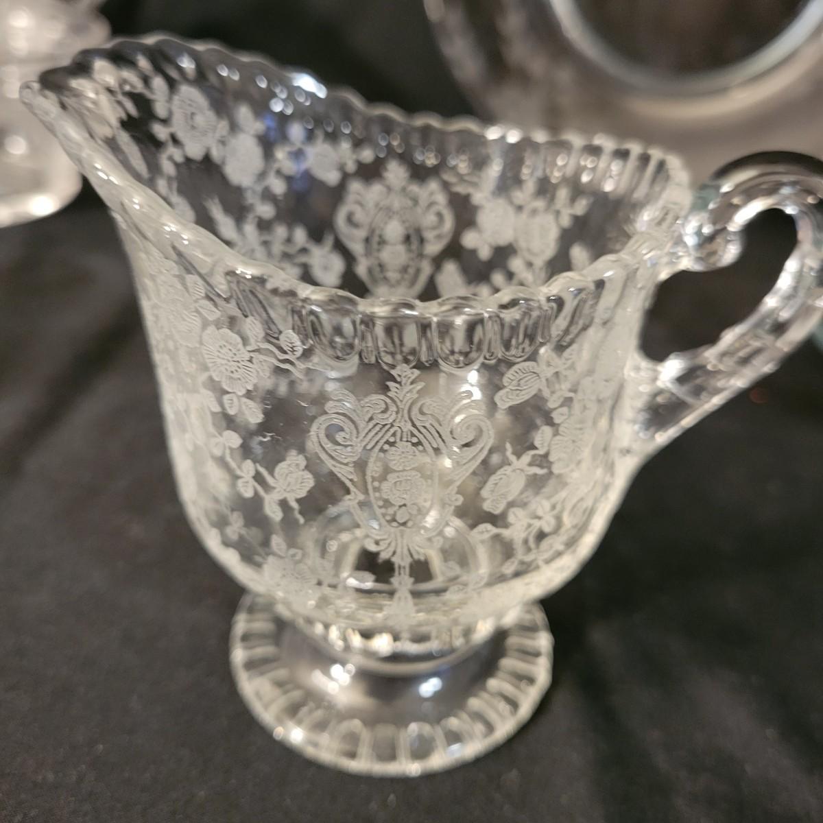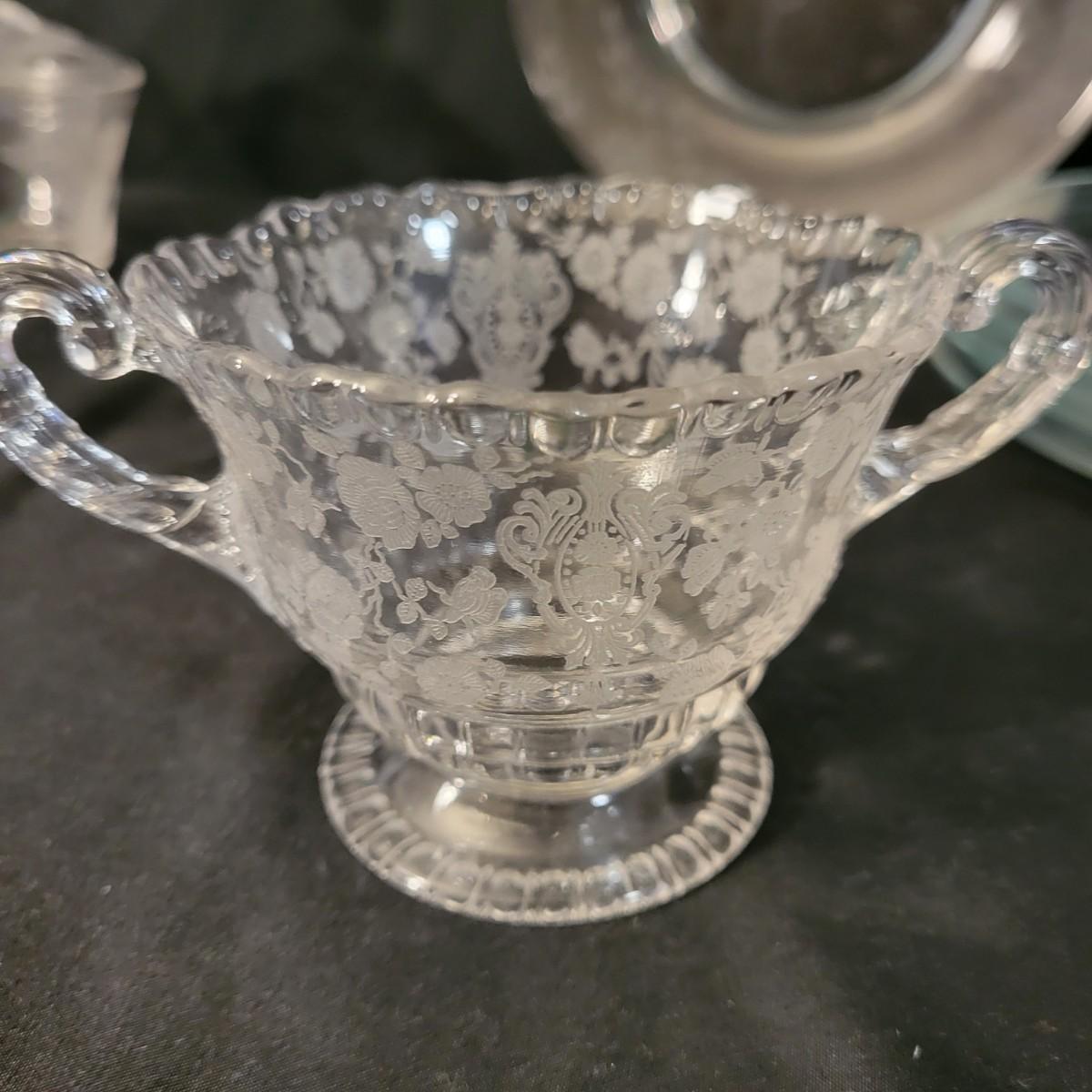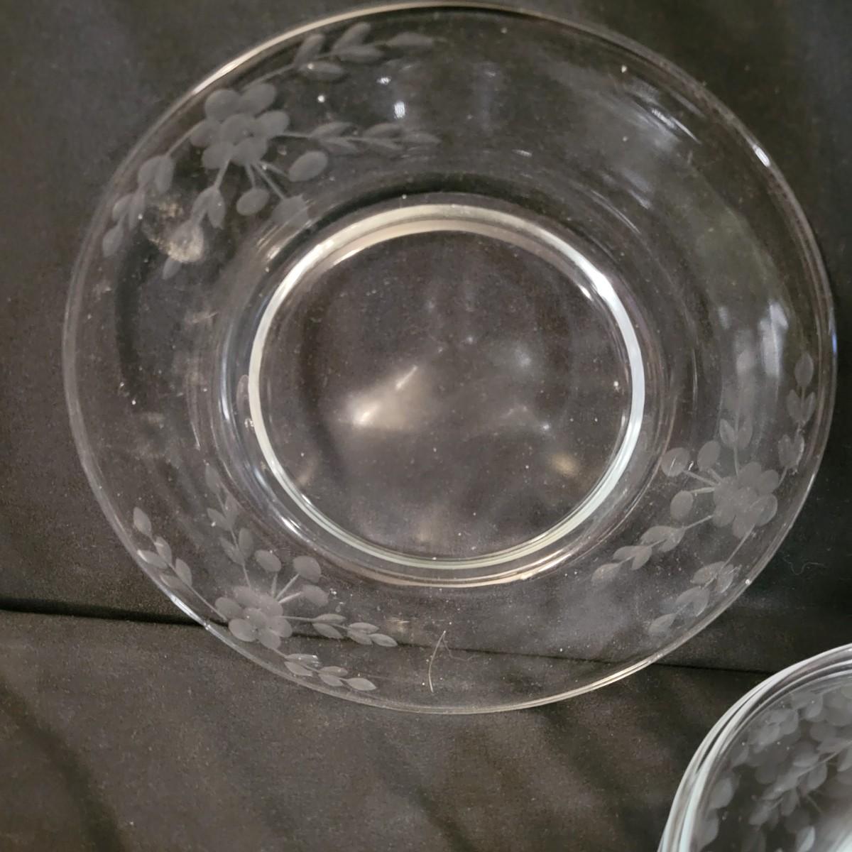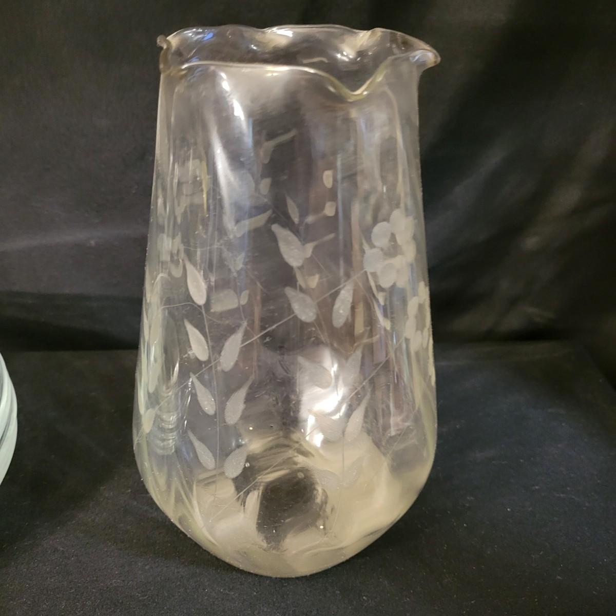 An assortment of etched glass in good condition with no notable damage. Included is a large bowl and matching plate with a leaf etching, six etched plates, a smaller bowl and plate with beaded edges, a lidded jar, a vase and and two etched bowls with handles. Largest bowl and platter measures approximately 14.5" x 4" Local pickup only