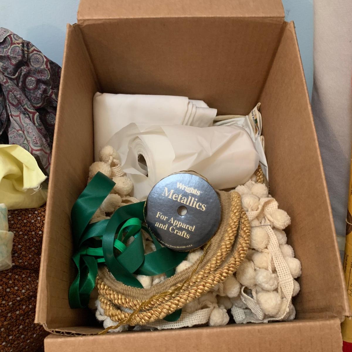 From Christmas patterns to colorful paisley, this lot has an exciting variety of pieces. Lot includes a twelve gallon storage box of fabric, a partial bolt of beige fabric, small cardboard box of edging, and a bag of fabric remnants. This lot is great for the rapidly approaching holidays! Local pick up only.