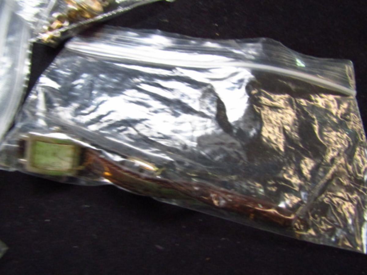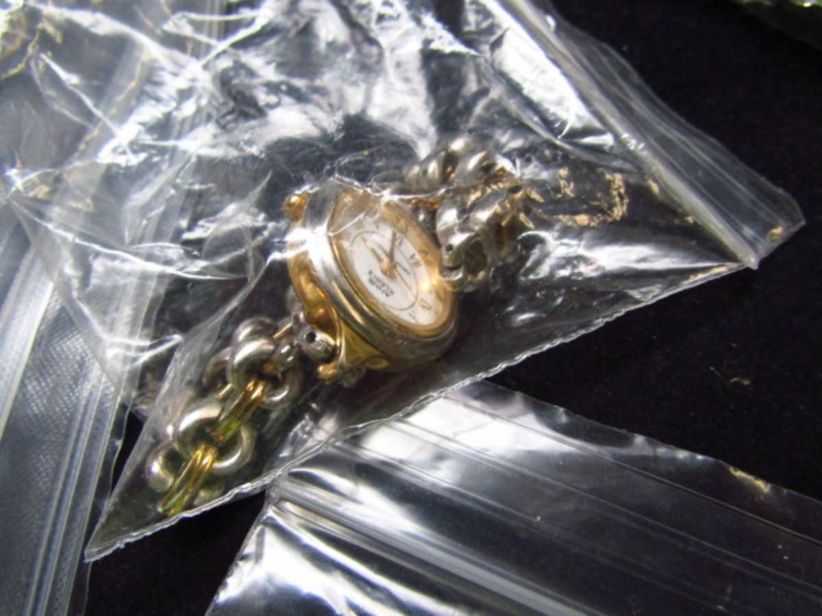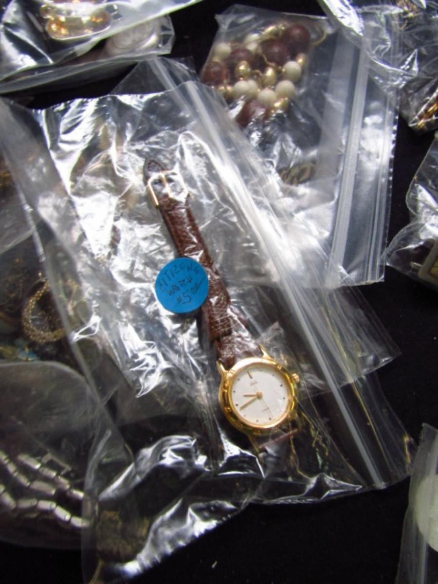 Assortment of Fashion Jewelry with Wooden Jose Cuervo 1800 Storage Box (#563). Includes watches, necklaces, bracelets.