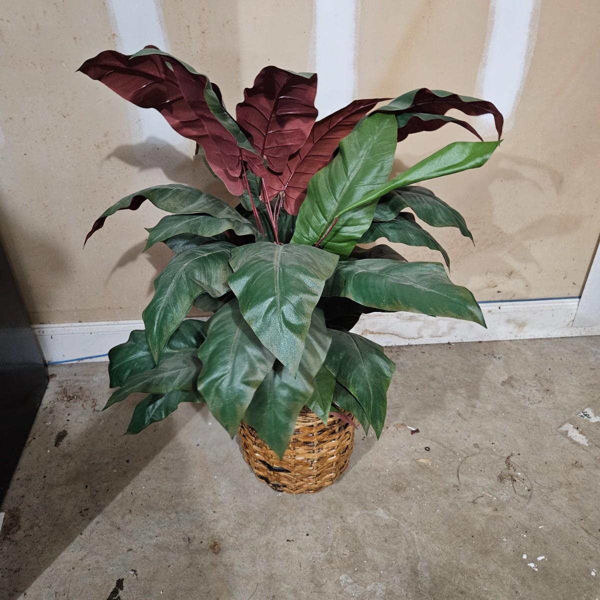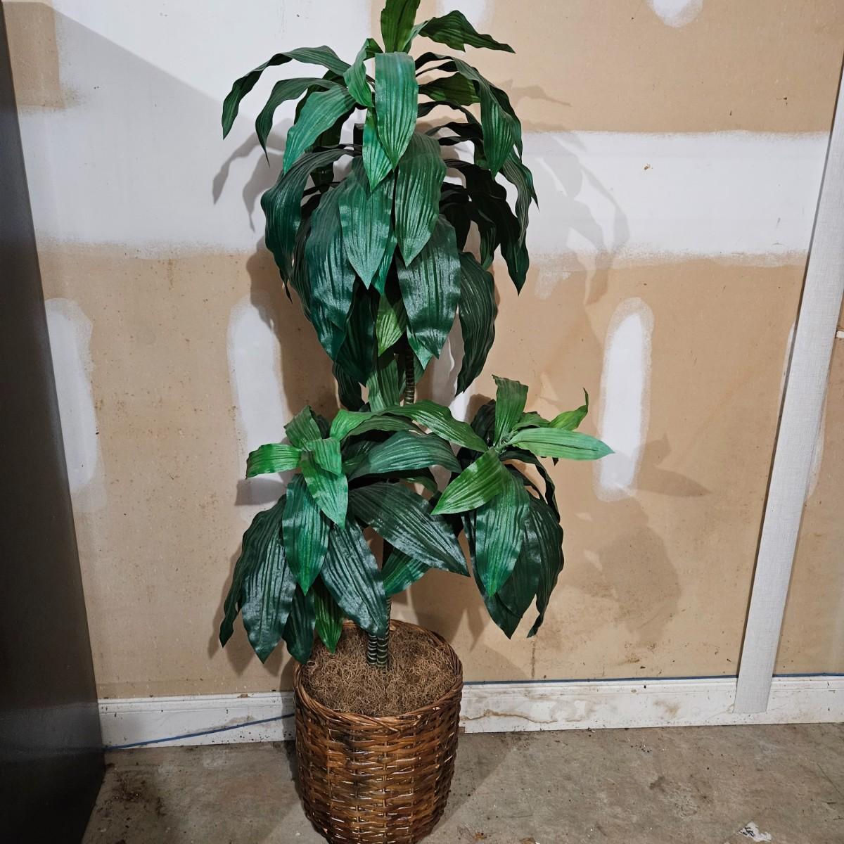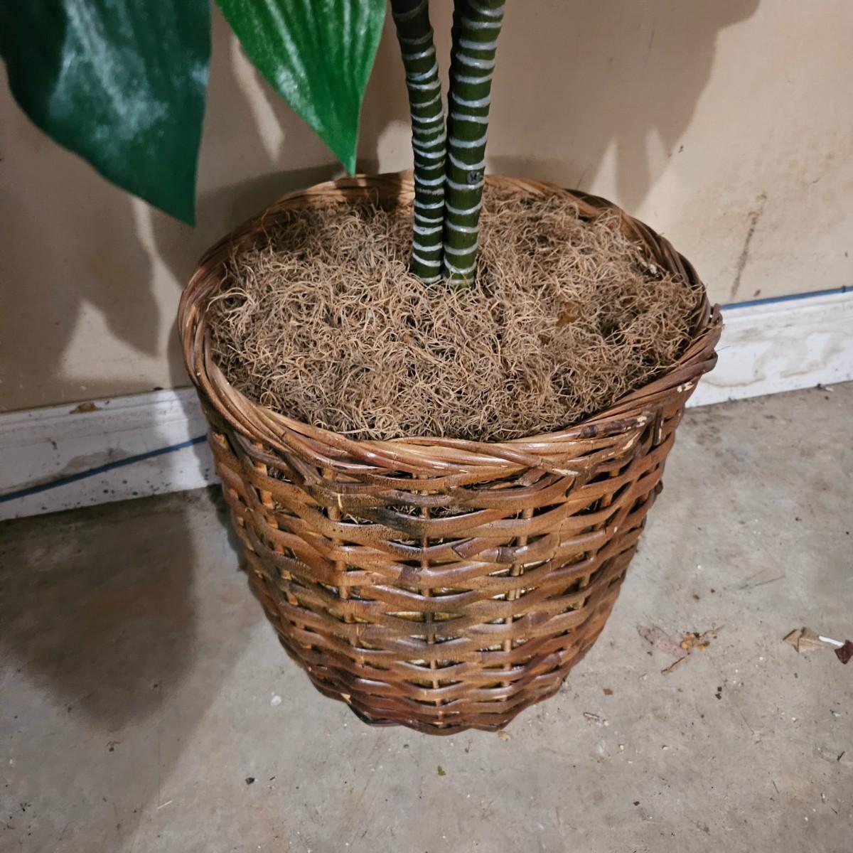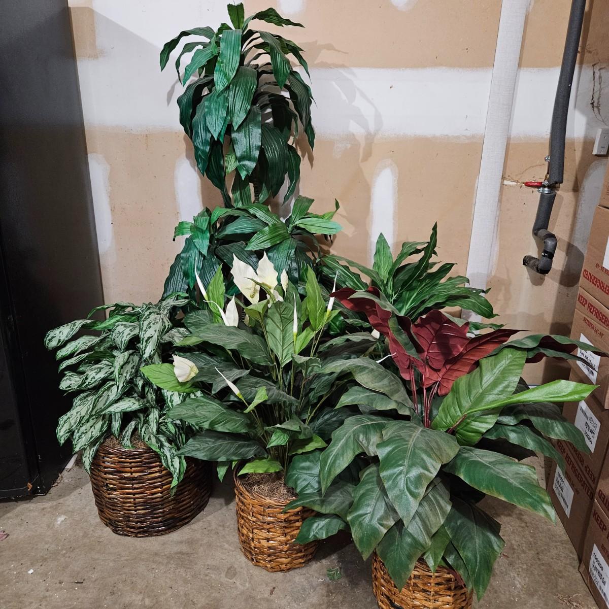 An assortment of five faux tropical plants in woven baskets with moss. The tallest plant measures approximately 24"D x 64"H. Local pickup only