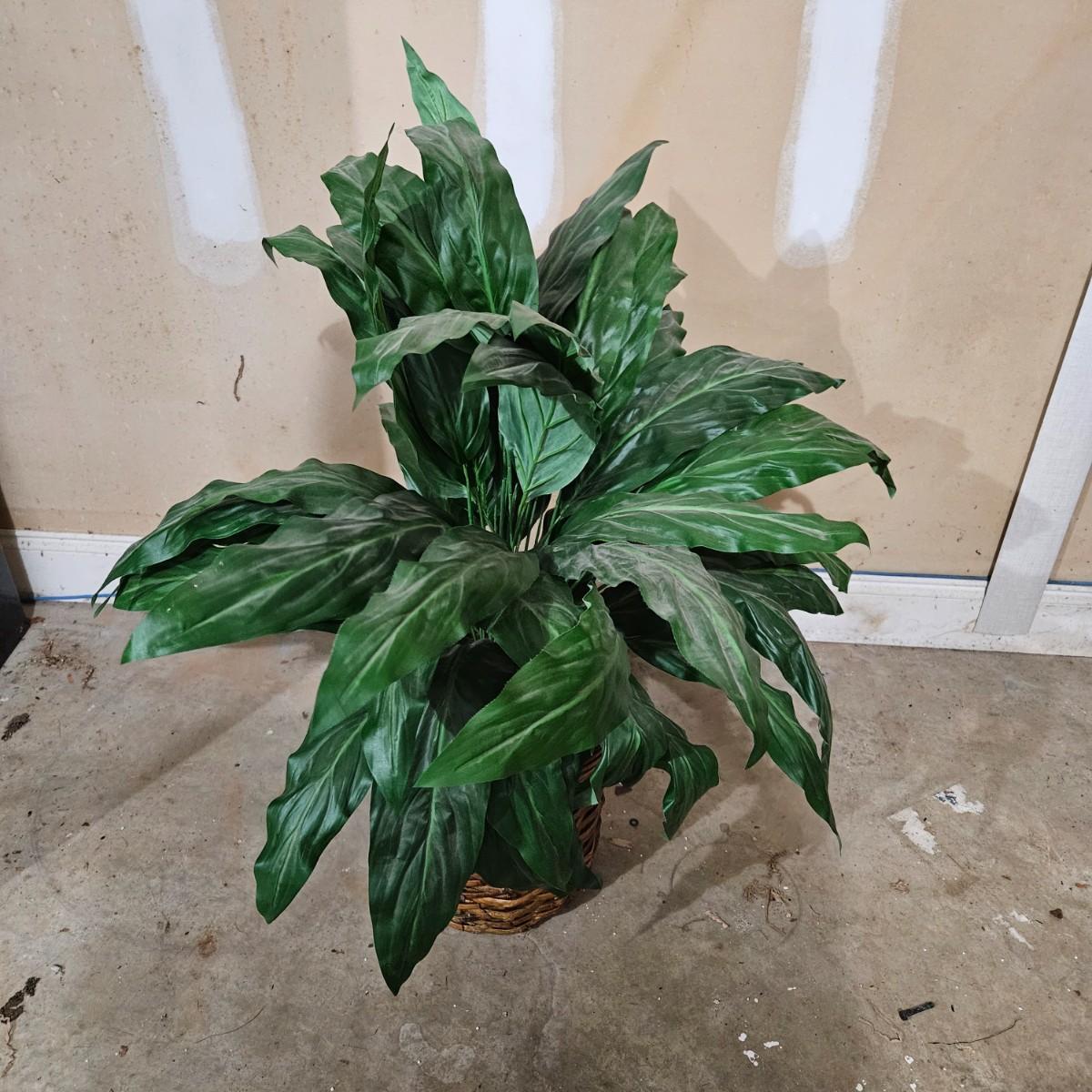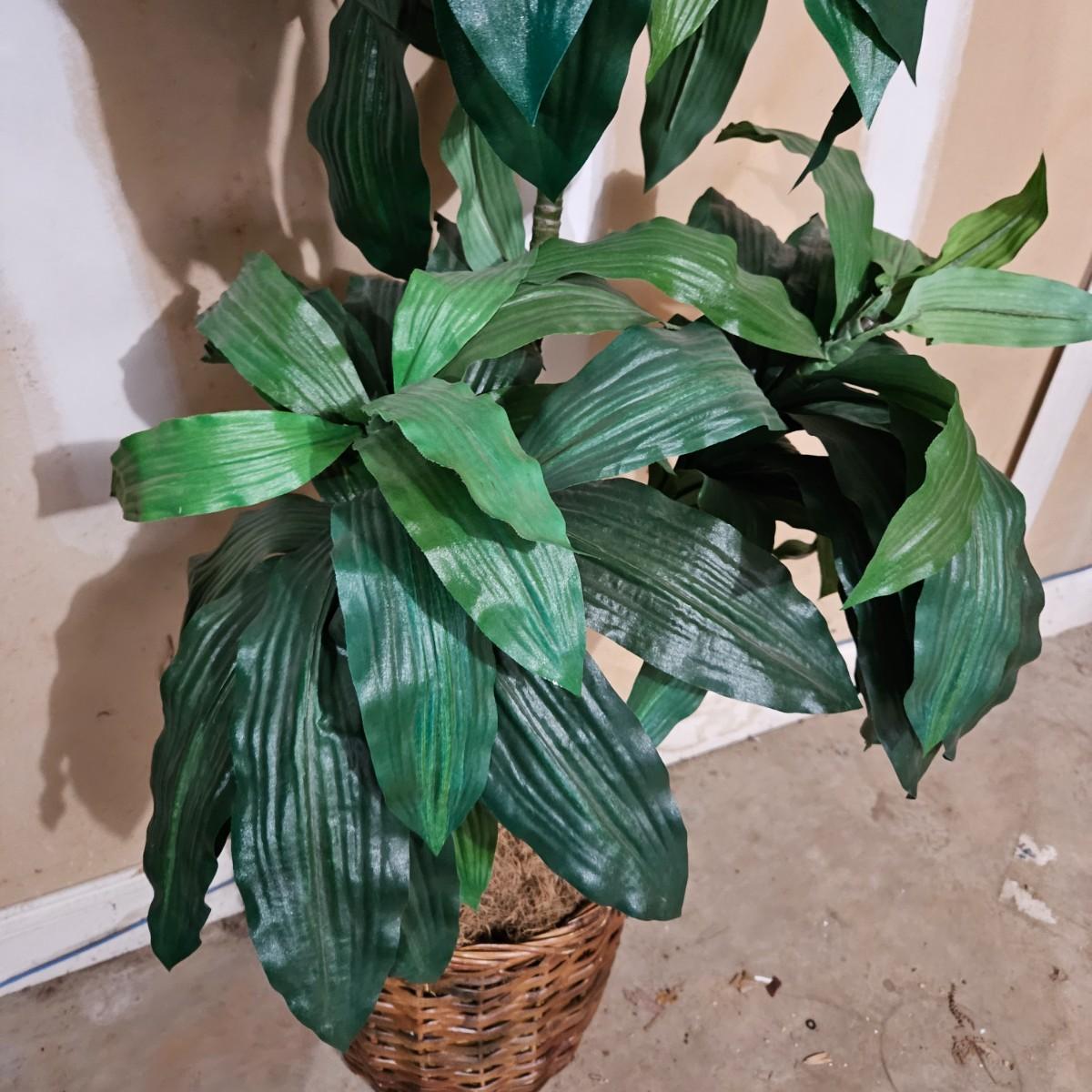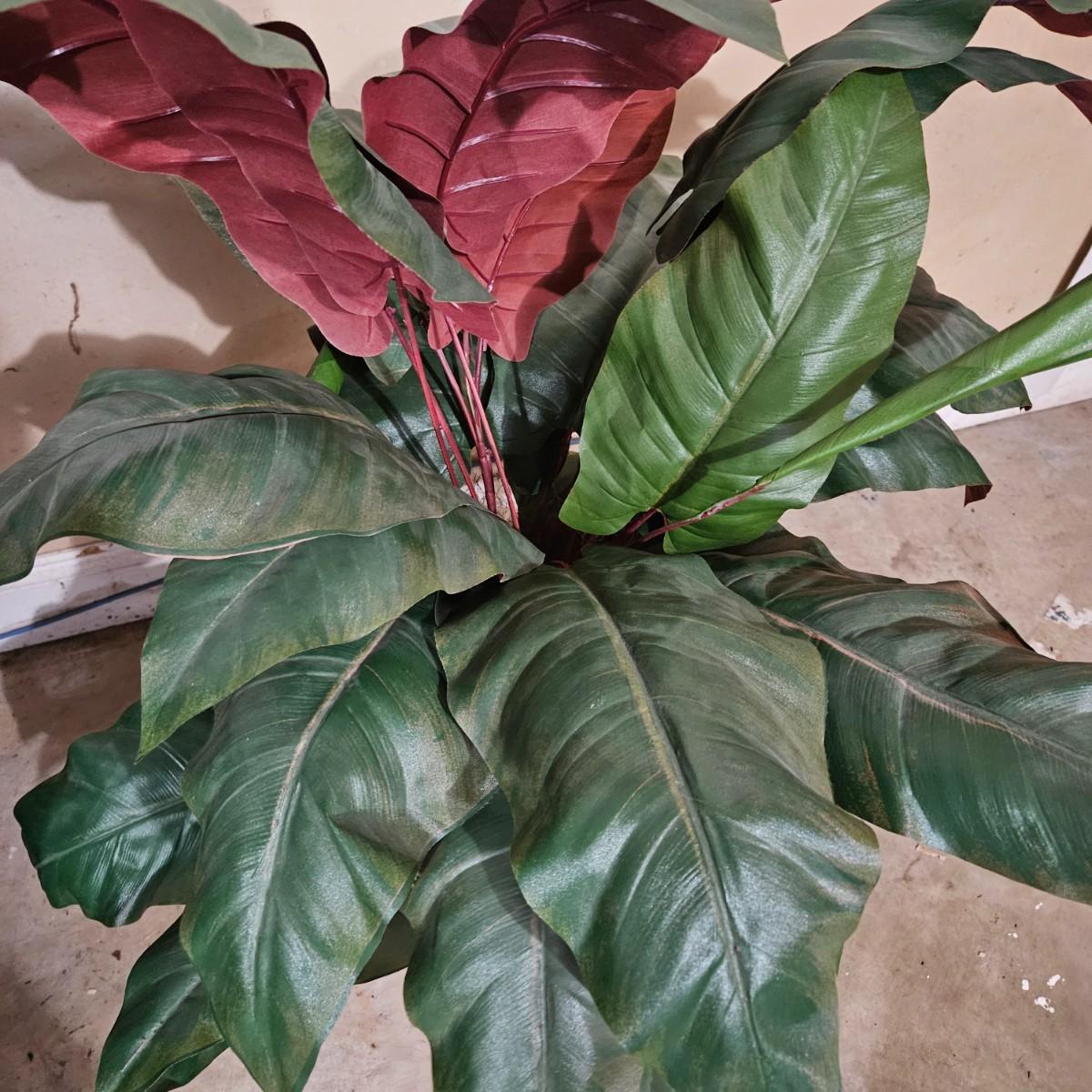An assortment of five faux tropical plants in woven baskets with moss. The tallest plant measures approximately 24"D x 64"H. Local pickup only