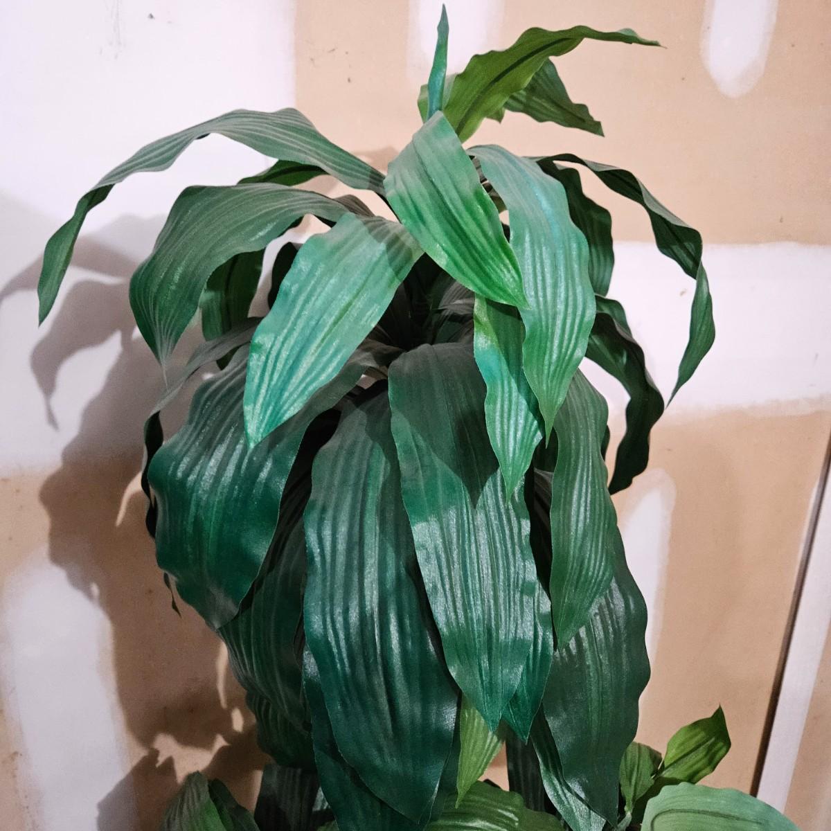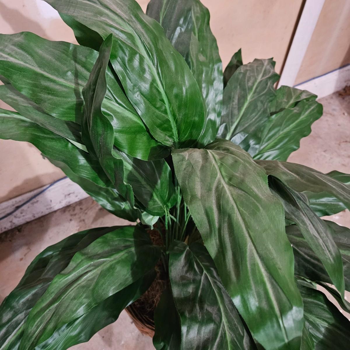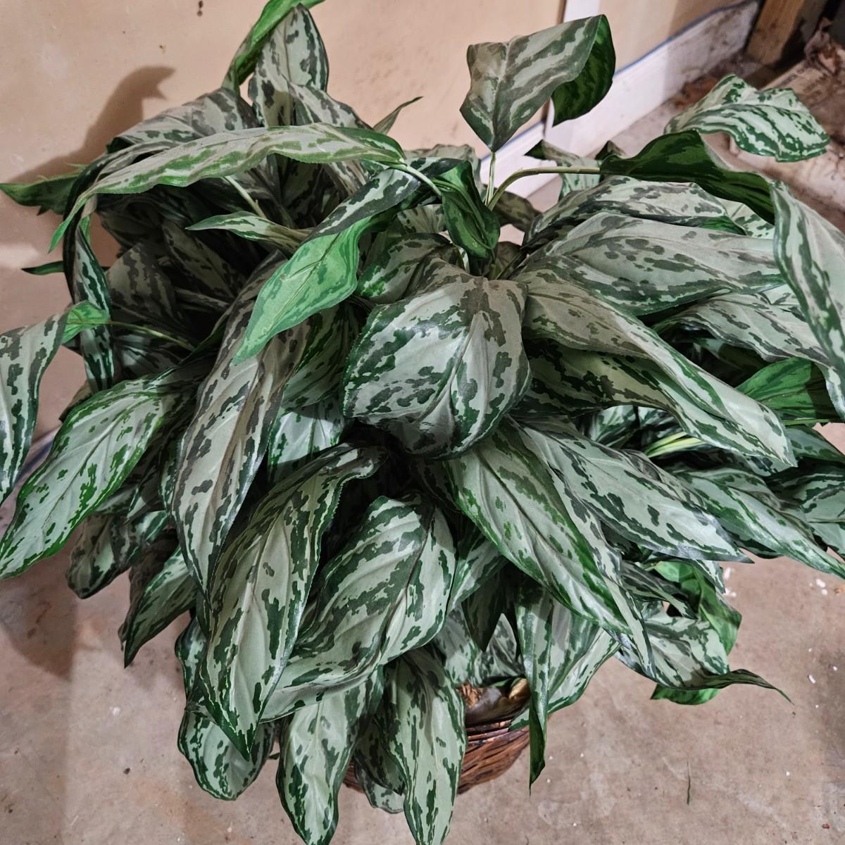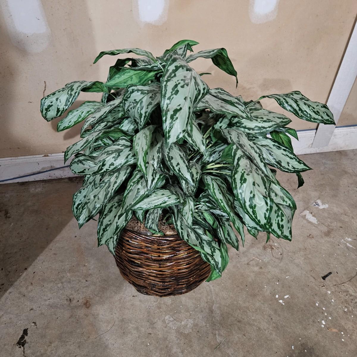 An assortment of five faux tropical plants in woven baskets with moss. The tallest plant measures approximately 24"D x 64"H. Local pickup only