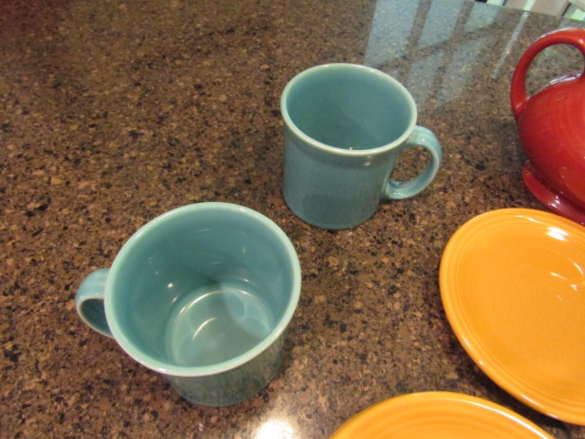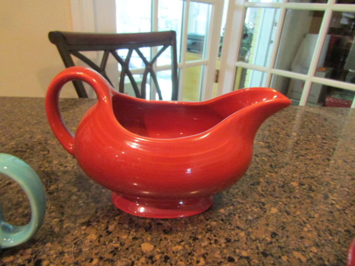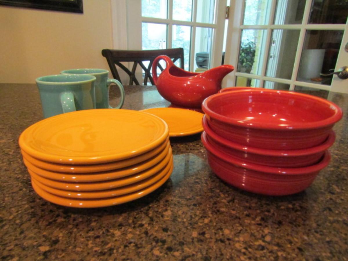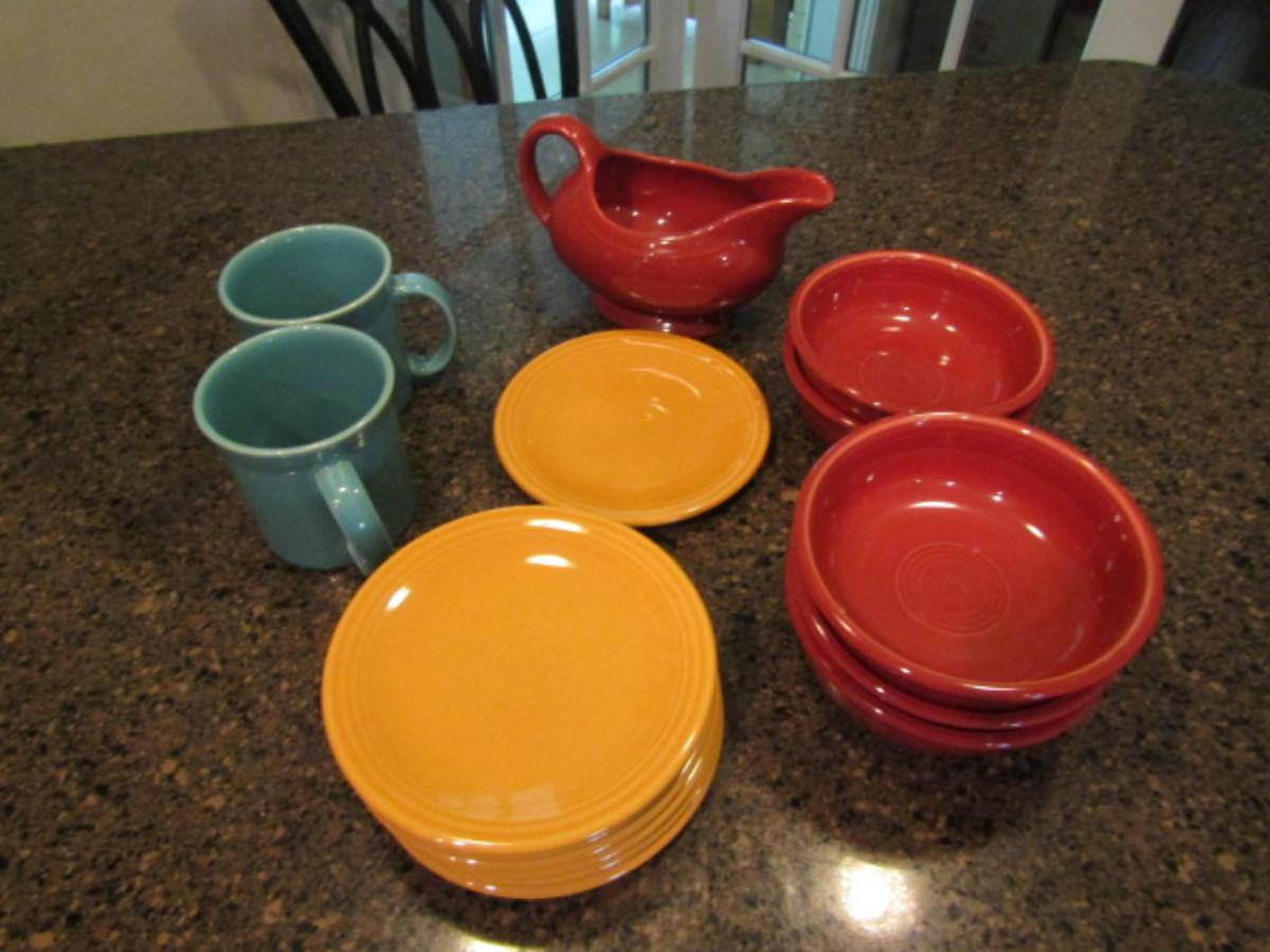 Assortment of Fiesta Dinnerware. Bread plates, berry bowls, gravy boat, and mugs.