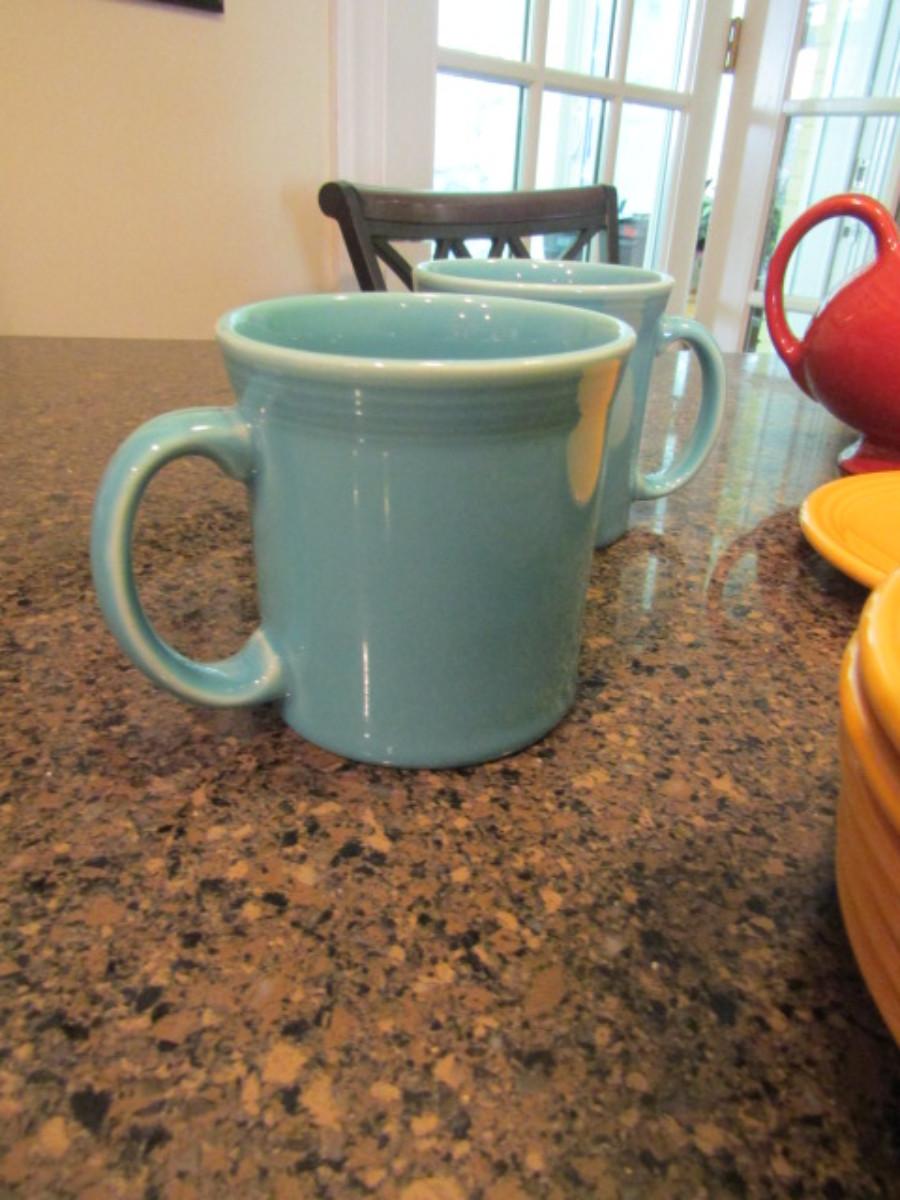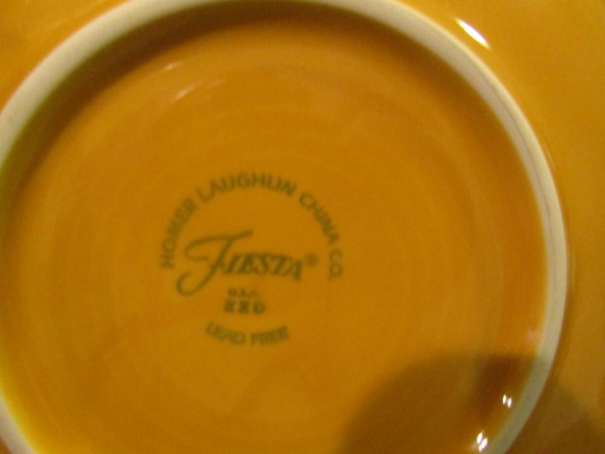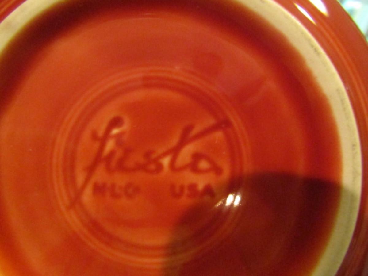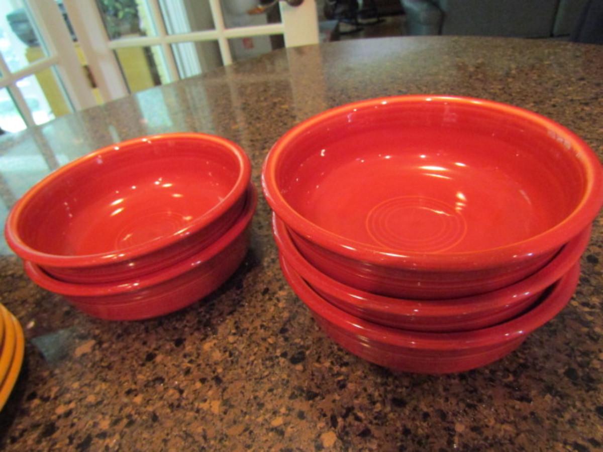 Assortment of Fiesta Dinnerware. Bread plates, berry bowls, gravy boat, and mugs.