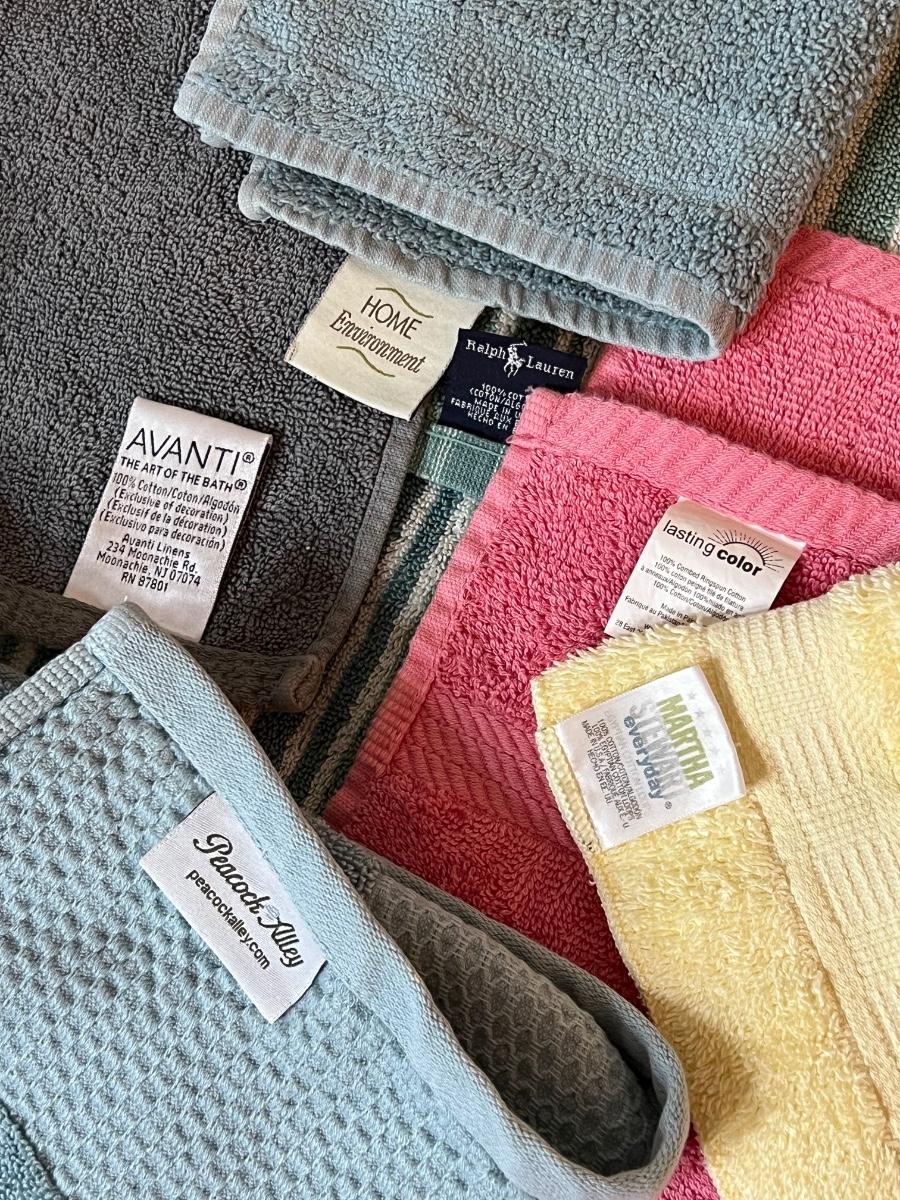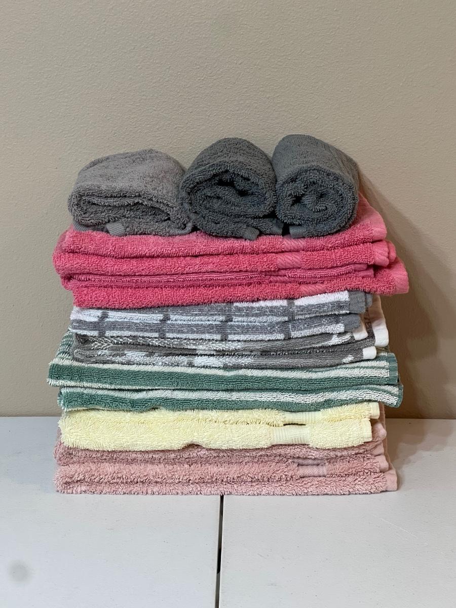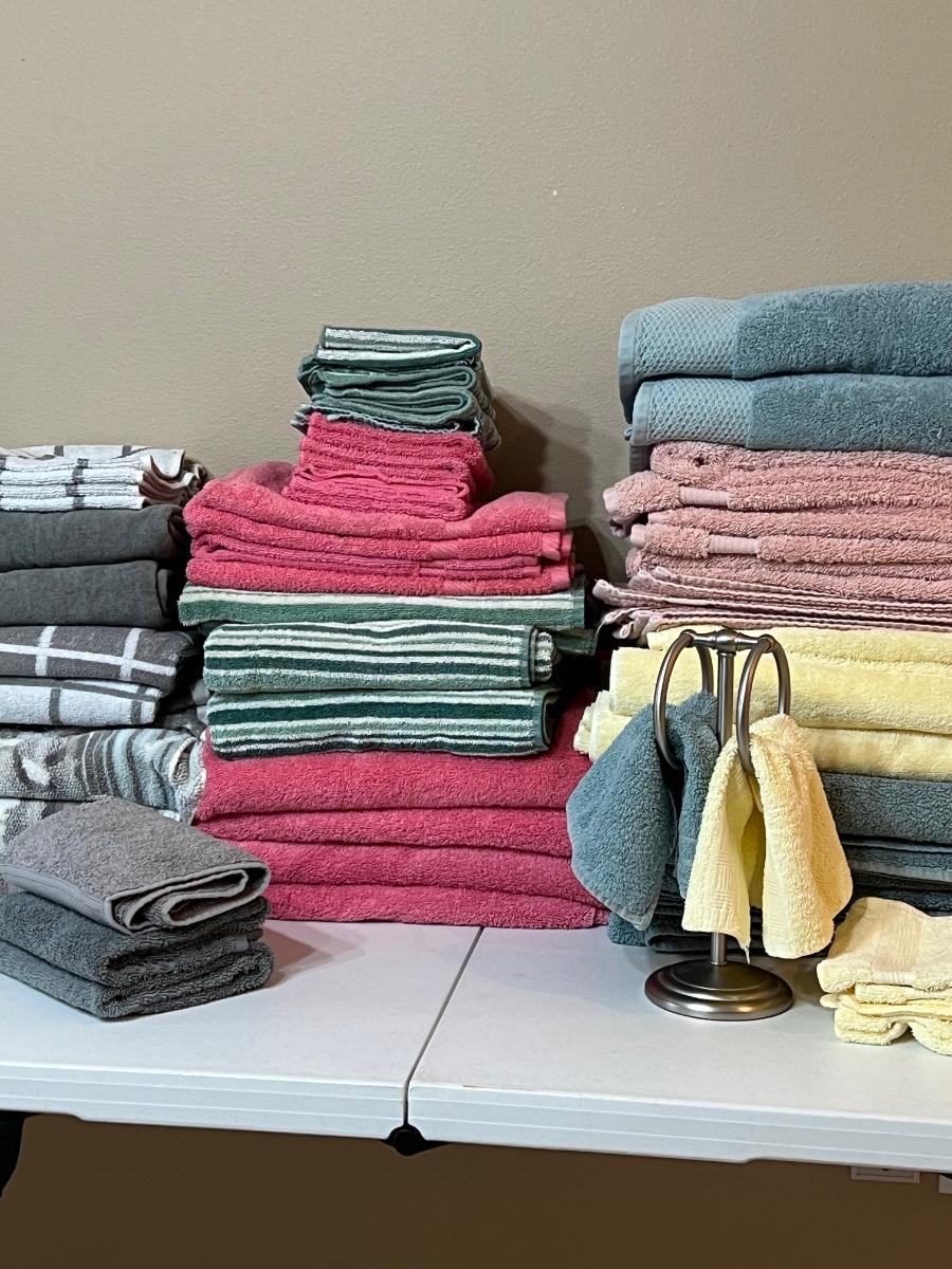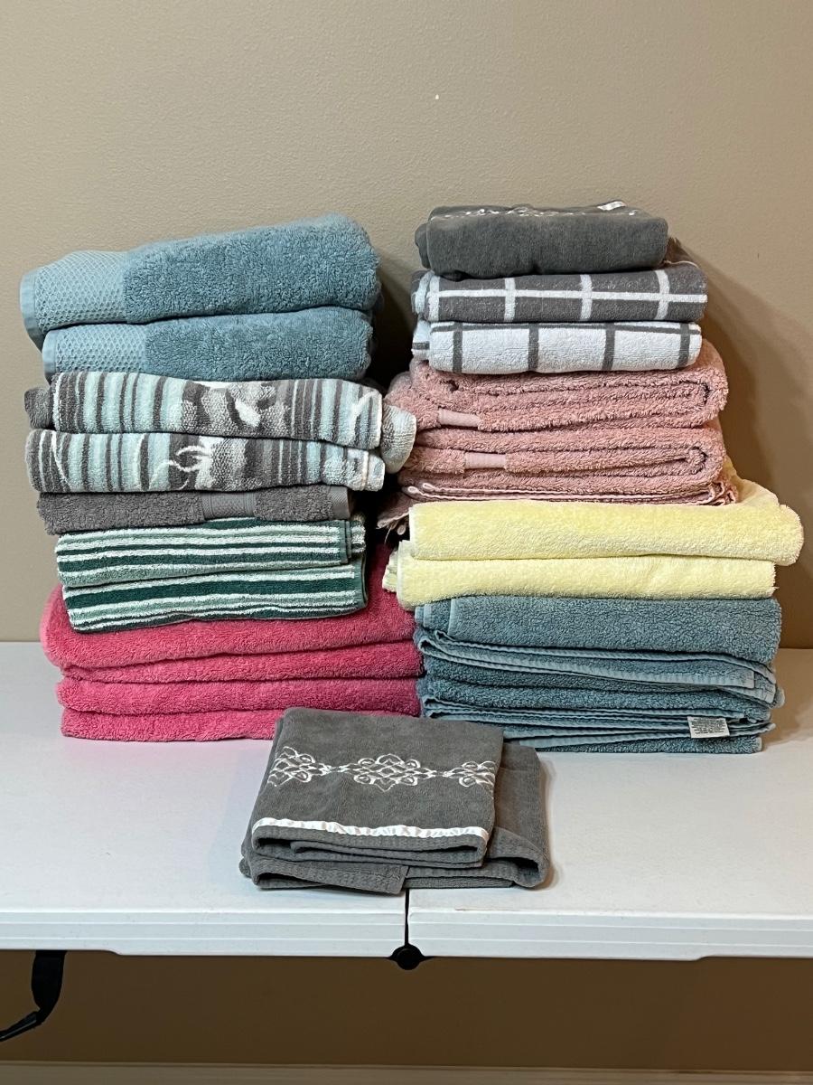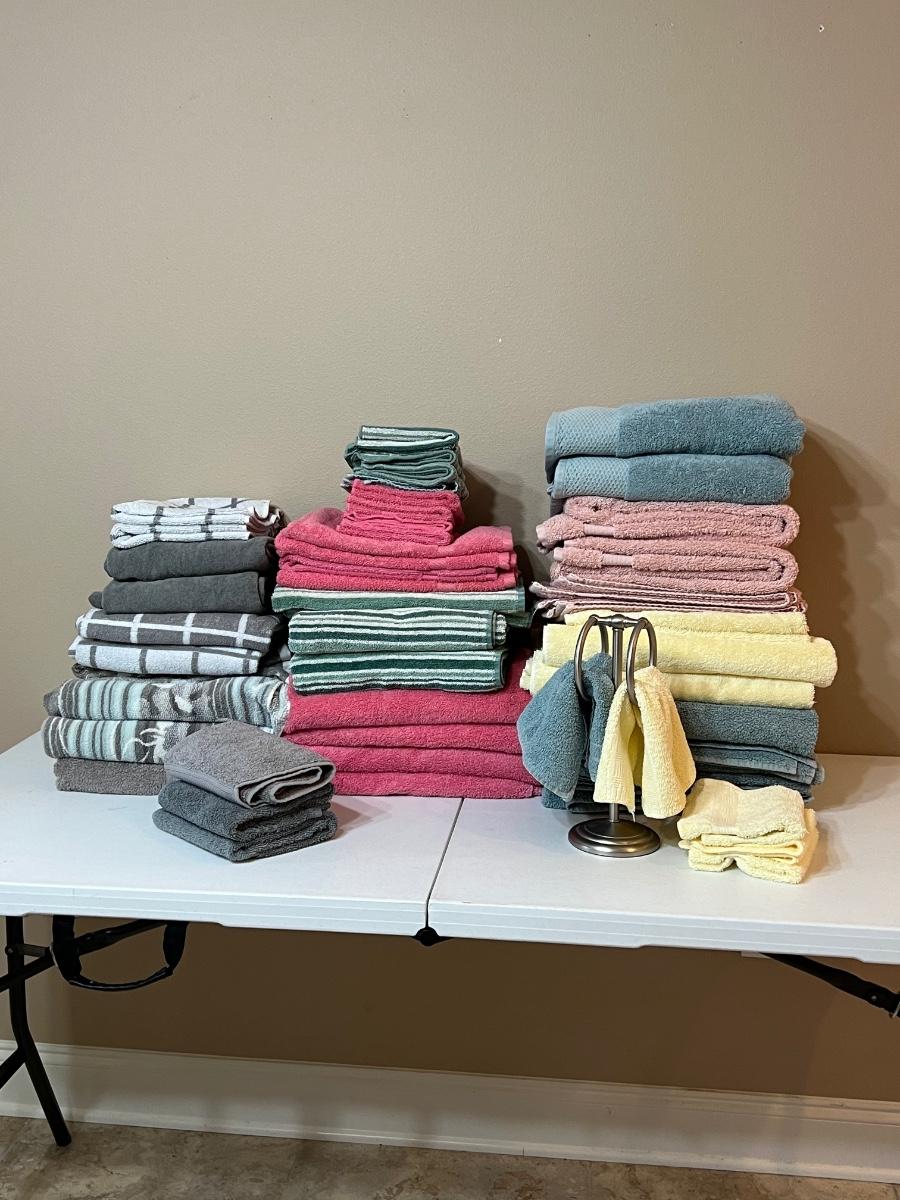 Includes: 23 bath towels, 17 hand towels, 14 face towels, & metal towel holder