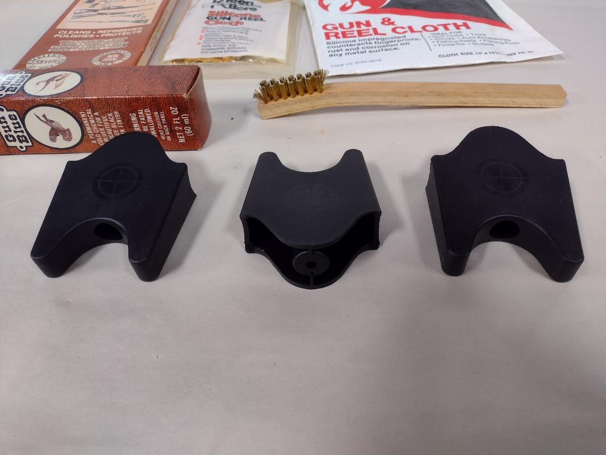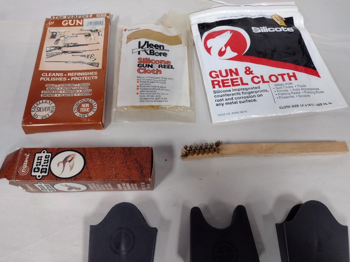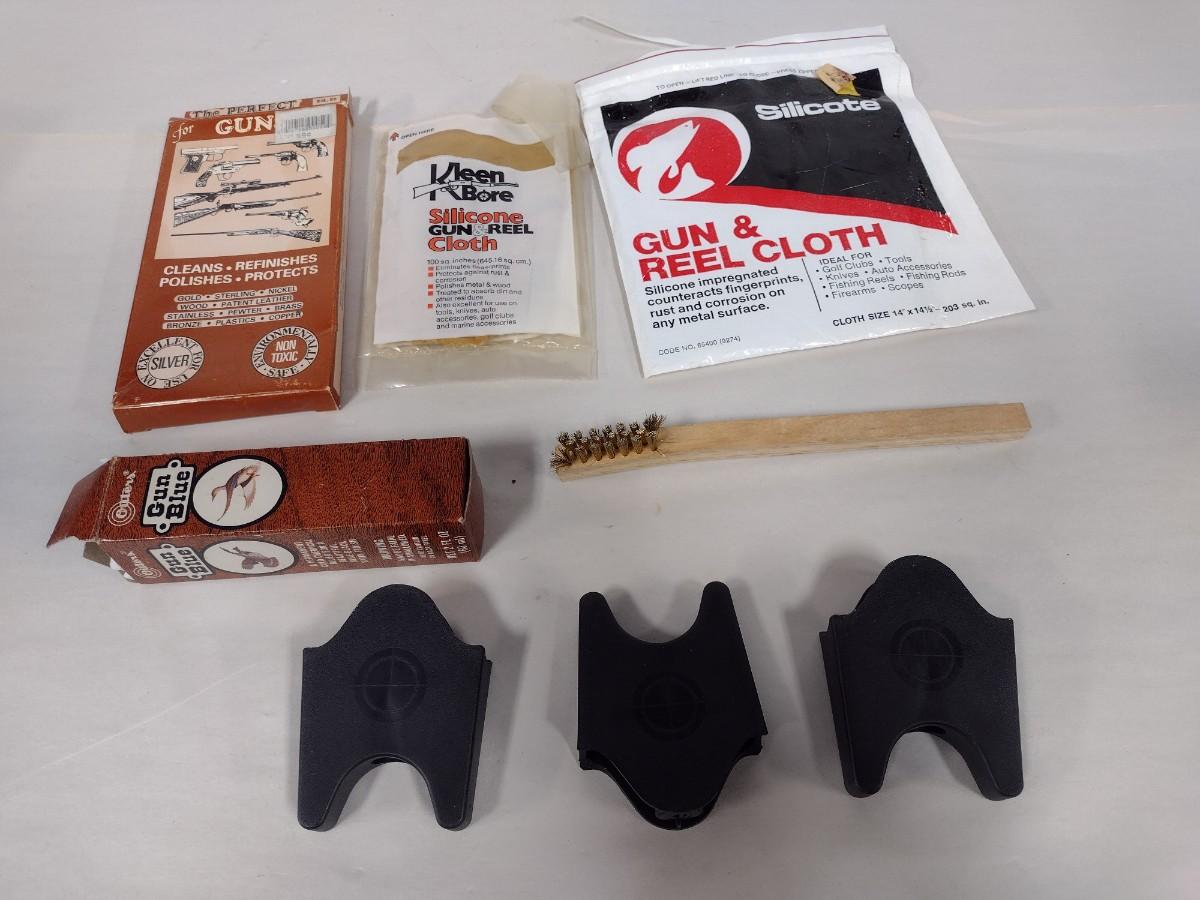 Assortment of Firearm Cleaning Cloths, Polishing and Bluing Rejuvenators, and Gun Stock Rests