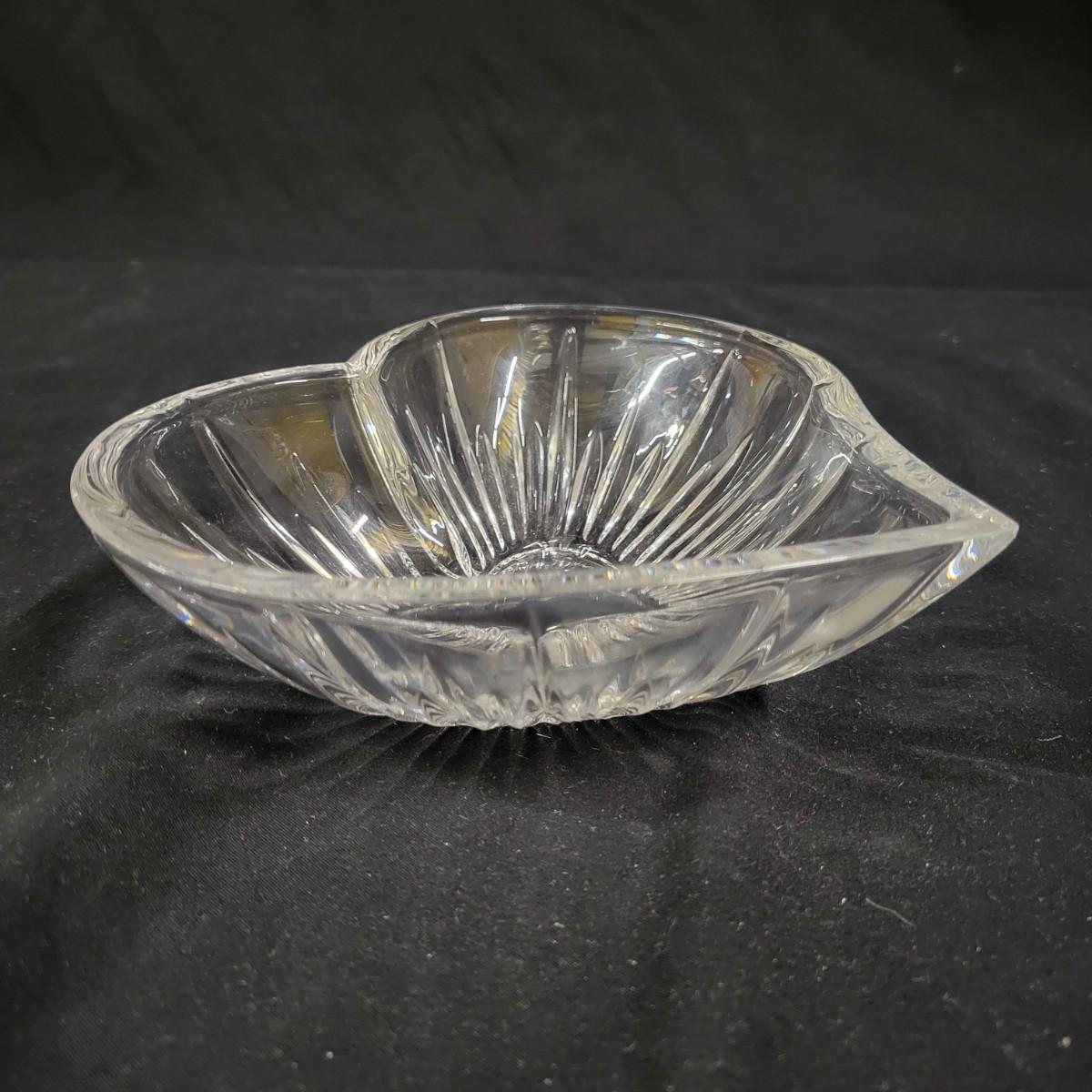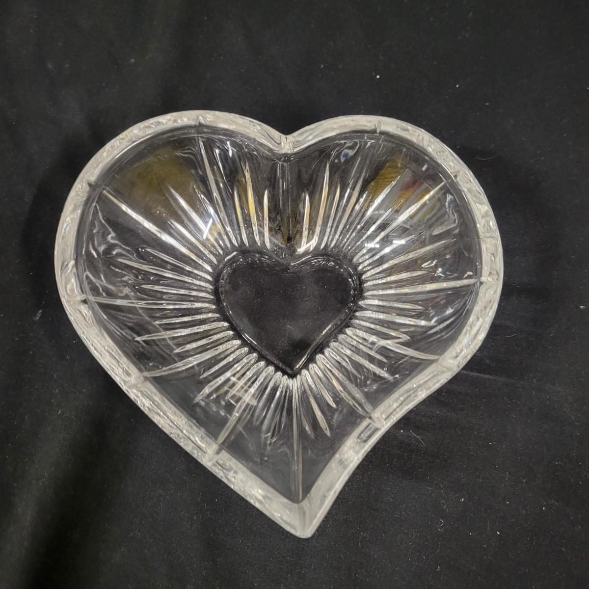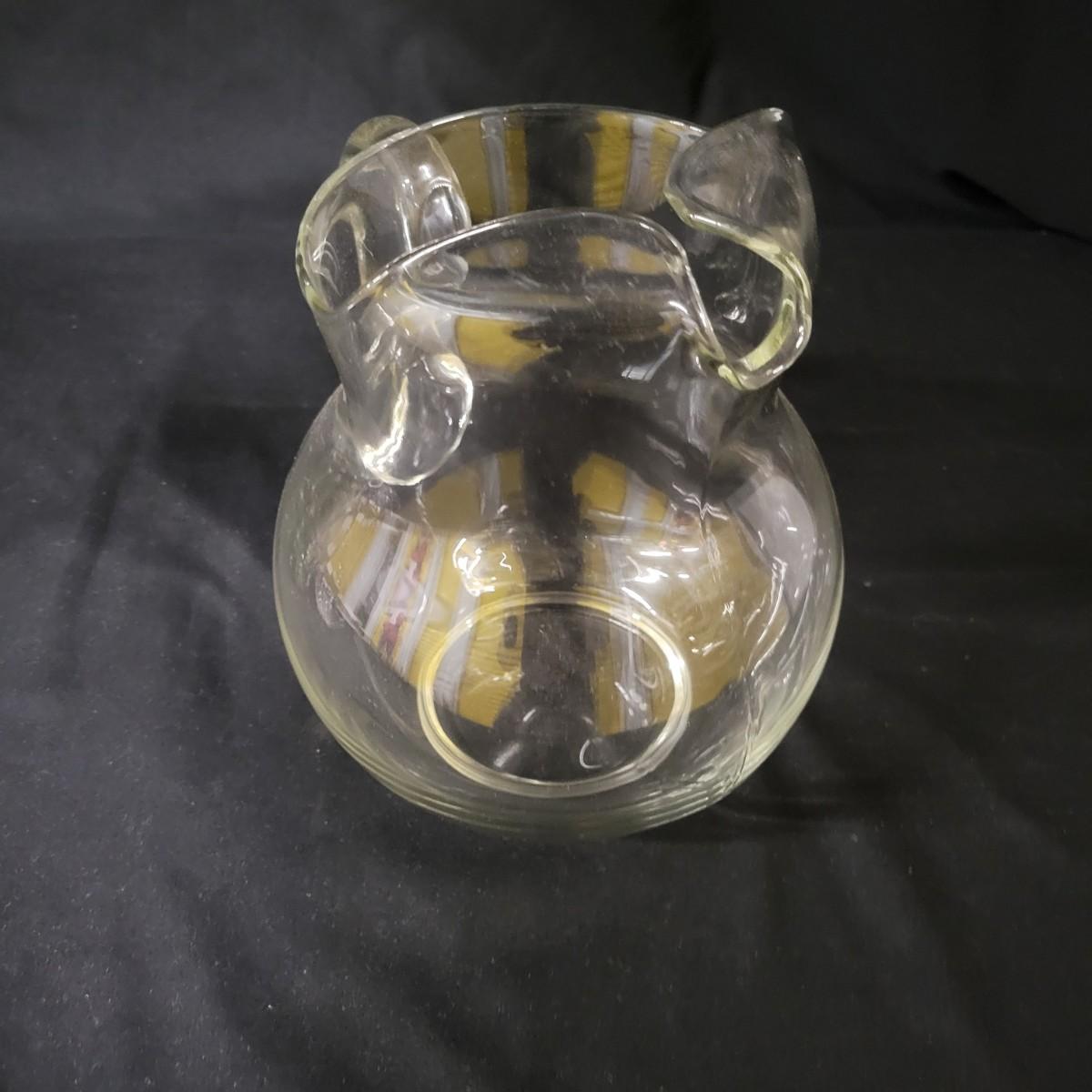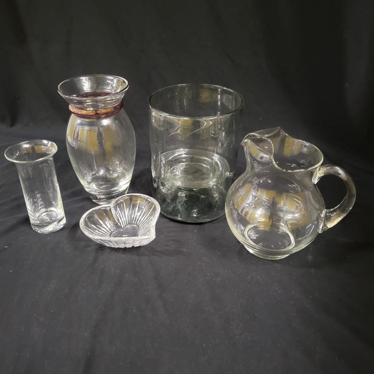 An assortment of five glass pieces in good condition with no notable damage. Lot includes multiple vases, a pitcher, a candle holder and a heart shaped candy dish. Large candle holder measures approximately 7" x 9.5" Shipping available. Shipping can be costly please call UPS store at 828-252-6930 for quote