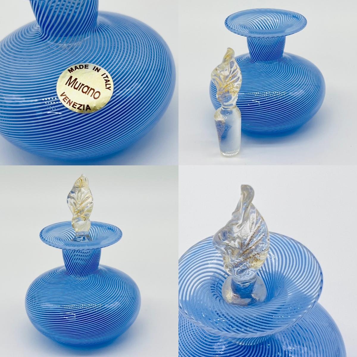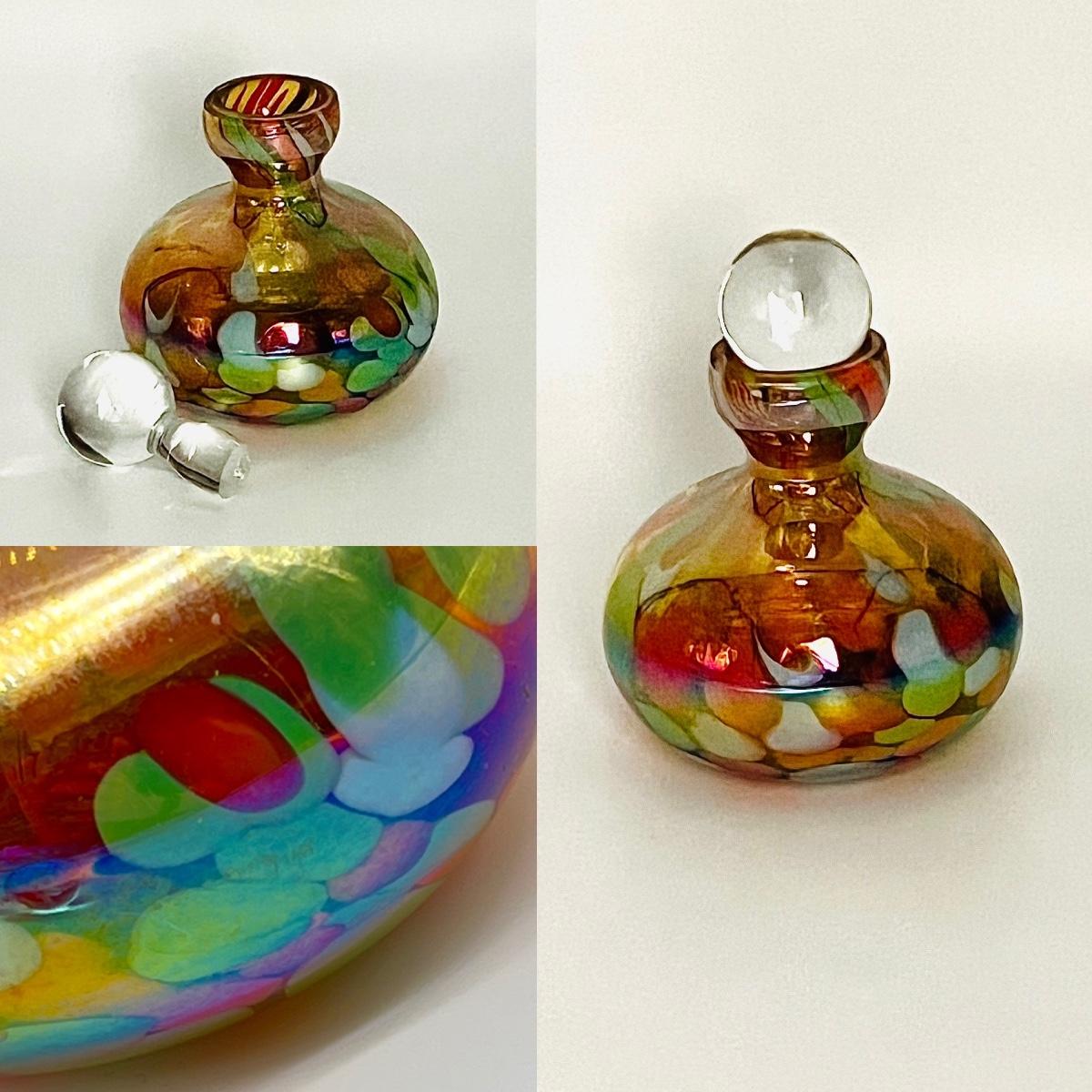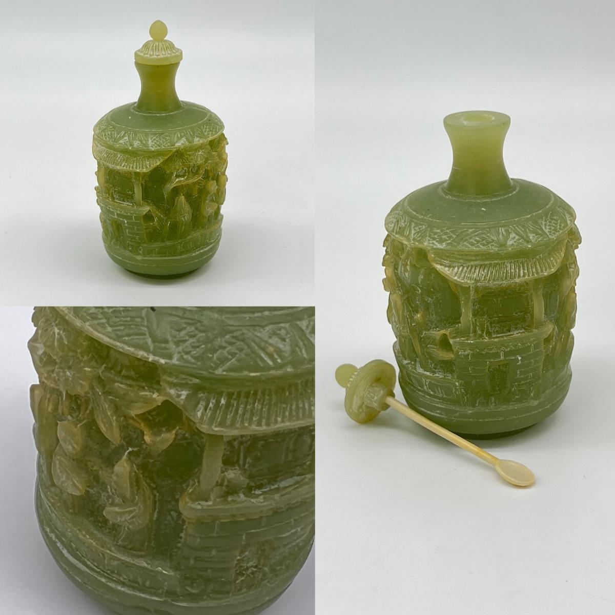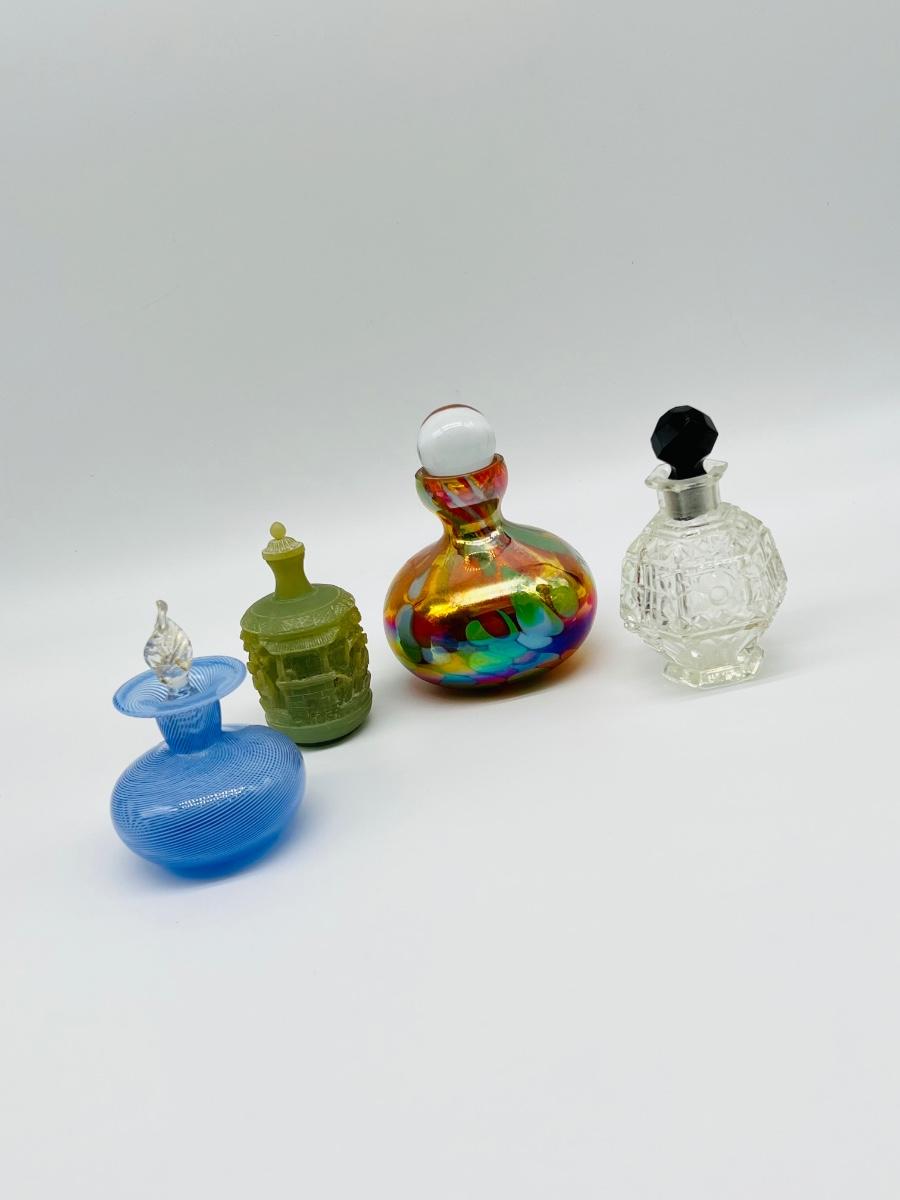 3 of them are made of glass & 1 is made of Jade. The bottles range from the tallest being 4.5 H x 3.5” Round to the smallest being 3.5” H x 2” Round. The only bottle with a name is the blue swirl.